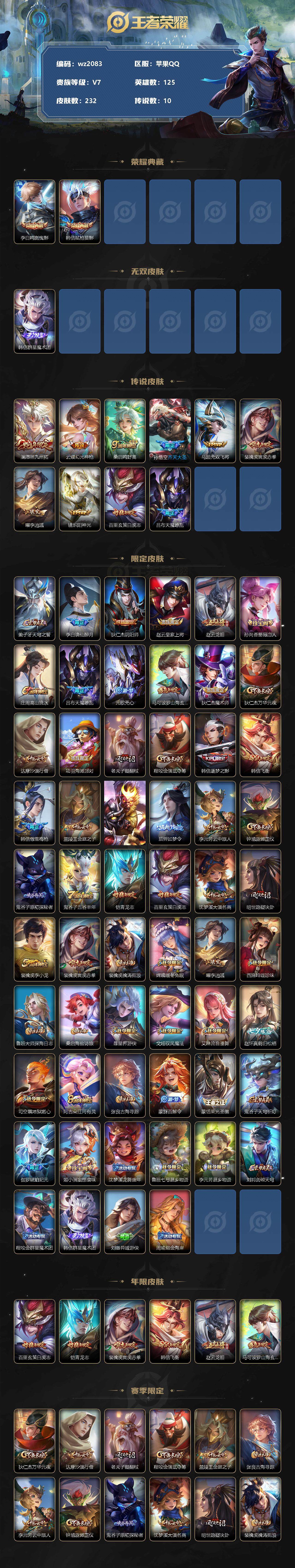 【游戏多多】【王者荣耀】【编号:3338971】【可二次实名】【wz2083】苹果Q-V7-永恒钻石I段位-125英雄-232皮肤-2典藏-0珍品无双-1无双-0珍品传说-10传说-58史诗 【英雄全皮】:韩信全皮,蒙恬全皮 【荣耀典藏】:李白鸣剑曳影,韩信弑枪猎影 【无双皮肤】:韩信群星魔术团 【传说皮肤】:澜愿照九州拓,云缨幻光神枪,桑启鸣野蒿,孙悟空齐天大圣,马超无双飞将,裴擒虎寅虎赤拳,曜李逍遥 ,镜炽阳神光,百里玄策白虎志,吕布天魔缭乱 【限定皮肤】:姜子牙天穹之誓,李白谪仙醉月,狄仁杰阴阳师,赵云皇家上将,赵云龙胆,孙尚香蔷薇恋人,庄周高山流水,吕布天魔缭乱,元歌无心,马可波罗山海玄木吟,狄仁杰魔术师,狄仁杰万华元夜,达摩沙漠行僧,项羽海滩派对,老夫子醍醐杖,程咬金演武夺筹,韩信逐梦之影,韩信飞衡,韩信傲雪梅枪,兰陵王金庭之子,孙悟空齐天大圣,后羿如梦令,李元芳云中旅人,钟馗驱傩正仪,鬼谷子原初探秘者,鬼谷子五谷丰年,铠青龙志,百里玄策白虎志,沈梦溪大漠名商,明世隐疑决卦,裴擒虎李小龙,裴擒虎寅虎赤拳,裴擒虎擒涛扼浪,嫦娥暖冬兔眠,曜李逍遥 ,西施玲珑珍味,鲁班大师探海日志,桑启海盐诗旅,暃星界游侠,戈娅驭风魔法,艾琳流音漫舞,赵怀真鹤归松栖,司空震地狱燃心,阿古朵江河有灵,张良古海寻踪,蒙犽百解令,蒙恬荣光圣徽,鬼谷子天穹祈灯,伽罗琥珀纪元,姬小满妄想食味,沈梦溪龙舞盛年,鲁班七号蔬乡物语,李元芳蔬乡物语,刘邦剑破天穹,程咬金群星魔术团,韩信群星魔术团,刘备异域游侠,周瑜熔金海岸 【年限皮肤】:百里玄策白虎志,铠青龙志,裴擒虎寅虎赤拳,韩信飞衡,赵云龙胆,马可波罗山海玄木吟 【赛季限定】:狄仁杰万华元夜,达摩沙漠行僧,老夫子醍醐杖,程咬金演武夺筹,兰陵王金庭之子,张良古海寻踪,李元芳云中旅人,钟馗驱傩正仪,鬼谷子原初探秘者,沈梦溪大漠名商,明世隐疑决卦,裴擒虎擒涛扼浪,鲁班大师探海日志,桑启海盐诗旅,鬼谷子天穹祈灯,蒙恬荣光圣徽,刘邦剑破天穹,姜子牙天穹之誓 【战令限定】:艾琳流音漫舞,嫦娥暖冬兔眠,西施玲珑珍味,司空震地狱燃心,暃星界游侠,戈娅驭风魔法,鲁班七号蔬乡物语,李元芳蔬乡物语 【史诗皮肤】:赵云皇家上将,赵云未来纪元,貂蝉圣诞恋歌,甄姬冰雪圆舞曲,王昭君偶像歌手,狄仁杰魔术师,廉颇地狱岩魂,宫本武藏鬼剑武藏,孙尚香蔷薇恋人,孙尚香水果甜心,嬴政摇滚巨星,墨子金属风暴,刘禅绅士熊喵,曹操幽灵船长,李白千年之狐,吕布末日机甲,韩信白龙吟,花木兰水晶猎龙者,韩信逐梦之影,夏侯惇乘风破浪,兰陵王暗隐猎兽者,诸葛亮黄金分割率,雅典娜冰冠公主,铠曙光守护者,李元芳逐浪之夏,白起星夜王子,阿轲节奏热浪,铠青龙志,狄仁杰鹰眼统帅,娜可露露晚萤,韩信飞衡,后羿如梦令,赵云龙胆,孙尚香时之恋人,裴擒虎李小龙,庄周高山流水,韩信傲雪梅枪,澜赏金猎手,鬼谷子五谷丰年,元歌无心,暃星界游侠,马可波罗山海玄木吟,戈娅驭风魔法,百里守约真我赫兹,赵怀真鹤归松栖,司空震地狱燃心,阿古朵江河有灵,蒙犽百解令,蒙恬荣光圣徽,伽罗琥珀纪元,姬小满妄想食味,鲁班七号蔬乡物语,李白谪仙醉月,艾琳陌上桑,牛魔星界战将,狂铁龙之律动,后羿石田雨龙,周瑜百相守梦 【其他皮肤】:项羽海滩派对,韩信教廷特使,韩信街头霸王,阿轲爱心护理,赵云白执事,赵云忍炎影,芈月红桃皇后,白起白色死神,牛魔西部大镖客,扁鹊化身博士,扁鹊救世之瞳,妲己少女阿狸,典韦黄金武士,亚瑟死亡骑士,达摩拳王,花木兰兔女郎,张飞五福同心,甄姬花好人间,宫本武藏万象初新,后羿阿尔法小队,狄仁杰阴阳师,刘备纽约教父,刘备汉昭烈帝,关羽龙腾万里,钟无艳海滩丽影,王昭君幻想奇妙夜,老夫子功夫老勺,孙尚香沉稳之力,诸葛亮掌控之力,李白敏锐之力,鬼谷子幻乐之宴,明世隐虹云星官,小乔丁香结,吕布野性能量,孙膑归虚梦演,沈梦溪鲨炮海盗猫,姜子牙炽热元素使,哪吒次元突破,明世隐疑决卦,盾山圆桌骑士,老夫子醍醐杖,狂铁特工战影,鬼谷子原初探秘者,狄仁杰万华元夜,刘禅秘密基地,露娜瓷语鉴心,程咬金演武夺筹,张良缤纷绘卷,钟馗驱傩正仪,鲁班大师乓乓大师,达摩沙漠行僧,程咬金无双福将,兰陵王金庭之子,沈梦溪大漠名商,蒙恬蔚蓝守将,李元芳云中旅人,桑启海盐诗旅,嫦娥暖冬兔眠,海月幻泉雾影,猪八戒潮玩探月行,白起乐园追猎者,赵怀真太极少年,裴擒虎擒涛扼浪,太乙真人劲辣红锅,莱西奥西部游侠,鲁班大师探海日志,西施玲珑珍味,姬小满零食大作战,李元芳妄想特派,艾琳流音漫舞,张良古海寻踪,钟无艳聚星闪耀,亚连破局者,曹操决胜大满贯,后羿完美运算,鬼谷子天穹祈灯,嫦娥漠中幻影,朵莉亚金色潮汐,廉颇功夫炙烤,亚瑟鸿运当头,沈梦溪龙舞盛年,李元芳蔬乡物语,刘邦剑破天穹,程咬金群星魔术团,大司命暗都幽影,刘备异域游侠,姜子牙天穹之誓,周瑜熔金海岸,东皇太一噬灭天穹,苍苍林狼骑,太乙真
