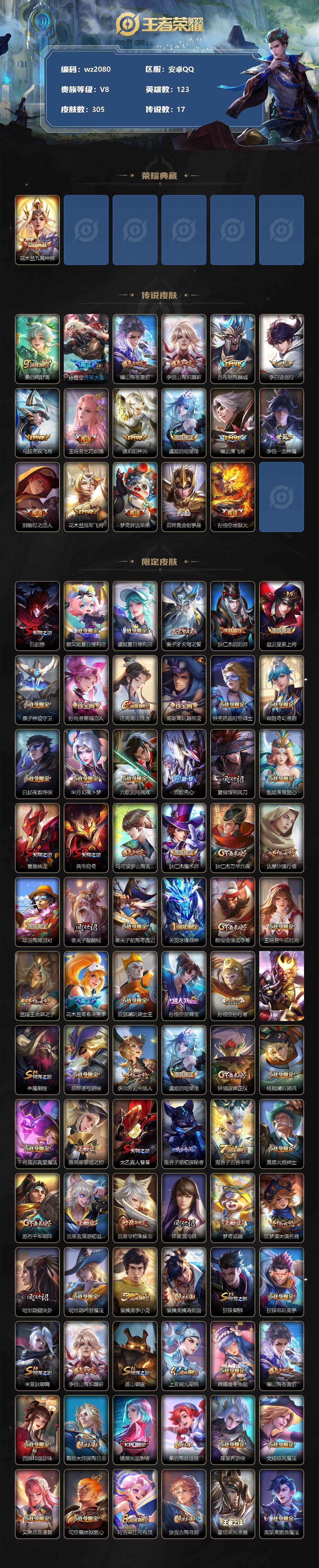 【游戏多多】【王者荣耀】【编号:3338972】【可二次实名】【wz2080】安卓Q-V8-最强王者段位-123英雄-305皮肤-1典藏-0珍品无双-0无双-0珍品传说-17传说-92史诗 【英雄全皮】:鬼谷子全皮,狂铁全皮,李信全皮,蒙恬全皮,戈娅全皮 【荣耀典藏】:花木兰九霄神辉 【传说皮肤】:桑启鸣野蒿,孙悟空齐天大圣,曜山海苍雷引,李信山海炽霜斩,吕布怒海麟威,李白诗剑行,马超无双飞将,王昭君乞巧织情,镜炽阳神光,虞姬启明星使,曜云鹰飞将,李信一念神魔,刘备时之恋人,花木兰冠军飞将,梦奇胖达荣荣,后羿黄金射手座,孙悟空地狱火 【限定皮肤】:白起狰,蔡文姬夏日便利店,虞姬夏日便利店,姜子牙天穹之誓,狄仁杰阴阳师,赵云皇家上将,墨子神迹守卫,孙尚香蔷薇恋人,庄周高山流水,高渐离玩趣恶龙,钟无艳超时空战士,扁鹊奇幻香踪,白起夜都怪侠,芈月幻夜卜梦,元歌云间偶戏,元歌无心,夏侯惇朔风刀,甄姬落雪兰心,曹操烛龙,典韦穷奇,马可波罗山海玄木吟,狄仁杰魔术师,狄仁杰万华元夜,达摩沙漠行僧,项羽海滩派对,老夫子醍醐杖,老夫子航海奇遇记,关羽冰锋战神,程咬金演武夺筹,王昭君午后时光,兰陵王金庭之子,花木兰青春决赛季,亚瑟潮玩骑士王,孙悟空至尊宝,孙悟空孙行者,孙悟空齐天大圣,牛魔御旌,后羿圣弓游侠,李元芳云中旅人,虞姬启明星使,钟馗驱傩正仪,杨戬潮玩骑兵,干将莫邪真爱魔法,雅典娜黎明之约,太乙真人饕餮,鬼谷子原初探秘者,鬼谷子五谷丰年,黄忠火炮绅士,苏烈千军破阵,百里玄策原初追逐者,百里守约朱雀志,弈星混沌棋,梦奇顽趣,沈梦溪大漠名商,明世隐疑决卦,明世隐吟游魔法,裴擒虎李小龙,裴擒虎擒涛扼浪,狂铁御狮,狂铁电玩高手,米莱狄御霄,李信山海炽霜斩,盾山御銮,上官婉儿梁祝,嫦娥暖冬兔眠,曜山海苍雷引,西施玲珑珍味,鲁班大师探海日志,镜匿光追影者,桑启海盐诗旅,暃星界游侠,戈娅驭风魔法,艾琳流音漫舞,司空震地狱燃心,阿古朵江河有灵,张良古海寻踪,蒙恬荣光圣徽,高渐离燃音魔法,妲己灵卜魔法,鬼谷子天穹祈灯,伽罗琥珀纪元,沈梦溪龙舞盛年,鲁班七号蔬乡物语,李元芳蔬乡物语,刘邦剑破天穹,周瑜熔金海岸 【年限皮肤】:百里守约朱雀志,马可波罗山海玄木吟,李信山海炽霜斩,曜山海苍雷引 【赛季限定】:白起狰,夏侯惇朔风刀,曹操烛龙,典韦穷奇,狄仁杰万华元夜,达摩沙漠行僧,老夫子醍醐杖,程咬金演武夺筹,兰陵王金庭之子,张良古海寻踪,牛魔御旌,李元芳云中旅人,钟馗驱傩正仪,雅典娜黎明之约,太乙真人饕餮,鬼谷子原初探秘者,苏烈千军破阵,百里玄策原初追逐者,弈星混沌棋,梦奇顽趣,沈梦溪大漠名商,明世隐疑决卦,裴擒虎擒涛扼浪,狂铁御狮,米莱狄御霄,盾山御銮,鲁班大师探海日志,桑启海盐诗旅,鬼谷子天穹祈灯,蒙恬荣光圣徽,刘邦剑破天穹,姜子牙天穹之誓 【战令限定】:墨子神迹守卫,蔡文姬夏日便利店,虞姬夏日便利店,钟无艳超时空战士,扁鹊奇幻香踪,白起夜都怪侠,芈月幻夜卜梦,元歌云间偶戏,甄姬落雪兰心,老夫子航海奇遇记,王昭君午后时光,艾琳流音漫舞,亚瑟潮玩骑士王,后羿圣弓游侠,杨戬潮玩骑兵,干将莫邪真爱魔法,黄忠火炮绅士,明世隐吟游魔法,狂铁电玩高手,嫦娥暖冬兔眠,西施玲珑珍味,司空震地狱燃心,暃星界游侠,戈娅驭风魔法,高渐离燃音魔法,妲己灵卜魔法,鲁班七号蔬乡物语,李元芳蔬乡物语 【史诗皮肤】:鲁班七号电玩小子,项羽苍穹之光,露娜紫霞仙子,阿轲暗夜猫娘,赵云皇家上将,赵云未来纪元,貂蝉圣诞恋歌,甄姬冰雪圆舞曲,王昭君偶像歌手,狄仁杰魔术师,廉颇地狱岩魂,宫本武藏鬼剑武藏,孙尚香蔷薇恋人,孙尚香水果甜心,嬴政暗夜贵公子,嬴政摇滚巨星,妲己魅力维加斯,妲己女仆咖啡,墨子龙骑士,墨子金属风暴,吕布圣诞狂欢,刘禅绅士熊喵,曹操幽灵船长,李白千年之狐,吕布末日机甲,张飞乱世虎臣,关羽冰锋战神,孙悟空至尊宝,花木兰水晶猎龙者,刘邦德古拉伯爵,小乔缤纷独角兽,兰陵王暗隐猎兽者,诸葛亮黄金分割率,亚瑟心灵战警,雅典娜冰冠公主,安琪拉心灵骇客,花木兰青春决赛季,百里守约特工魅影,铠曙光守护者,蔡文姬舞动绿茵,刘禅天才门将,李元芳逐浪之夏,程咬金功夫厨神,白起星夜王子,阿轲节奏热浪,孙策猫狗日记,大乔猫狗日记,百里守约朱雀志,狄仁杰鹰眼统帅,上官婉儿梁祝,小乔青蛇,不知火舞魅语,橘右京修罗,百里玄策原初追逐者,裴擒虎李小龙,元歌云间偶戏,老夫子航海奇遇记,干将莫邪真爱魔法,沈梦溪月团寄思,孙悟空孙行者,庄周高山流水,镜匿光追影者,黄忠火炮绅士,雅典娜黎明之约,澜赏金猎手,明世隐吟游魔法,狂铁电玩高手,钟无艳超时空战士,鬼谷子五谷丰年,元歌无心,梦奇顽趣,暃星界游侠,马可波罗山海玄木吟,扁鹊奇幻香踪,刘禅电玩爆裂旋风,戈娅驭风魔法,镜真我赫兹,司空震地狱燃心,阿古朵江河有灵,妲己灵卜魔法,高渐离燃音魔法,蒙恬荣光圣徽,伽罗琥珀纪元,鲁班七号蔬乡物语
