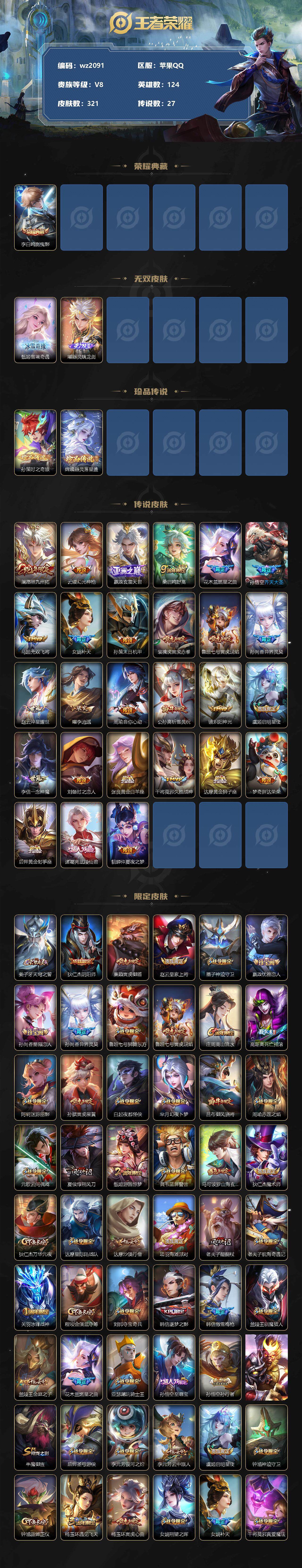 【游戏多多】【王者荣耀】【编号:3338982】【可二次实名】【wz2091】苹果Q-V8-至尊星耀V段位-124英雄-321皮肤-1典藏-0珍品无双-2无双-2珍品传说-27传说-108史诗 【英雄全皮】:蒙恬全皮 【荣耀典藏】:李白鸣剑曳影 【无双皮肤】:甄姬雪境奇遇,曜器灵螭龙剑 【珍品传说】:孙策时之奇旅,嫦娥器灵落星盏 【传说皮肤】:澜愿照九州拓,云缨幻光神枪,嬴政玄雷天君,桑启鸣野蒿,花木兰燃星之曲,孙悟空齐天大圣,马超无双飞将,女娲补天,孙策末日机甲,裴擒虎寅虎赤拳,鲁班七号寅虎瑞焰,孙尚香异界灵契,赵云淬星耀世,曜李逍遥 ,周瑜音你心动,公孙离祈雪灵祝,镜炽阳神光,虞姬启明星使,李信一念神魔,刘备时之恋人,张良黄金白羊座,干将莫邪久胜战神,达摩黄金狮子座,梦奇胖达荣荣,后羿黄金射手座,诸葛亮武陵仙君,貂蝉仲夏夜之梦 【限定皮肤】:姜子牙天穹之誓,狄仁杰阴阳师,廉颇寅虎御盾,赵云皇家上将,墨子神迹守卫,嬴政优雅恋人,孙尚香蔷薇恋人,孙尚香异界灵契,鲁班七号狮舞东方,鲁班七号寅虎瑞焰,庄周高山流水,高渐离死亡摇滚,阿轲迷踪丽影,孙膑寅虎展翼,白起夜都怪侠,芈月幻夜卜梦,吕布御风骁将,周瑜赤莲之焰,元歌云间偶戏,夏侯惇朔风刀,甄姬游园惊梦,典韦蓝屏警告,马可波罗山海玄木吟,狄仁杰魔术师,狄仁杰万华元夜,达摩星际陆战队,达摩沙漠行僧,项羽海滩派对,老夫子醍醐杖,老夫子航海奇遇记,关羽冰锋战神,程咬金演武夺筹,刘邦夺宝奇兵,韩信逐梦之影,韩信傲雪梅枪,兰陵王驯魔猎人,兰陵王金庭之子,花木兰燃星之曲,亚瑟潮玩骑士王,孙悟空至尊宝,孙悟空孙行者,孙悟空齐天大圣,牛魔御旌,后羿圣弓游侠,李元芳银河之约,李元芳云中旅人,虞姬启明星使,钟馗神迹守卫,钟馗驱傩正仪,杨玉环遇见飞天,杨玉环寅虎心曲,女娲朔望之晖,女娲补天,干将莫邪真爱魔法,雅典娜单词大作战,雅典娜黎明之约,蔡文姬繁星吟游,鬼谷子原初探秘者,鬼谷子五谷丰年,诸葛亮武陵仙君,黄忠烈魂,黄忠火炮绅士,铠青龙志,苏烈千军破阵,百里玄策原初追逐者,弈星混沌棋,梦奇顽趣,公孙离祈雪灵祝,公孙离玉兔公主,沈梦溪星空之诺,沈梦溪大漠名商,明世隐疑决卦,明世隐吟游魔法,裴擒虎天狼狩猎者,裴擒虎李小龙,裴擒虎寅虎赤拳,裴擒虎擒涛扼浪,狂铁御狮,米莱狄御霄,米莱狄胡桃异想国,云中君纤云弄巧,伽罗天狼溯光者,盾山御銮,上官婉儿梁祝,嫦娥拒霜思,嫦娥暖冬兔眠,曜李逍遥 ,西施玲珑珍味,蒙犽狂想玩偶喵,鲁班大师探海日志,镜匿光追影者,桑启海盐诗旅,暃星界游侠,戈娅驭风魔法,艾琳女武神,阿古朵江河有灵,张良古海寻踪,蒙恬荣光圣徽,鬼谷子天穹祈灯,刘邦剑破天穹,芈月浮光幕影,周瑜熔金海岸 【年限皮肤】:铠青龙志,裴擒虎寅虎赤拳,孙膑寅虎展翼,鲁班七号寅虎瑞焰,杨玉环寅虎心曲,廉颇寅虎御盾,公孙离祈雪灵祝,吕布御风骁将,马超神威,黄忠烈魂,马可波罗山海玄木吟 【赛季限定】:夏侯惇朔风刀,狄仁杰万华元夜,达摩沙漠行僧,老夫子醍醐杖,程咬金演武夺筹,兰陵王金庭之子,张良古海寻踪,牛魔御旌,李元芳云中旅人,钟馗驱傩正仪,雅典娜黎明之约,鬼谷子原初探秘者,苏烈千军破阵,百里玄策原初追逐者,弈星混沌棋,梦奇顽趣,沈梦溪大漠名商,明世隐疑决卦,裴擒虎擒涛扼浪,狂铁御狮,米莱狄御霄,盾山御銮,鲁班大师探海日志,桑启海盐诗旅,鬼谷子天穹祈灯,蒙恬荣光圣徽,刘邦剑破天穹,姜子牙天穹之誓 【战令限定】:墨子神迹守卫,鲁班七号狮舞东方,阿轲迷踪丽影,白起夜都怪侠,芈月幻夜卜梦,周瑜赤莲之焰,元歌云间偶戏,典韦蓝屏警告,达摩星际陆战队,老夫子航海奇遇记,刘邦夺宝奇兵,兰陵王驯魔猎人,亚瑟潮玩骑士王,后羿圣弓游侠,李元芳银河之约,钟馗神迹守卫,女娲朔望之晖,干将莫邪真爱魔法,雅典娜单词大作战,黄忠火炮绅士,沈梦溪星空之诺,明世隐吟游魔法,米莱狄胡桃异想国,嫦娥暖冬兔眠,西施玲珑珍味,蒙犽狂想玩偶喵,暃星界游侠,戈娅驭风魔法 【史诗皮肤】:鲁班七号电玩小子,露娜紫霞仙子,阿轲暗夜猫娘,赵云皇家上将,赵云未来纪元,貂蝉圣诞恋歌,甄姬冰雪圆舞曲,王昭君偶像歌手,狄仁杰魔术师,廉颇地狱岩魂,宫本武藏鬼剑武藏,孙尚香蔷薇恋人,孙尚香水果甜心,嬴政优雅恋人,嬴政暗夜贵公子,嬴政摇滚巨星,妲己魅力维加斯,妲己女仆咖啡,墨子龙骑士,墨子金属风暴,吕布圣诞狂欢,刘禅绅士熊喵,吕布末日机甲,张飞乱世虎臣,关羽冰锋战神,孙悟空至尊宝,花木兰水晶猎龙者,刘邦德古拉伯爵,韩信逐梦之影,夏侯惇乘风破浪,小乔缤纷独角兽,兰陵王暗隐猎兽者,诸葛亮黄金分割率,甄姬游园惊梦,亚瑟心灵战警,雅典娜冰冠公主,安琪拉心灵骇客,百里守约特工魅影,铠曙光守护者,刘禅天才门将,李元芳逐浪之夏,程咬金功夫厨神,白起星夜王子,阿轲节奏热浪,杨玉环遇见飞天,孙策猫狗日记,大乔猫狗日记,铠青龙志,典韦蓝屏警告,伽罗箭羽风息,裴擒虎天狼狩猎