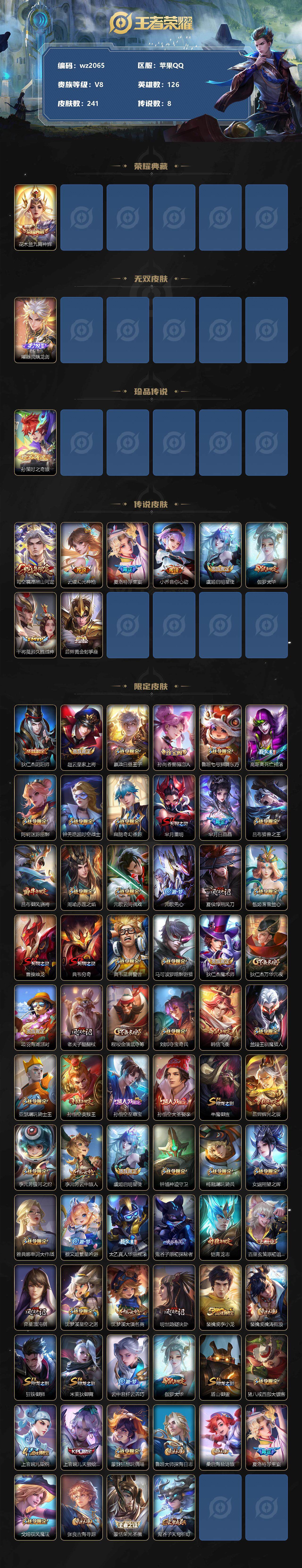 【游戏多多】【王者荣耀】【编号:3338986】【可二次实名】【wz2065】苹果Q-V8-永恒钻石II段位-126英雄-241皮肤-1典藏-0珍品无双-1无双-1珍品传说-8传说-72史诗 【英雄全皮】:蒙恬全皮,戈娅全皮,影全皮 【荣耀典藏】:花木兰九霄神辉 【无双皮肤】:曜器灵螭龙剑 【珍品传说】:孙策时之奇旅 【传说皮肤】:司空震愿照山河定,云缨幻光神枪,夏洛特浮生妄,小乔音你心动,虞姬启明星使,伽罗太华,干将莫邪久胜战神,后羿黄金射手座 【限定皮肤】:狄仁杰阴阳师,赵云皇家上将,嬴政白昼王子,孙尚香蔷薇恋人,鲁班七号狮舞东方,高渐离死亡摇滚,阿轲迷踪丽影,钟无艳超时空战士,扁鹊奇幻香踪,芈月重明,芈月白晶晶,吕布猎兽之王,吕布御风骁将,周瑜赤莲之焰,元歌云间偶戏,元歌无心,夏侯惇朔风刀,甄姬落雪兰心,曹操烛龙,典韦穷奇,典韦蓝屏警告,马可波罗暗影游猎,狄仁杰魔术师,狄仁杰万华元夜,项羽海滩派对,老夫子醍醐杖,程咬金演武夺筹,刘邦夺宝奇兵,韩信飞衡,兰陵王驯魔猎人,亚瑟潮玩骑士王,孙悟空美猴王,孙悟空至尊宝,孙悟空大圣娶亲,牛魔御旌,后羿辉光之辰,李元芳银河之约,李元芳云中旅人,虞姬启明星使,钟馗神迹守卫,杨戬潮玩骑兵,女娲朔望之晖,雅典娜单词大作战,蔡文姬繁星吟游,太乙真人华丽摇滚,鬼谷子原初探秘者,铠青龙志,百里玄策原初追逐者,弈星混沌棋,沈梦溪星空之诺,沈梦溪大漠名商,明世隐疑决卦,裴擒虎李小龙,裴擒虎擒涛扼浪,狂铁御狮,米莱狄御霄,云中君纤云弄巧,伽罗太华,盾山御銮,猪八戒西部大镖客,上官婉儿梁祝,上官婉儿天狼绘梦者,蒙犽狂想玩偶喵,鲁班大师探海日志,桑启海盐诗旅,夏洛特浮生妄,戈娅驭风魔法,张良古海寻踪,蒙恬荣光圣徽,鬼谷子天穹祈灯 【年限皮肤】:铠青龙志,孙悟空美猴王,后羿辉光之辰,吕布御风骁将,伽罗太华,韩信飞衡 【赛季限定】:芈月重明,夏侯惇朔风刀,曹操烛龙,典韦穷奇,狄仁杰万华元夜,老夫子醍醐杖,程咬金演武夺筹,张良古海寻踪,牛魔御旌,李元芳云中旅人,鬼谷子原初探秘者,百里玄策原初追逐者,弈星混沌棋,沈梦溪大漠名商,明世隐疑决卦,裴擒虎擒涛扼浪,狂铁御狮,米莱狄御霄,盾山御銮,鲁班大师探海日志,桑启海盐诗旅,鬼谷子天穹祈灯,蒙恬荣光圣徽 【战令限定】:嬴政白昼王子,鲁班七号狮舞东方,阿轲迷踪丽影,钟无艳超时空战士,扁鹊奇幻香踪,吕布猎兽之王,周瑜赤莲之焰,元歌云间偶戏,甄姬落雪兰心,典韦蓝屏警告,马可波罗暗影游猎,刘邦夺宝奇兵,兰陵王驯魔猎人,亚瑟潮玩骑士王,李元芳银河之约,钟馗神迹守卫,杨戬潮玩骑兵,女娲朔望之晖,雅典娜单词大作战,沈梦溪星空之诺,猪八戒西部大镖客,蒙犽狂想玩偶喵,戈娅驭风魔法 【史诗皮肤】:露娜紫霞仙子,赵云皇家上将,貂蝉圣诞恋歌,王昭君偶像歌手,狄仁杰魔术师,宫本武藏鬼剑武藏,孙尚香蔷薇恋人,孙尚香水果甜心,嬴政摇滚巨星,墨子金属风暴,吕布圣诞狂欢,曹操幽灵船长,吕布末日机甲,张飞乱世虎臣,孙悟空至尊宝,花木兰水晶猎龙者,刘邦德古拉伯爵,夏侯惇乘风破浪,兰陵王暗隐猎兽者,诸葛亮黄金分割率,雅典娜冰冠公主,安琪拉心灵骇客,后羿辉光之辰,铠曙光守护者,李元芳逐浪之夏,程咬金功夫厨神,白起星夜王子,阿轲节奏热浪,嬴政白昼王子,孙策猫狗日记,铠青龙志,孙悟空大圣娶亲,典韦蓝屏警告,鲁班七号狮舞东方,狄仁杰鹰眼统帅,兰陵王驯魔猎人,上官婉儿梁祝,蔡文姬繁星吟游,李元芳银河之约,韩信飞衡,不知火舞魅语,阿轲迷踪丽影,橘右京修罗,上官婉儿天狼绘梦者,马可波罗暗影游猎,蒙犽狂想玩偶喵,百里玄策原初追逐者,裴擒虎李小龙,云中君纤云弄巧,元歌云间偶戏,芈月白晶晶,吕布御风骁将,杨戬天秀启明,钟无艳超时空战士,元歌无心,扁鹊奇幻香踪,刘禅电玩爆裂旋风,戈娅驭风魔法,蒙恬荣光圣徽,百里守约百相守梦,孙膑茶境仙,白起苍鳞隐世,赵怀真器灵浮梦炉,亚连糖绘人间,狄仁杰绮世丹青,阿轲化蝶舞,刘禅鸭鸭历险记,狂铁龙之律动,老夫子藏狐褐绒,后羿石田雨龙,周瑜百相守梦,公孙离涂山容容 【其他皮肤】:项羽海滩派对,韩信教廷特使,韩信街头霸王,露娜哥特玫瑰,达摩大发明家,赵云忍炎影,芈月红桃皇后,程咬金星际陆战队,白起白色死神,牛魔西部大镖客,扁鹊化身博士,妲己少女阿狸,亚瑟死亡骑士,达摩拳王,孙悟空美猴王,花木兰兔女郎,张飞五福同心,宫本武藏万象初新,后羿阿尔法小队,狄仁杰阴阳师,刘备纽约教父,高渐离死亡摇滚,刘备汉昭烈帝,关羽龙腾万里,钟无艳海滩丽影,宫本武藏霸王丸,曹操烛龙,芈月重明,狂铁命运角斗场,老夫子功夫老勺,典韦穷奇,诸葛亮掌控之力,鬼谷子幻乐之宴,狂铁御狮,太乙真人华丽摇滚,苏烈坚韧之力,大乔守护之力,项羽科学大爆炸,米莱狄御霄,吕布猎兽之王,明世隐虹云星官,张良幽兰居士,庄周奇妙博物学,牛魔御旌,女娲朔望之晖,小乔丁香结,钟馗神迹守卫,盾山御銮,孙膑归虚梦演,