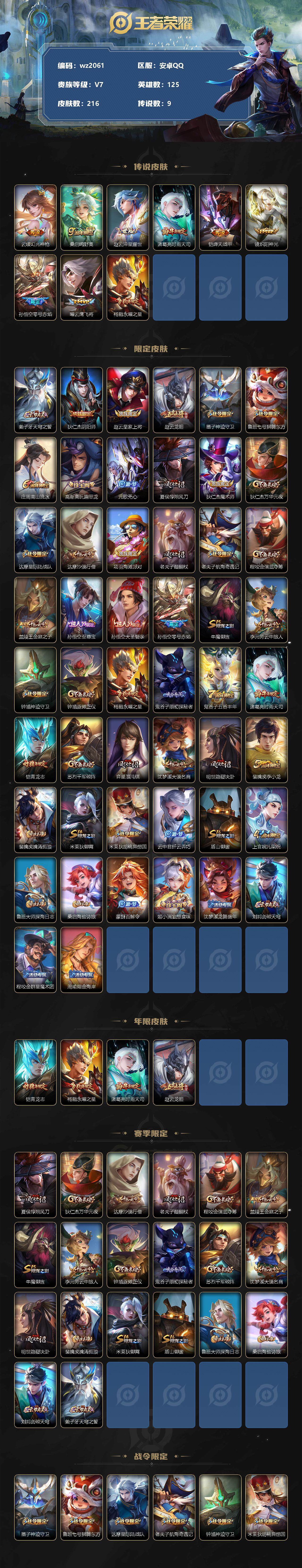 【游戏多多】【王者荣耀】【编号:3338988】【可二次实名】【wz2061】安卓Q-V7-至尊星耀IV段位-125英雄-216皮肤-0典藏-0珍品无双-0无双-0珍品传说-9传说-53史诗 【英雄全皮】:孙权全皮,影全皮 【传说皮肤】:云缨幻光神枪,桑启鸣野蒿,赵云淬星耀世,诸葛亮时雨天司,铠绛天战甲,镜炽阳神光,孙悟空零号赤焰,曜云鹰飞将,杨戬永曜之星 【限定皮肤】:姜子牙天穹之誓,狄仁杰阴阳师,赵云皇家上将,赵云龙胆,墨子神迹守卫,鲁班七号狮舞东方,庄周高山流水,高渐离玩趣恶龙,元歌无心,夏侯惇朔风刀,狄仁杰魔术师,狄仁杰万华元夜,达摩星际陆战队,达摩沙漠行僧,项羽海滩派对,老夫子醍醐杖,老夫子航海奇遇记,程咬金演武夺筹,兰陵王金庭之子,孙悟空至尊宝,孙悟空大圣娶亲,孙悟空零号赤焰,牛魔御旌,李元芳云中旅人,钟馗神迹守卫,钟馗驱傩正仪,杨戬永曜之星,鬼谷子原初探秘者,鬼谷子五谷丰年,诸葛亮时雨天司,铠青龙志,苏烈千军破阵,弈星混沌棋,沈梦溪大漠名商,明世隐疑决卦,裴擒虎李小龙,裴擒虎擒涛扼浪,米莱狄御霄,米莱狄胡桃异想国,云中君纤云弄巧,盾山御銮,上官婉儿梁祝,鲁班大师探海日志,桑启海盐诗旅,蒙犽百解令,姬小满妄想食味,沈梦溪龙舞盛年,刘邦剑破天穹,程咬金群星魔术团,周瑜熔金海岸 【年限皮肤】:铠青龙志,杨戬永曜之星,诸葛亮时雨天司,赵云龙胆 【赛季限定】:夏侯惇朔风刀,狄仁杰万华元夜,达摩沙漠行僧,老夫子醍醐杖,程咬金演武夺筹,兰陵王金庭之子,牛魔御旌,李元芳云中旅人,钟馗驱傩正仪,鬼谷子原初探秘者,苏烈千军破阵,弈星混沌棋,沈梦溪大漠名商,明世隐疑决卦,裴擒虎擒涛扼浪,米莱狄御霄,盾山御銮,鲁班大师探海日志,桑启海盐诗旅,刘邦剑破天穹,姜子牙天穹之誓 【战令限定】:墨子神迹守卫,鲁班七号狮舞东方,达摩星际陆战队,老夫子航海奇遇记,钟馗神迹守卫,米莱狄胡桃异想国 【史诗皮肤】:露娜紫霞仙子,阿轲暗夜猫娘,赵云皇家上将,赵云未来纪元,貂蝉圣诞恋歌,甄姬冰雪圆舞曲,狄仁杰魔术师,宫本武藏鬼剑武藏,孙尚香水果甜心,嬴政摇滚巨星,妲己魅力维加斯,妲己女仆咖啡,墨子金属风暴,吕布圣诞狂欢,曹操幽灵船长,李白千年之狐,吕布末日机甲,孙悟空至尊宝,花木兰水晶猎龙者,夏侯惇乘风破浪,兰陵王暗隐猎兽者,亚瑟心灵战警,百里守约特工魅影,刘禅天才门将,李元芳逐浪之夏,程咬金功夫厨神,白起星夜王子,阿轲节奏热浪,孙策猫狗日记,铠青龙志,孙悟空大圣娶亲,伽罗箭羽风息,鲁班七号狮舞东方,狄仁杰鹰眼统帅,上官婉儿梁祝,橘右京修罗,赵云龙胆,裴擒虎李小龙,云中君纤云弄巧,米莱狄胡桃异想国,百里玄策热力回旋,老夫子航海奇遇记,杨戬天秀启明,庄周高山流水,司马懿暗渊魔法,鬼谷子五谷丰年,元歌无心,蒙犽百解令,姬小满妄想食味,阿轲化蝶舞,狂铁龙之律动,黄忠百相守梦,公孙离涂山容容 【其他皮肤】:项羽海滩派对,韩信教廷特使,韩信街头霸王,露娜哥特玫瑰,赵云白执事,赵云忍炎影,程咬金星际陆战队,白起白色死神,武则天东方不败,扁鹊化身博士,孙膑天使之翼,妲己少女阿狸,典韦黄金武士,亚瑟死亡骑士,花木兰兔女郎,张飞五福同心,宫本武藏万象初新,后羿阿尔法小队,狄仁杰阴阳师,刘备汉昭烈帝,关羽龙腾万里,墨子进击墨子号,钟无艳海滩丽影,宫本武藏霸王丸,狂铁命运角斗场,牛魔制霸全明星,诸葛亮掌控之力,李白敏锐之力,苏烈坚韧之力,米莱狄御霄,庄周奇妙博物学,牛魔御旌,小乔丁香结,吕布野性能量,钟馗神迹守卫,盾山御銮,孙膑归虚梦演,高渐离玩趣恶龙,姜子牙炽热元素使,夏侯惇朔风刀,弈星混沌棋,哪吒次元突破,明世隐疑决卦,盾山圆桌骑士,老夫子醍醐杖,廉颇无尽征程,鬼谷子原初探秘者,狄仁杰万华元夜,杨戬次元傲视,露娜瓷语鉴心,达摩星际陆战队,程咬金演武夺筹,张良缤纷绘卷,盘古重装意志,钟馗驱傩正仪,墨子神迹守卫,鲁班大师乓乓大师,苏烈千军破阵,妲己紫罗兰之誓,马可波罗潮玩牛仔,达摩沙漠行僧,兰陵王金庭之子,沈梦溪大漠名商,蒙犽胡桃狂想曲,蒙恬蔚蓝守将,李元芳云中旅人,刘备潮玩造梦师,桑启海盐诗旅,猪八戒潮玩探月行,白起乐园追猎者,赵怀真太极少年,裴擒虎擒涛扼浪,莱西奥西部游侠,鲁班大师探海日志,姬小满零食大作战,李元芳妄想特派,亚连破局者,程咬金暖冬絮语,廉颇功夫炙烤,沈梦溪龙舞盛年,刘邦剑破天穹,程咬金群星魔术团,大司命暗都幽影,姜子牙天穹之誓,周瑜熔金海岸,盘古敬我三分,东皇太一噬灭天穹,吕布逐霄战戟,苍苍林狼骑,太乙真人谧流熔炉,典韦铁骨偃魂,影魅影绮裳,西施雪境奇遇,姜子牙星梦巡礼,明世隐景韶洛都,戈娅玫蓝誓约,刘备浪漫序章,钟馗虚灵犬护,苏烈春野闲踪,张良灵野札记,阿古朵布丁狗之约,露娜命运加冕,姬小满小满鸭,白起死霸装,甄姬逆浪荇歌,庄周锦麟游梦,莱西奥踏浪烽翎,鬼谷子克喵,哪吒罗小黑战记,亚瑟荣光之誓,孙权径山谋武,鲁班七号
