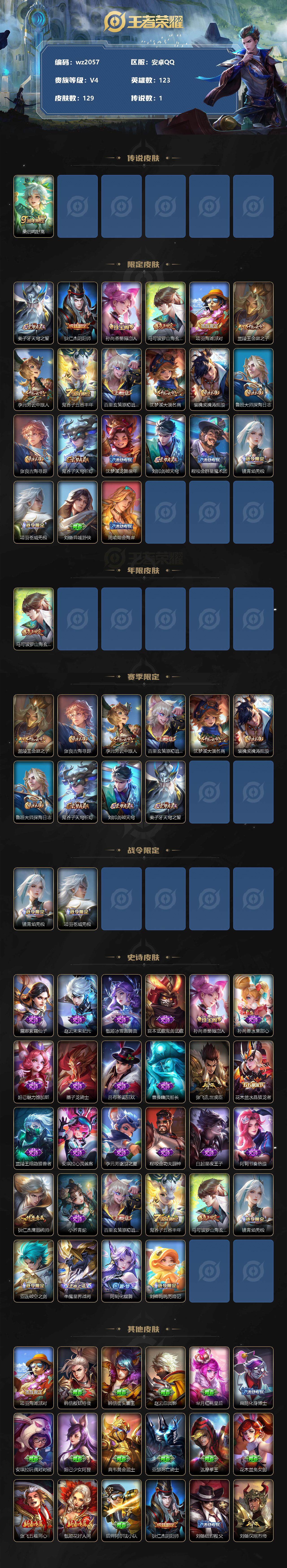【游戏多多】【王者荣耀】【编号:3338993】【可二次实名】【wz2057】安卓Q-V4-最强王者段位-123英雄-129皮肤-0典藏-0珍品无双-0无双-0珍品传说-1传说-28史诗 【英雄全皮】:影全皮 【传说皮肤】:桑启鸣野蒿 【限定皮肤】:姜子牙天穹之誓,狄仁杰阴阳师,孙尚香蔷薇恋人,马可波罗山海玄木吟,项羽海滩派对,兰陵王金庭之子,李元芳云中旅人,鬼谷子五谷丰年,百里玄策原初追逐者,沈梦溪大漠名商,裴擒虎擒涛扼浪,鲁班大师探海日志,张良古海寻踪,鬼谷子天穹祈灯,沈梦溪龙舞盛年,刘邦剑破天穹,程咬金群星魔术团,镜青焰无极,项羽苍威无极,刘备异域游侠,周瑜熔金海岸 【年限皮肤】:马可波罗山海玄木吟 【赛季限定】:兰陵王金庭之子,张良古海寻踪,李元芳云中旅人,百里玄策原初追逐者,沈梦溪大漠名商,裴擒虎擒涛扼浪,鲁班大师探海日志,鬼谷子天穹祈灯,刘邦剑破天穹,姜子牙天穹之誓 【战令限定】:镜青焰无极,项羽苍威无极 【史诗皮肤】:露娜紫霞仙子,赵云未来纪元,甄姬冰雪圆舞曲,宫本武藏鬼剑武藏,孙尚香蔷薇恋人,孙尚香水果甜心,妲己魅力维加斯,墨子龙骑士,吕布圣诞狂欢,曹操幽灵船长,张飞乱世虎臣,花木兰水晶猎龙者,兰陵王暗隐猎兽者,安琪拉心灵骇客,李元芳逐浪之夏,程咬金功夫厨神,白起星夜王子,阿轲节奏热浪,狄仁杰鹰眼统帅,小乔青蛇,百里玄策原初追逐者,鬼谷子五谷丰年,马可波罗山海玄木吟,镜青焰无极,亚连破空之剑,牛魔星界战将,阿轲化蝶舞,刘禅鸭鸭历险记 【其他皮肤】:项羽海滩派对,韩信教廷特使,韩信街头霸王,赵云忍炎影,芈月红桃皇后,扁鹊化身博士,安琪拉玩偶对对碰,妲己少女阿狸,典韦黄金武士,亚瑟死亡骑士,达摩拳王,花木兰兔女郎,张飞五福同心,甄姬花好人间,后羿阿尔法小队,狄仁杰阴阳师,刘备纽约教父,刘备汉昭烈帝,关羽龙腾万里,钟无艳海滩丽影,王昭君幻想奇妙夜,老夫子功夫老勺,李白敏锐之力,小乔丁香结,吕布野性能量,沈梦溪鲨炮海盗猫,姜子牙炽热元素使,哪吒次元突破,鲁班七号黑桃队长,狂铁特工战影,刘禅秘密基地,鲁班大师乓乓大师,程咬金无双福将,兰陵王金庭之子,沈梦溪大漠名商,李元芳云中旅人,猪八戒潮玩探月行,裴擒虎擒涛扼浪,莱西奥西部游侠,鲁班大师探海日志,张良古海寻踪,后羿完美运算,鬼谷子天穹祈灯,嫦娥漠中幻影,廉颇功夫炙烤,亚瑟鸿运当头,沈梦溪龙舞盛年,钟无艳春野之旅,刘邦剑破天穹,程咬金群星魔术团,项羽苍威无极,大司命暗都幽影,刘备异域游侠,姜子牙天穹之誓,周瑜熔金海岸,孙悟空神迹守卫,盘古敬我三分,东皇太一噬灭天穹,米莱狄怪诞之夜,吕布逐霄战戟,苍苍林狼骑,太乙真人谧流熔炉,影魅影绮裳,西施雪境奇遇,姜子牙星梦巡礼,明世隐景韶洛都,戈娅玫蓝誓约,刘备浪漫序章,钟馗虚灵犬护,沈梦溪鸭鸭历险记,苏烈春野闲踪,阿古朵布丁狗之约,露娜命运加冕,姬小满小满鸭,白起死霸装,甄姬逆浪荇歌,庄周锦麟游梦,项羽帝国元帅,孙悟空西部大镖客,李白范海辛,马可波罗激情绿茵,杨戬埃及法老,诸葛亮星航指挥官,黄忠芝加哥教父,干将莫邪第七人偶,百里守约绝影神枪,公孙离花间舞,弈星踏雪寻梅,司马懿魇语军师,伽罗花见巫女,李信灼热之刃,上官婉儿修竹墨客,盘古创世神祝,曜归虚梦演,蒙犽归虚梦演,澜孤猎,司空震启蛰,云缨赤焰之缨,金蝉前尘,暃碧珀绯影 【内测皮肤】:孙尚香蔷薇恋人,狂铁特工战影 【营地ID】:1756865079