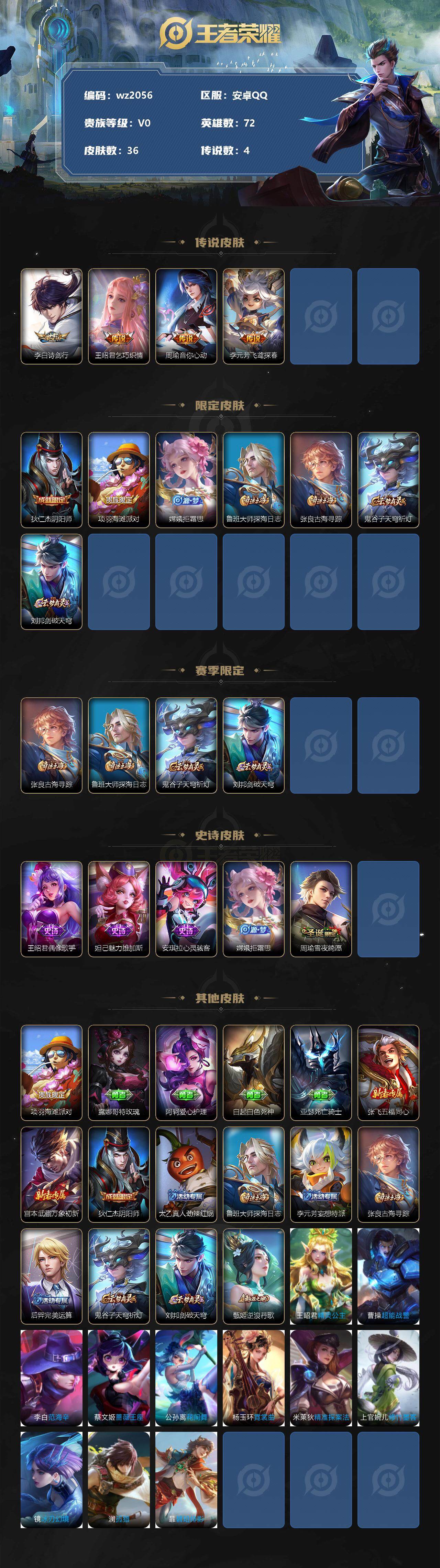 【游戏多多】【王者荣耀】【编号:3339011】【可二次实名】【wz2056】安卓Q-V0-最强王者段位-72英雄-36皮肤-0典藏-0珍品无双-0无双-0珍品传说-4传说-5史诗 【传说皮肤】:李白诗剑行,王昭君乞巧织情,周瑜音你心动,李元芳飞鸢探春 【限定皮肤】:狄仁杰阴阳师,项羽海滩派对,嫦娥拒霜思,鲁班大师探海日志,张良古海寻踪,鬼谷子天穹祈灯,刘邦剑破天穹 【赛季限定】:张良古海寻踪,鲁班大师探海日志,鬼谷子天穹祈灯,刘邦剑破天穹 【史诗皮肤】:王昭君偶像歌手,妲己魅力维加斯,安琪拉心灵骇客,嫦娥拒霜思,周瑜雪夜绮愿 【其他皮肤】:项羽海滩派对,露娜哥特玫瑰,阿轲爱心护理,白起白色死神,亚瑟死亡骑士,张飞五福同心,宫本武藏万象初新,狄仁杰阴阳师,太乙真人劲辣红锅,鲁班大师探海日志,李元芳妄想特派,张良古海寻踪,后羿完美运算,鬼谷子天穹祈灯,刘邦剑破天穹,甄姬逆浪荇歌,王昭君精灵公主,曹操超能战警,李白范海辛,蔡文姬蔷薇王座,公孙离花间舞,杨玉环霓裳曲,米莱狄精准探案法,上官婉儿修竹墨客,镜冰刃幻境,澜孤猎,暃碧珀绯影 【营地ID】:1728129615