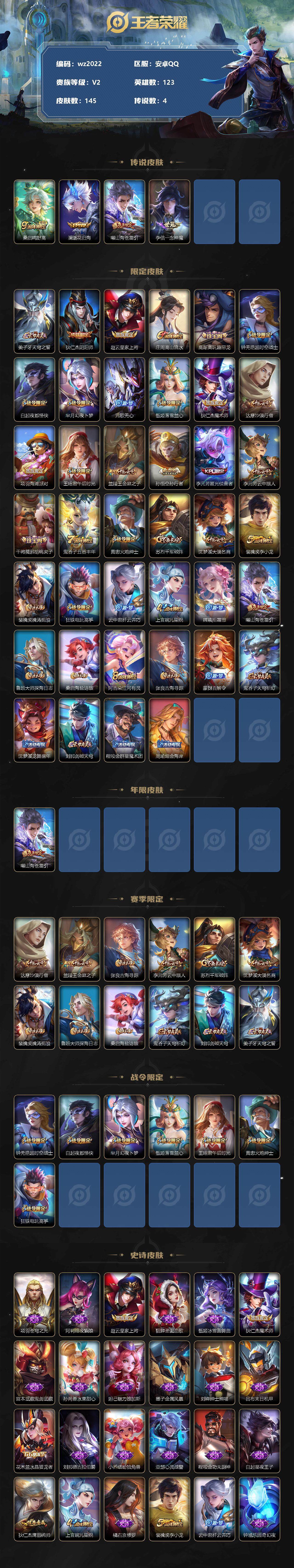 【游戏多多】【王者荣耀】【编号:3339017】【可二次实名】【wz2022】安卓Q-V2-荣耀黄金IV段位-123英雄-145皮肤-0典藏-0珍品无双-0无双-0珍品传说-4传说-36史诗 【传说皮肤】:桑启鸣野蒿,澜逐花归海,曜山海苍雷引,李信一念神魔 【限定皮肤】:姜子牙天穹之誓,狄仁杰阴阳师,赵云皇家上将,庄周高山流水,高渐离玩趣恶龙,钟无艳超时空战士,白起夜都怪侠,芈月幻夜卜梦,元歌无心,甄姬落雪兰心,狄仁杰魔术师,达摩沙漠行僧,项羽海滩派对,王昭君午后时光,兰陵王金庭之子,孙悟空孙行者,李元芳匿光侦查者,李元芳云中旅人,干将莫邪胡桃夹子,鬼谷子五谷丰年,黄忠火炮绅士,苏烈千军破阵,沈梦溪大漠名商,裴擒虎李小龙,裴擒虎擒涛扼浪,狂铁电玩高手,云中君纤云弄巧,上官婉儿梁祝,嫦娥拒霜思,曜山海苍雷引,鲁班大师探海日志,桑启海盐诗旅,阿古朵江河有灵,张良古海寻踪,蒙犽百解令,鬼谷子天穹祈灯,沈梦溪龙舞盛年,刘邦剑破天穹,程咬金群星魔术团,周瑜熔金海岸 【年限皮肤】:曜山海苍雷引 【赛季限定】:达摩沙漠行僧,兰陵王金庭之子,张良古海寻踪,李元芳云中旅人,苏烈千军破阵,沈梦溪大漠名商,裴擒虎擒涛扼浪,鲁班大师探海日志,桑启海盐诗旅,鬼谷子天穹祈灯,刘邦剑破天穹,姜子牙天穹之誓 【战令限定】:钟无艳超时空战士,白起夜都怪侠,芈月幻夜卜梦,甄姬落雪兰心,王昭君午后时光,黄忠火炮绅士,狂铁电玩高手 【史诗皮肤】:项羽苍穹之光,阿轲暗夜猫娘,赵云皇家上将,貂蝉圣诞恋歌,甄姬冰雪圆舞曲,狄仁杰魔术师,宫本武藏鬼剑武藏,孙尚香水果甜心,妲己魅力维加斯,墨子金属风暴,刘禅绅士熊喵,吕布末日机甲,花木兰水晶猎龙者,刘邦德古拉伯爵,小乔缤纷独角兽,亚瑟心灵战警,程咬金功夫厨神,白起星夜王子,狄仁杰鹰眼统帅,上官婉儿梁祝,橘右京修罗,裴擒虎李小龙,云中君纤云弄巧,钟馗乐园奇幻夜,孙悟空孙行者,庄周高山流水,嫦娥拒霜思,黄忠火炮绅士,澜赏金猎手,狂铁电玩高手,钟无艳超时空战士,鬼谷子五谷丰年,元歌无心,李元芳匿光侦查者,阿古朵江河有灵,蒙犽百解令 【其他皮肤】:项羽海滩派对,韩信街头霸王,达摩大发明家,赵云忍炎影,芈月红桃皇后,白起白色死神,武则天东方不败,孙膑天使之翼,典韦黄金武士,亚瑟死亡骑士,达摩拳王,花木兰兔女郎,宫本武藏万象初新,狄仁杰阴阳师,刘备汉昭烈帝,关羽龙腾万里,钟无艳海滩丽影,老夫子功夫老勺,诸葛亮掌控之力,苏烈坚韧之力,大乔守护之力,吕布野性能量,高渐离玩趣恶龙,沈梦溪鲨炮海盗猫,姜子牙炽热元素使,哪吒次元突破,刘禅秘密基地,张良缤纷绘卷,鲁班大师乓乓大师,苏烈千军破阵,干将莫邪胡桃夹子,达摩沙漠行僧,芈月幻夜卜梦,白起夜都怪侠,兰陵王金庭之子,刘禅唤灵魔甲,王昭君午后时光,沈梦溪大漠名商,蒙恬蔚蓝守将,甄姬落雪兰心,李元芳云中旅人,戈娅危途狂花,桑启海盐诗旅,猪八戒潮玩探月行,赵怀真太极少年,裴擒虎擒涛扼浪,太乙真人劲辣红锅,鲁班大师探海日志,姬小满零食大作战,李元芳妄想特派,哪吒热血海滩,张良古海寻踪,钟无艳聚星闪耀,海月王牌新星,亚连破局者,兰陵王幻夜行动,曹操决胜大满贯,后羿完美运算,程咬金暖冬絮语,鬼谷子天穹祈灯,海诺时空谍影,廉颇功夫炙烤,沈梦溪龙舞盛年,钟无艳春野之旅,扁鹊无尽旅途,刘邦剑破天穹,程咬金群星魔术团,姜子牙天穹之誓,周瑜熔金海岸,盘古敬我三分,干将莫邪雾都夜雨,苍苍林狼骑,典韦铁骨偃魂,阿古朵布丁狗之约,高渐离金属狂潮,曹操超能战警,张良一千零一夜,后羿精灵王,钟馗地府判官,李元芳特种部队,刘邦圣殿之光,虞姬加勒比小姐,雅典娜战争女神,马可波罗激情绿茵,太乙真人圆桌骑士,哪吒三太子,干将莫邪第七人偶,铠龙域领主,百里玄策威尼斯狂欢,梦奇美梦成真,明世隐占星师,孙策海之征途,盾山极冰防御线,李信灼热之刃,嫦娥露花倒影,猪八戒年年有余,曜归虚梦演,马超幸存者,镜冰刃幻境,蒙恬秩序猎龙将,阿古朵熊喵少女,澜孤猎,司空震启蛰,云缨赤焰之缨,金蝉前尘 【内测皮肤】:高渐离玩趣恶龙,干将莫邪胡桃夹子 【营地ID】:1822142963