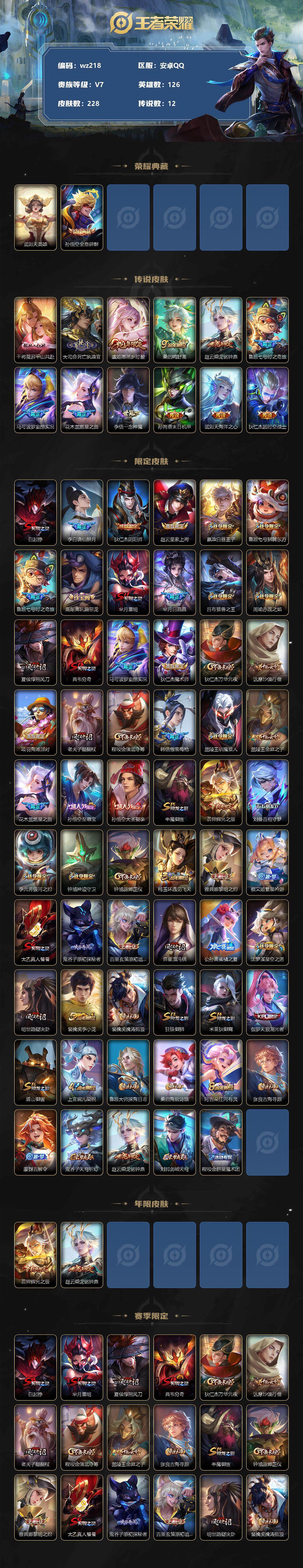 【游戏多多】【王者荣耀】【编号:3339021】【可二次实名】【wz218】【商品标题】:安卓Q-V7-最强王者段位-126英雄-228皮肤-1典藏-0珍品无双-0无双-0珍品传说-12传说-68史诗 【荣耀典藏】:武则天英雄,孙悟空全息碎影 【传说皮肤】:干将莫邪千山共赴,大司命死亡执政官,虞姬愿照岁时盈,桑启鸣野蒿,赵云乘龙铭钟鼎,鲁班七号时之奇旅,马可波罗妄想实况,花木兰燃星之曲,李信一念神魔,孙尚香末日机甲,武则天海洋之心,狄仁杰超时空战士 【限定皮肤】:白起狰,李白谪仙醉月,狄仁杰阴阳师,赵云皇家上将,嬴政白昼王子,鲁班七号狮舞东方,鲁班七号时之奇旅,高渐离玩趣恶龙,芈月重明,芈月白晶晶,吕布猎兽之王,周瑜赤莲之焰,夏侯惇朔风刀,典韦穷奇,马可波罗妄想实况,狄仁杰魔术师,狄仁杰万华元夜,达摩沙漠行僧,项羽海滩派对,老夫子醍醐杖,程咬金演武夺筹,韩信傲雪梅枪,兰陵王驯魔猎人,兰陵王金庭之子,花木兰燃星之曲,孙悟空至尊宝,孙悟空大圣娶亲,牛魔御旌,后羿辉光之辰,刘备百相守梦,李元芳银河之约,钟馗神迹守卫,钟馗驱傩正仪,杨玉环遇见飞天,雅典娜黎明之约,蔡文姬繁星吟游,太乙真人饕餮,鬼谷子原初探秘者,百里玄策原初追逐者,弈星混沌棋,公孙离蜜橘之夏,沈梦溪星空之诺,明世隐疑决卦,裴擒虎李小龙,裴擒虎擒涛扼浪,狂铁御狮,米莱狄御霄,伽罗天狼溯光者,盾山御銮,上官婉儿梁祝,鲁班大师探海日志,桑启海盐诗旅,阿古朵江河有灵,张良古海寻踪,蒙犽百解令,鬼谷子天穹祈灯,赵云乘龙铭钟鼎,刘邦剑破天穹,程咬金群星魔术团 【年限皮肤】:后羿辉光之辰,赵云乘龙铭钟鼎 【赛季限定】:白起狰,芈月重明,夏侯惇朔风刀,典韦穷奇,狄仁杰万华元夜,达摩沙漠行僧,老夫子醍醐杖,程咬金演武夺筹,兰陵王金庭之子,张良古海寻踪,牛魔御旌,钟馗驱傩正仪,雅典娜黎明之约,太乙真人饕餮,鬼谷子原初探秘者,百里玄策原初追逐者,弈星混沌棋,明世隐疑决卦,裴擒虎擒涛扼浪,狂铁御狮,米莱狄御霄,盾山御銮,鲁班大师探海日志,桑启海盐诗旅,鬼谷子天穹祈灯,刘邦剑破天穹 【战令限定】:嬴政白昼王子,鲁班七号狮舞东方,吕布猎兽之王,周瑜赤莲之焰,兰陵王驯魔猎人,李元芳银河之约,钟馗神迹守卫,沈梦溪星空之诺 【史诗皮肤】:赵云皇家上将,赵云未来纪元,貂蝉圣诞恋歌,甄姬冰雪圆舞曲,王昭君偶像歌手,狄仁杰魔术师,宫本武藏鬼剑武藏,孙尚香水果甜心,嬴政暗夜贵公子,妲己魅力维加斯,妲己女仆咖啡,吕布圣诞狂欢,刘禅绅士熊喵,曹操幽灵船长,李白千年之狐,吕布末日机甲,孙悟空至尊宝,花木兰水晶猎龙者,刘邦德古拉伯爵,夏侯惇乘风破浪,小乔缤纷独角兽,兰陵王暗隐猎兽者,诸葛亮黄金分割率,安琪拉心灵骇客,后羿辉光之辰,百里守约特工魅影,铠曙光守护者,蔡文姬舞动绿茵,公孙离蜜橘之夏,李元芳逐浪之夏,程咬金功夫厨神,阿轲节奏热浪,杨玉环遇见飞天,嬴政白昼王子,孙悟空大圣娶亲,鲁班七号狮舞东方,狄仁杰鹰眼统帅,兰陵王驯魔猎人,上官婉儿梁祝,蔡文姬繁星吟游,李元芳银河之约,娜可露露晚萤,不知火舞魅语,橘右京修罗,百里玄策原初追逐者,裴擒虎李小龙,芈月白晶晶,伽罗天狼溯光者,沈梦溪月团寄思,司马懿暗渊魔法,雅典娜黎明之约,韩信傲雪梅枪,高渐离天秀音浪,刘备百相守梦,刘禅电玩爆裂旋风,阿古朵江河有灵,蒙犽百解令,马可波罗星界特工,李白谪仙醉月,牛魔星界战将,狄仁杰绮世丹青,阿轲化蝶舞,狂铁龙之律动,百里守约雪豹霜爪,老夫子藏狐褐绒,亚瑟布丁狗之誓,黄忠百相守梦,公孙离涂山容容 【其他皮肤】:项羽海滩派对,韩信教廷特使,韩信街头霸王,露娜哥特玫瑰,阿轲爱心护理,达摩大发明家,赵云忍炎影,程咬金星际陆战队,白起白色死神,武则天东方不败,扁鹊化身博士,扁鹊救世之瞳,安琪拉玩偶对对碰,妲己少女阿狸,典韦黄金武士,亚瑟死亡骑士,达摩拳王,花木兰兔女郎,张飞五福同心,甄姬花好人间,宫本武藏万象初新,后羿阿尔法小队,狄仁杰阴阳师,刘备汉昭烈帝,关羽龙腾万里,墨子进击墨子号,白起狰,钟无艳海滩丽影,太乙真人饕餮,宫本武藏霸王丸,王昭君幻想奇妙夜,芈月重明,老夫子功夫老勺,孙尚香沉稳之力,典韦穷奇,诸葛亮掌控之力,李白敏锐之力,鬼谷子幻乐之宴,狂铁御狮,安琪拉如懿,苏烈坚韧之力,大乔守护之力,项羽科学大爆炸,米莱狄御霄,吕布猎兽之王,明世隐虹云星官,牛魔御旌,小乔丁香结,钟馗神迹守卫,盾山御銮,孙膑归虚梦演,高渐离玩趣恶龙,沈梦溪鲨炮海盗猫,姜子牙炽热元素使,夏侯惇朔风刀,周瑜赤莲之焰,沈梦溪星空之诺,弈星混沌棋,哪吒次元突破,明世隐疑决卦,盾山圆桌骑士,老夫子醍醐杖,狂铁特工战影,鬼谷子原初探秘者,狄仁杰万华元夜,刘禅秘密基地,程咬金演武夺筹,钟馗驱傩正仪,典韦铁甲之心,达摩沙漠行僧,程咬金无双福将,兰陵王金庭之子,桑启海盐诗旅,猪八戒潮玩探月行,裴擒虎擒涛扼浪,太乙真人劲辣红锅,鲁班大师探
