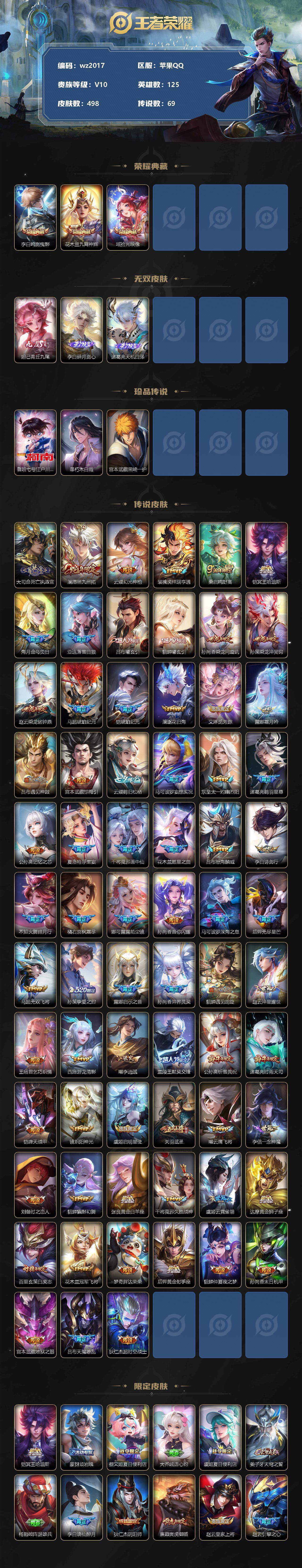 【游戏多多】【王者荣耀】【编号:3339023】【可二次实名】【wz2017】苹果Q-V10-永恒钻石III段位-125英雄-498皮肤-3典藏-0珍品无双-3无双-3珍品传说-69传说-167史诗 【英雄全皮】:刘禅全皮,宫本武藏全皮,露娜全皮,花木兰全皮,娜可露露全皮,橘右京全皮,雅典娜全皮,鬼谷子全皮,盾山全皮,马超全皮,鲁班大师全皮,蒙恬全皮,镜全皮,阿古朵全皮,夏洛特全皮,云缨全皮,金蝉全皮,赵怀真全皮,戈娅全皮,空空儿全皮,海诺全皮 【荣耀典藏】:李白鸣剑曳影,花木兰九霄神辉,瑶拾光映像 【无双皮肤】:妲己青丘九尾,李白碎月剑心,诸葛亮天机白泽 【珍品传说】:鲁班七号江户川柯南,暃朽木白哉,宫本武藏黑崎一护 【传说皮肤】:大司命死亡执政官,澜愿照九州拓,云缨幻光神枪,裴擒虎祥瑞亨通,桑启鸣野蒿,铠冥王哈迪斯,海月金乌负日,亚连落雪白狼,吕布曦玄引,貂蝉曦玄引,孙尚香乘龙问璇玑,孙策乘龙淬吴钩,赵云乘龙铭钟鼎,马超琥珀纪元,铠琥珀纪元,澜逐花归海,艾琳觅芳踪,露娜霜月吟,吕布遇见神鼓,宫本武藏惊梅引,云缨鹤归松栖,马可波罗妄想实况,东皇太一灼幽烈阳,诸葛亮鹤羽星尊,公孙离记忆之芯,夏洛特浮生妄,干将莫邪画中仙,花木兰燃星之曲,吕布怒海麟威,李白诗剑行,不知火舞绯月行,橘右京枫霜尽,娜可露露前尘镜,孙尚香音你闪耀,马可波罗深海之息,后羿无尽星芒,马超无双飞将,孙策挚爱之约,露娜启示之音,孙尚香异界灵契,貂蝉遇见胡旋,赵云淬星耀世,王昭君乞巧织情,西施游龙清影,曜李逍遥 ,兰陵王默契交锋,公孙离祈雪灵祝,诸葛亮时雨天司,铠绛天战甲,镜炽阳神光,虞姬启明星使,关羽武圣,曜云鹰飞将,李信一念神魔,刘备时之恋人,貂蝉猫影幻舞,张良黄金白羊座,干将莫邪久胜战神,虞姬云霓雀翎,达摩黄金狮子座,百里玄策白虎志,花木兰冠军飞将,梦奇胖达荣荣,后羿黄金射手座,貂蝉仲夏夜之梦,孙尚香末日机甲,宫本武藏地狱之眼,吕布天魔缭乱,狄仁杰超时空战士 【限定皮肤】:铠冥王哈迪斯,蒙犽顽岩魄,蔡文姬夏日便利店,大乔绒语心约,虞姬夏日便利店,姜子牙天穹之誓,杨戬破阵退雄兵,李白谪仙醉月,狄仁杰阴阳师,廉颇寅虎御盾,赵云皇家上将,赵云引擎之心,赵云百木心枪,墨子神迹守卫,妲己热情桑巴,妲己时之奇旅,孙尚香蔷薇恋人,孙尚香异界灵契,鲁班七号乒乒小将,庄周高山流水,阿轲迷踪丽影,钟无艳超时空战士,扁鹊奇幻香踪,芈月白晶晶,芈月幻夜卜梦,吕布天魔缭乱,吕布御风骁将,吕布遇见神鼓,元歌云间偶戏,元歌无心,夏侯惇朔风刀,夏侯惇匿光决锋者,甄姬游园惊梦,甄姬落雪兰心,马可波罗逐梦之星,马可波罗深海之息,马可波罗山海玄木吟,马可波罗妄想实况,狄仁杰魔术师,狄仁杰万华元夜,达摩沙漠行僧,项羽海滩派对,老夫子醍醐杖,老夫子航海奇遇记,关羽武圣,貂蝉遇见胡旋,程咬金演武夺筹,露娜一生所爱,露娜启示之音,韩信逐梦之影,韩信飞衡,韩信傲雪梅枪,王昭君午后时光,兰陵王默契交锋,兰陵王金庭之子,花木兰青春决赛季,花木兰瑞麟志,花木兰默契交锋,花木兰燃星之曲,不知火舞绯月行,娜可露露前尘镜,橘右京枫霜尽,亚瑟潮玩骑士王,孙悟空美猴王,孙悟空至尊宝,孙悟空大圣娶亲,孙悟空孙行者,后羿如梦令,后羿圣弓游侠,后羿无尽星芒,李元芳匿光侦查者,李元芳云中旅人,虞姬启明星使,钟馗驱傩正仪,杨戬潮玩骑兵,女娲朔望之晖,干将莫邪真爱魔法,干将莫邪画中仙,雅典娜单词大作战,雅典娜黎明之约,鬼谷子原初探秘者,鬼谷子五谷丰年,诸葛亮时雨天司,诸葛亮鹤羽星尊,大乔白鹤梁神女,黄忠火炮绅士,铠青龙志,苏烈玄武志,苏烈千军破阵,百里玄策白虎志,百里玄策原初追逐者,百里守约朱雀志,梦奇顽趣,公孙离蜜橘之夏,公孙离祈雪灵祝,公孙离玉兔公主,沈梦溪大漠名商,沈梦溪匿光破解者,裴擒虎李小龙,裴擒虎擒涛扼浪,狂铁电玩高手,云中君纤云弄巧,云中君时之祈愿,伽罗天狼溯光者,盾山御銮,盾山梦圆繁星,孙策挚爱之约,上官婉儿梁祝,上官婉儿天狼绘梦者,嫦娥拒霜思,嫦娥暖冬兔眠,曜李逍遥 ,西施玲珑珍味,蒙犽狂想玩偶喵,鲁班大师匿光启智者,鲁班大师探海日志,镜匿光追影者,桑启海盐诗旅,夏洛特浮生妄,金蝉唐三藏,戈娅驭风魔法,艾琳女武神,艾琳流音漫舞,赵怀真鹤归松栖,云缨鹤归松栖,司空震地狱燃心,阿古朵江河有灵,张良古海寻踪,艾琳觅芳踪,蒙恬荣光圣徽,高渐离燃音魔法,妲己灵卜魔法,鬼谷子天穹祈灯,李白碎月剑心,伽罗琥珀纪元,铠琥珀纪元,马超琥珀纪元,大乔乘龙忆丹青,安琪拉乘龙聚宝船,孙尚香乘龙问璇玑,孙策乘龙淬吴钩,赵云乘龙铭钟鼎,吕布曦玄引,貂蝉曦玄引,百里玄策超元猎域,亚连落雪白狼,沈梦溪龙舞盛年,鲁班七号蔬乡物语,李元芳蔬乡物语,海月金乌负日,刘邦剑破天穹,关羽决胜骁骑,镜青焰无极,项羽苍威无极,海诺心动手记,刘备异域游侠,芈月浮光幕影,周瑜熔金海岸 【年限皮肤】:百里玄策白虎志,百里守