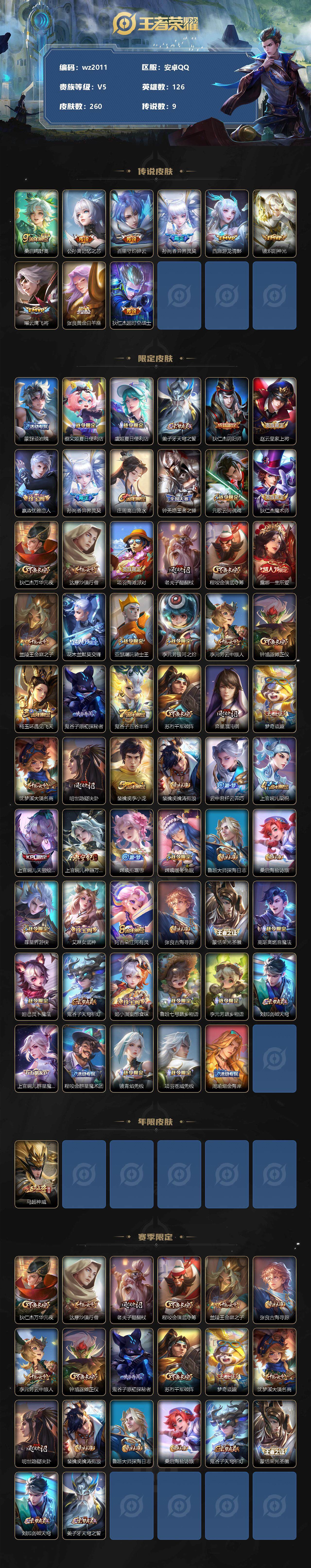 【游戏多多】【王者荣耀】【编号:3339025】【可二次实名】【wz2011】安卓Q-V5-至尊星耀II段位-126英雄-260皮肤-0典藏-0珍品无双-0无双-0珍品传说-9传说-85史诗 【英雄全皮】:蒙恬全皮,空空儿全皮,少司缘全皮 【传说皮肤】:桑启鸣野蒿,公孙离记忆之芯,百里守约碎云,孙尚香异界灵契,西施游龙清影,镜炽阳神光,曜云鹰飞将,张良黄金白羊座,狄仁杰超时空战士 【限定皮肤】:蒙犽顽岩魄,蔡文姬夏日便利店,虞姬夏日便利店,姜子牙天穹之誓,狄仁杰阴阳师,赵云皇家上将,嬴政优雅恋人,孙尚香异界灵契,庄周高山流水,钟无艳王者之锤,元歌云间偶戏,狄仁杰魔术师,狄仁杰万华元夜,达摩沙漠行僧,项羽海滩派对,老夫子醍醐杖,程咬金演武夺筹,露娜一生所爱,兰陵王金庭之子,花木兰默契交锋,亚瑟潮玩骑士王,李元芳银河之约,李元芳云中旅人,钟馗驱傩正仪,杨玉环遇见飞天,鬼谷子原初探秘者,鬼谷子五谷丰年,苏烈千军破阵,弈星混沌棋,梦奇顽趣,沈梦溪大漠名商,明世隐疑决卦,裴擒虎李小龙,裴擒虎擒涛扼浪,云中君纤云弄巧,上官婉儿梁祝,上官婉儿天狼绘梦者,上官婉儿神器万象笔,嫦娥拒霜思,嫦娥暖冬兔眠,鲁班大师探海日志,桑启海盐诗旅,暃星界游侠,艾琳女武神,阿古朵江河有灵,张良古海寻踪,蒙恬荣光圣徽,高渐离燃音魔法,妲己灵卜魔法,鬼谷子天穹祈灯,姬小满妄想食味,鲁班七号蔬乡物语,李元芳蔬乡物语,刘邦剑破天穹,上官婉儿群星魔术团,程咬金群星魔术团,镜青焰无极,项羽苍威无极,周瑜熔金海岸 【年限皮肤】:马超神威 【赛季限定】:狄仁杰万华元夜,达摩沙漠行僧,老夫子醍醐杖,程咬金演武夺筹,兰陵王金庭之子,张良古海寻踪,李元芳云中旅人,钟馗驱傩正仪,鬼谷子原初探秘者,苏烈千军破阵,弈星混沌棋,梦奇顽趣,沈梦溪大漠名商,明世隐疑决卦,裴擒虎擒涛扼浪,鲁班大师探海日志,桑启海盐诗旅,鬼谷子天穹祈灯,蒙恬荣光圣徽,刘邦剑破天穹,姜子牙天穹之誓 【战令限定】:蔡文姬夏日便利店,虞姬夏日便利店,元歌云间偶戏,亚瑟潮玩骑士王,李元芳银河之约,嫦娥暖冬兔眠,暃星界游侠,高渐离燃音魔法,妲己灵卜魔法,鲁班七号蔬乡物语,李元芳蔬乡物语,镜青焰无极,项羽苍威无极 【史诗皮肤】:露娜紫霞仙子,阿轲暗夜猫娘,钟无艳王者之锤,赵云皇家上将,赵云未来纪元,貂蝉圣诞恋歌,甄姬冰雪圆舞曲,王昭君偶像歌手,狄仁杰魔术师,廉颇地狱岩魂,宫本武藏鬼剑武藏,孙尚香水果甜心,嬴政优雅恋人,嬴政摇滚巨星,妲己魅力维加斯,妲己女仆咖啡,墨子金属风暴,刘禅绅士熊喵,曹操幽灵船长,李白千年之狐,吕布末日机甲,张飞乱世虎臣,花木兰水晶猎龙者,刘邦德古拉伯爵,夏侯惇乘风破浪,小乔缤纷独角兽,兰陵王暗隐猎兽者,诸葛亮黄金分割率,亚瑟心灵战警,安琪拉心灵骇客,百里守约特工魅影,蔡文姬舞动绿茵,李元芳逐浪之夏,白起星夜王子,阿轲节奏热浪,杨玉环遇见飞天,大乔猫狗日记,露娜一生所爱,伽罗箭羽风息,狄仁杰鹰眼统帅,公孙离无限星赏官,上官婉儿梁祝,李元芳银河之约,娜可露露晚萤,大乔白蛇,不知火舞魅语,橘右京修罗,马超神威,孙尚香时之恋人,上官婉儿天狼绘梦者,裴擒虎李小龙,云中君纤云弄巧,元歌云间偶戏,花木兰默契交锋,蒙犽龙鼓争鸣,沈梦溪月团寄思,庄周高山流水,嫦娥拒霜思,哪吒雪上飞焰,夏洛特永昼,澜赏金猎手,貂蝉唤灵魅影,弈星滕王阁序,鬼谷子五谷丰年,上官婉儿神器万象笔,梦奇顽趣,暃星界游侠,海月浮梦罗烟,阿古朵江河有灵,妲己灵卜魔法,高渐离燃音魔法,蒙恬荣光圣徽,姬小满妄想食味,鲁班七号蔬乡物语,上官婉儿群星魔术团,镜青焰无极,蔡文姬夏日便利店,蒙犽顽岩魄,少司缘涂山红红,姬小满战舞者,廉颇撼地雄心,亚连破空之剑,牛魔星界战将,刘禅鸭鸭历险记,后羿石田雨龙,黄忠百相守梦 【其他皮肤】:项羽海滩派对,韩信教廷特使,韩信街头霸王,露娜哥特玫瑰,阿轲爱心护理,达摩大发明家,赵云忍炎影,芈月红桃皇后,艾琳女武神,白起白色死神,牛魔西部大镖客,扁鹊化身博士,扁鹊救世之瞳,安琪拉玩偶对对碰,孙膑天使之翼,妲己少女阿狸,典韦黄金武士,亚瑟死亡骑士,达摩拳王,花木兰兔女郎,张飞五福同心,甄姬花好人间,刘备万事如意,宫本武藏万象初新,后羿阿尔法小队,狄仁杰阴阳师,刘备纽约教父,关羽龙腾万里,钟无艳海滩丽影,王昭君幻想奇妙夜,狂铁命运角斗场,老夫子功夫老勺,诸葛亮掌控之力,李白敏锐之力,鬼谷子幻乐之宴,大乔守护之力,明世隐虹云星官,吕布野性能量,孙膑归虚梦演,沈梦溪鲨炮海盗猫,弈星混沌棋,哪吒次元突破,明世隐疑决卦,盾山圆桌骑士,老夫子醍醐杖,狂铁特工战影,廉颇无尽征程,鬼谷子原初探秘者,狄仁杰万华元夜,亚瑟潮玩骑士王,刘禅秘密基地,露娜瓷语鉴心,程咬金演武夺筹,张良缤纷绘卷,钟馗驱傩正仪,鲁班大师乓乓大师,苏烈千军破阵,达摩沙漠行僧,程咬金无双福将,兰陵王金庭之子,刘禅唤灵魔甲,沈梦溪大漠名