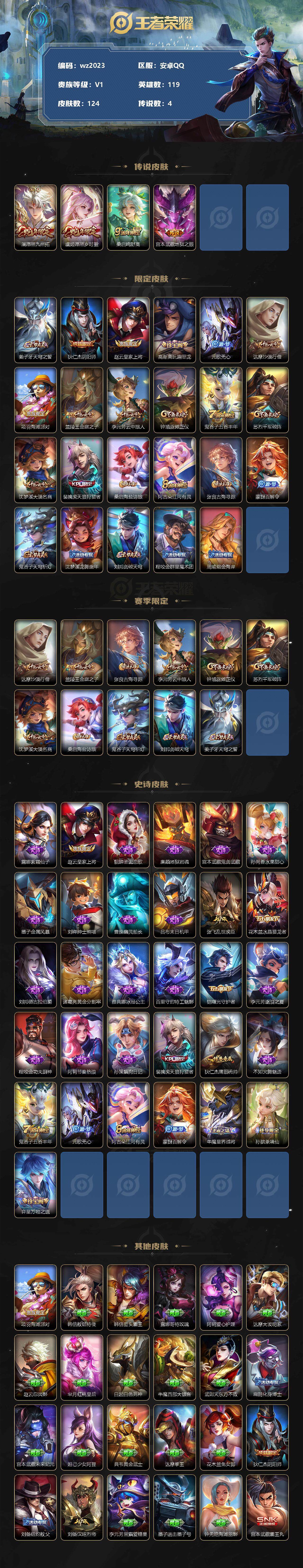 【游戏多多】【王者荣耀】【编号:3339027】【可二次实名】【wz2023】安卓Q-V1-尊贵铂金IV段位-119英雄-124皮肤-0典藏-0珍品无双-0无双-0珍品传说-4传说-31史诗 【英雄全皮】:影全皮 【传说皮肤】:澜愿照九州拓,虞姬愿照岁时盈,桑启鸣野蒿,宫本武藏地狱之眼 【限定皮肤】:姜子牙天穹之誓,狄仁杰阴阳师,赵云皇家上将,高渐离玩趣恶龙,元歌无心,达摩沙漠行僧,项羽海滩派对,兰陵王金庭之子,李元芳云中旅人,钟馗驱傩正仪,鬼谷子五谷丰年,苏烈千军破阵,沈梦溪大漠名商,裴擒虎天狼狩猎者,桑启海盐诗旅,阿古朵江河有灵,张良古海寻踪,蒙犽百解令,鬼谷子天穹祈灯,沈梦溪龙舞盛年,刘邦剑破天穹,程咬金群星魔术团,周瑜熔金海岸 【赛季限定】:达摩沙漠行僧,兰陵王金庭之子,张良古海寻踪,李元芳云中旅人,钟馗驱傩正仪,苏烈千军破阵,沈梦溪大漠名商,桑启海盐诗旅,鬼谷子天穹祈灯,刘邦剑破天穹,姜子牙天穹之誓 【史诗皮肤】:露娜紫霞仙子,赵云皇家上将,貂蝉圣诞恋歌,廉颇地狱岩魂,宫本武藏鬼剑武藏,孙尚香水果甜心,墨子金属风暴,刘禅绅士熊喵,曹操幽灵船长,吕布末日机甲,张飞乱世虎臣,花木兰水晶猎龙者,刘邦德古拉伯爵,诸葛亮黄金分割率,雅典娜冰冠公主,百里守约特工魅影,铠曙光守护者,李元芳逐浪之夏,程咬金功夫厨神,阿轲节奏热浪,孙策猫狗日记,裴擒虎天狼狩猎者,狄仁杰鹰眼统帅,不知火舞魅语,鬼谷子五谷丰年,元歌无心,阿古朵江河有灵,蒙犽百解令,牛魔星界战将,孙膑茶境仙,弈星万物之道 【其他皮肤】:项羽海滩派对,韩信教廷特使,韩信街头霸王,露娜哥特玫瑰,阿轲爱心护理,达摩大发明家,赵云忍炎影,芈月红桃皇后,白起白色死神,牛魔西部大镖客,武则天东方不败,扁鹊化身博士,宫本武藏未来纪元,妲己少女阿狸,典韦黄金武士,达摩拳王,花木兰兔女郎,狄仁杰阴阳师,刘备纽约教父,刘备汉昭烈帝,李元芳黑猫爱糖果,墨子进击墨子号,钟无艳海滩丽影,宫本武藏霸王丸,孙尚香沉稳之力,吕布野性能量,高渐离玩趣恶龙,狂铁特工战影,钟馗驱傩正仪,鲁班大师乓乓大师,苏烈千军破阵,达摩沙漠行僧,兰陵王金庭之子,沈梦溪大漠名商,蒙恬蔚蓝守将,李元芳云中旅人,戈娅危途狂花,刘备潮玩造梦师,桑启海盐诗旅,太乙真人劲辣红锅,莱西奥西部游侠,李元芳妄想特派,张良古海寻踪,后羿完美运算,鬼谷子天穹祈灯,海诺时空谍影,沈梦溪龙舞盛年,钟无艳春野之旅,刘邦剑破天穹,程咬金群星魔术团,姜子牙天穹之誓,周瑜熔金海岸,盘古敬我三分,东皇太一噬灭天穹,干将莫邪雾都夜雨,吕布逐霄战戟,苍苍林狼骑,太乙真人谧流熔炉,典韦铁骨偃魂,马超访茗客,影魅影绮裳,西施雪境奇遇,东皇太一金福满堂,戈娅玫蓝誓约,高渐离金属狂潮,貂蝉异域舞娘,老夫子潮流仙人,王昭君精灵公主,曹操超能战警,孙悟空西部大镖客,李白范海辛,李元芳特种部队,虞姬加勒比小姐,夏侯惇战争骑士,雅典娜战争女神,马可波罗激情绿茵,苍维京掠夺者,杨戬埃及法老,干将莫邪第七人偶,铠龙域领主,百里守约绝影神枪,公孙离花间舞,弈星踏雪寻梅,李信灼热之刃,马超幸存者,西施归虚梦演,澜孤猎,司空震启蛰,金蝉前尘 【内测皮肤】:高渐离玩趣恶龙,狂铁特工战影 【营地ID】:1776149211