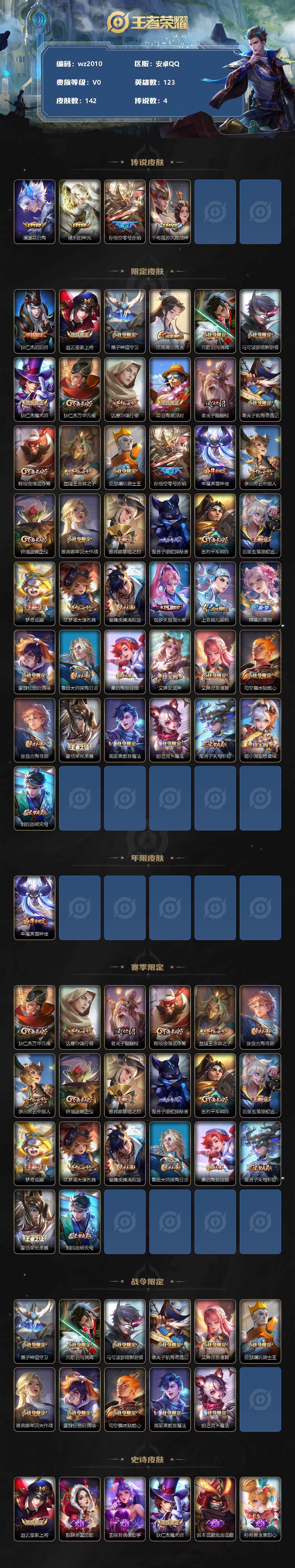 【游戏多多】【王者荣耀】【编号:3339029】【可二次实名】【wz2010】安卓Q-V0-最强王者段位-123英雄-142皮肤-0典藏-0珍品无双-0无双-0珍品传说-4传说-33史诗 【传说皮肤】:澜逐花归海,镜炽阳神光,孙悟空零号赤焰,干将莫邪久胜战神 【限定皮肤】:狄仁杰阴阳师,赵云皇家上将,墨子神迹守卫,庄周高山流水,元歌云间偶戏,马可波罗暗影游猎,狄仁杰魔术师,狄仁杰万华元夜,达摩沙漠行僧,项羽海滩派对,老夫子醍醐杖,老夫子航海奇遇记,程咬金演武夺筹,兰陵王金庭之子,亚瑟潮玩骑士王,孙悟空零号赤焰,牛魔奔雷神使,李元芳云中旅人,钟馗驱傩正仪,雅典娜单词大作战,雅典娜黎明之约,鬼谷子原初探秘者,苏烈千军破阵,百里玄策原初追逐者,梦奇顽趣,沈梦溪大漠名商,裴擒虎擒涛扼浪,伽罗天狼溯光者,上官婉儿梁祝,嫦娥拒霜思,蒙犽狂想玩偶喵,鲁班大师探海日志,桑启海盐诗旅,艾琳女武神,艾琳流音漫舞,司空震地狱燃心,张良古海寻踪,蒙恬荣光圣徽,高渐离燃音魔法,妲己灵卜魔法,鬼谷子天穹祈灯,姬小满妄想食味,刘邦剑破天穹 【年限皮肤】:牛魔奔雷神使 【赛季限定】:狄仁杰万华元夜,达摩沙漠行僧,老夫子醍醐杖,程咬金演武夺筹,兰陵王金庭之子,张良古海寻踪,李元芳云中旅人,钟馗驱傩正仪,雅典娜黎明之约,鬼谷子原初探秘者,苏烈千军破阵,百里玄策原初追逐者,梦奇顽趣,沈梦溪大漠名商,裴擒虎擒涛扼浪,鲁班大师探海日志,桑启海盐诗旅,鬼谷子天穹祈灯,蒙恬荣光圣徽,刘邦剑破天穹 【战令限定】:墨子神迹守卫,元歌云间偶戏,马可波罗暗影游猎,老夫子航海奇遇记,艾琳流音漫舞,亚瑟潮玩骑士王,雅典娜单词大作战,蒙犽狂想玩偶喵,司空震地狱燃心,高渐离燃音魔法,妲己灵卜魔法 【史诗皮肤】:赵云皇家上将,貂蝉圣诞恋歌,王昭君偶像歌手,狄仁杰魔术师,宫本武藏鬼剑武藏,孙尚香水果甜心,嬴政摇滚巨星,吕布圣诞狂欢,张飞乱世虎臣,花木兰水晶猎龙者,刘邦德古拉伯爵,程咬金功夫厨神,阿轲节奏热浪,狄仁杰鹰眼统帅,上官婉儿梁祝,橘右京修罗,马可波罗暗影游猎,蒙犽狂想玩偶喵,百里玄策原初追逐者,元歌云间偶戏,牛魔奔雷神使,老夫子航海奇遇记,伽罗天狼溯光者,钟馗乐园奇幻夜,庄周高山流水,嫦娥拒霜思,雅典娜黎明之约,梦奇顽趣,司空震地狱燃心,妲己灵卜魔法,高渐离燃音魔法,蒙恬荣光圣徽,姬小满妄想食味,后羿石田雨龙 【其他皮肤】:项羽海滩派对,韩信教廷特使,韩信街头霸王,赵云忍炎影,艾琳女武神,牛魔西部大镖客,扁鹊救世之瞳,宫本武藏未来纪元,孙膑天使之翼,妲己少女阿狸,典韦黄金武士,花木兰兔女郎,张飞五福同心,刘备万事如意,狄仁杰阴阳师,刘备汉昭烈帝,关羽龙腾万里,钟无艳海滩丽影,宫本武藏霸王丸,王昭君幻想奇妙夜,老夫子功夫老勺,孙尚香沉稳之力,诸葛亮掌控之力,李白敏锐之力,鬼谷子幻乐之宴,苏烈坚韧之力,大乔守护之力,明世隐虹云星官,庄周奇妙博物学,小乔丁香结,吕布野性能量,沈梦溪鲨炮海盗猫,姜子牙炽热元素使,哪吒次元突破,老夫子醍醐杖,狂铁特工战影,鬼谷子原初探秘者,雅典娜单词大作战,狄仁杰万华元夜,亚瑟潮玩骑士王,刘禅秘密基地,露娜瓷语鉴心,程咬金演武夺筹,张良缤纷绘卷,钟馗驱傩正仪,墨子神迹守卫,鲁班大师乓乓大师,苏烈千军破阵,达摩沙漠行僧,程咬金无双福将,兰陵王金庭之子,沈梦溪大漠名商,蒙恬蔚蓝守将,李元芳云中旅人,桑启海盐诗旅,猪八戒潮玩探月行,赵怀真太极少年,裴擒虎擒涛扼浪,太乙真人劲辣红锅,鲁班大师探海日志,艾琳流音漫舞,张良古海寻踪,鬼谷子天穹祈灯,妲己灵卜魔法,廉颇功夫炙烤,刘邦剑破天穹,东皇太一噬灭天穹,苍苍林狼骑,太乙真人谧流熔炉,姜子牙星梦巡礼,钟馗虚灵犬护,露娜命运加冕,鲁班七号木偶奇遇记,项羽帝国元帅,露娜绯红之刃,貂蝉异域舞娘,后羿精灵王,钟馗地府判官,李元芳特种部队,刘邦圣殿之光,虞姬加勒比小姐,夏侯惇战争骑士,苍维京掠夺者,杨戬埃及法老,太乙真人圆桌骑士,东皇太一东海龙王,铠龙域领主,百里守约绝影神枪,苏烈爱与和平,女娲尼罗河女神,公孙离花间舞,元歌午夜歌剧院,孙策海之征途,盾山极冰防御线,伽罗花见巫女,沈梦溪棒球奇才,李信灼热之刃,上官婉儿修竹墨客,盘古创世神祝,曜归虚梦演,马超幸存者,澜孤猎,司空震启蛰,云缨赤焰之缨,金蝉前尘 【内测皮肤】:艾琳女武神,狂铁特工战影 【营地ID】:1713124544