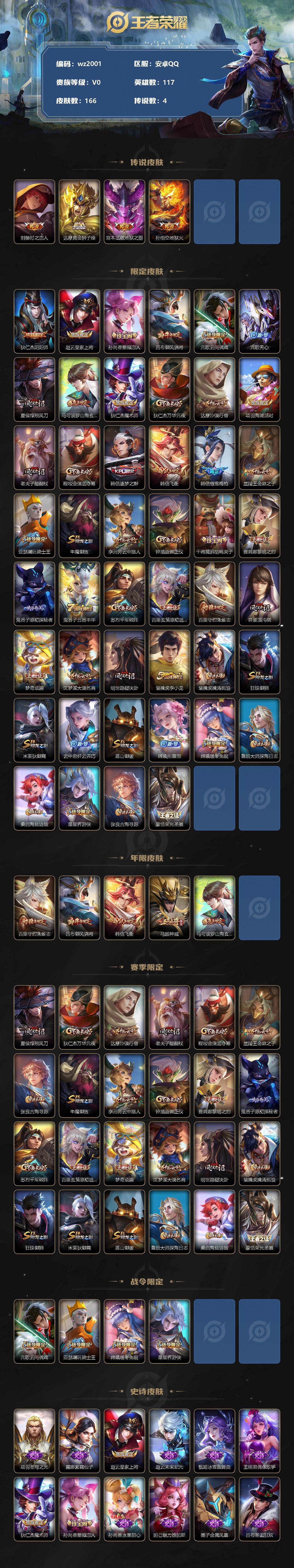 【游戏多多】【王者荣耀】【编号:3339032】【可二次实名】【wz2001】安卓Q-V0-至尊星耀V段位-117英雄-166皮肤-0典藏-0珍品无双-0无双-0珍品传说-4传说-39史诗 【英雄全皮】:蒙恬全皮 【传说皮肤】:刘备时之恋人,达摩黄金狮子座,宫本武藏地狱之眼,孙悟空地狱火 【限定皮肤】:狄仁杰阴阳师,赵云皇家上将,孙尚香蔷薇恋人,吕布御风骁将,元歌云间偶戏,元歌无心,夏侯惇朔风刀,马可波罗山海玄木吟,狄仁杰魔术师,狄仁杰万华元夜,达摩沙漠行僧,项羽海滩派对,老夫子醍醐杖,程咬金演武夺筹,韩信逐梦之影,韩信飞衡,韩信傲雪梅枪,兰陵王金庭之子,亚瑟潮玩骑士王,牛魔御旌,李元芳云中旅人,钟馗驱傩正仪,干将莫邪胡桃夹子,雅典娜黎明之约,鬼谷子原初探秘者,鬼谷子五谷丰年,苏烈千军破阵,百里玄策原初追逐者,百里守约朱雀志,弈星混沌棋,梦奇顽趣,沈梦溪大漠名商,明世隐疑决卦,裴擒虎李小龙,裴擒虎擒涛扼浪,狂铁御狮,米莱狄御霄,云中君纤云弄巧,盾山御銮,嫦娥拒霜思,嫦娥暖冬兔眠,鲁班大师探海日志,桑启海盐诗旅,暃星界游侠,张良古海寻踪,蒙恬荣光圣徽 【年限皮肤】:百里守约朱雀志,吕布御风骁将,韩信飞衡,马超神威,马可波罗山海玄木吟 【赛季限定】:夏侯惇朔风刀,狄仁杰万华元夜,达摩沙漠行僧,老夫子醍醐杖,程咬金演武夺筹,兰陵王金庭之子,张良古海寻踪,牛魔御旌,李元芳云中旅人,钟馗驱傩正仪,雅典娜黎明之约,鬼谷子原初探秘者,苏烈千军破阵,百里玄策原初追逐者,弈星混沌棋,梦奇顽趣,沈梦溪大漠名商,明世隐疑决卦,裴擒虎擒涛扼浪,狂铁御狮,米莱狄御霄,盾山御銮,鲁班大师探海日志,桑启海盐诗旅,蒙恬荣光圣徽 【战令限定】:元歌云间偶戏,亚瑟潮玩骑士王,嫦娥暖冬兔眠,暃星界游侠 【史诗皮肤】:项羽苍穹之光,露娜紫霞仙子,赵云皇家上将,赵云未来纪元,甄姬冰雪圆舞曲,王昭君偶像歌手,狄仁杰魔术师,孙尚香蔷薇恋人,孙尚香水果甜心,妲己魅力维加斯,墨子金属风暴,吕布圣诞狂欢,刘禅绅士熊喵,曹操幽灵船长,韩信逐梦之影,兰陵王暗隐猎兽者,铠曙光守护者,阿轲节奏热浪,孙策猫狗日记,百里守约朱雀志,狄仁杰鹰眼统帅,韩信飞衡,马超神威,百里玄策原初追逐者,裴擒虎李小龙,云中君纤云弄巧,元歌云间偶戏,吕布御风骁将,嫦娥拒霜思,雅典娜黎明之约,韩信傲雪梅枪,澜赏金猎手,鬼谷子五谷丰年,元歌无心,梦奇顽趣,暃星界游侠,马可波罗山海玄木吟,镜玫瑰异探,蒙恬荣光圣徽 【其他皮肤】:项羽海滩派对,韩信教廷特使,韩信街头霸王,阿轲爱心护理,达摩大发明家,赵云忍炎影,芈月红桃皇后,扁鹊化身博士,妲己少女阿狸,典韦黄金武士,亚瑟死亡骑士,花木兰兔女郎,甄姬花好人间,刘备万事如意,狄仁杰阴阳师,刘备纽约教父,刘备汉昭烈帝,关羽龙腾万里,墨子进击墨子号,钟无艳海滩丽影,宫本武藏霸王丸,狂铁命运角斗场,老夫子功夫老勺,孙尚香沉稳之力,李白敏锐之力,鬼谷子幻乐之宴,狂铁御狮,苏烈坚韧之力,米莱狄御霄,明世隐虹云星官,庄周奇妙博物学,牛魔御旌,小乔丁香结,吕布野性能量,盾山御銮,沈梦溪鲨炮海盗猫,姜子牙炽热元素使,夏侯惇朔风刀,弈星混沌棋,哪吒次元突破,鲁班七号黑桃队长,明世隐疑决卦,盾山圆桌骑士,老夫子醍醐杖,鬼谷子原初探秘者,狄仁杰万华元夜,亚瑟潮玩骑士王,刘禅秘密基地,杨戬次元傲视,程咬金演武夺筹,张良缤纷绘卷,盘古重装意志,钟馗驱傩正仪,鲁班大师乓乓大师,苏烈千军破阵,干将莫邪胡桃夹子,达摩沙漠行僧,程咬金无双福将,刘邦虎啸剑宗,兰陵王金庭之子,刘禅唤灵魔甲,沈梦溪大漠名商,蒙恬蔚蓝守将,李元芳云中旅人,戈娅危途狂花,刘备潮玩造梦师,桑启海盐诗旅,嫦娥暖冬兔眠,猪八戒潮玩探月行,牛魔牛运亨通,白起乐园追猎者,赵怀真太极少年,裴擒虎擒涛扼浪,太乙真人劲辣红锅,莱西奥西部游侠,鲁班大师探海日志,李元芳妄想特派,张良古海寻踪,兰陵王幻夜行动,曹操决胜大满贯,姜子牙星梦巡礼,甄姬逆浪荇歌,鲁班七号福禄兄弟,项羽帝国元帅,露娜绯红之刃,钟无艳生化警戒,花木兰剑舞者,王昭君精灵公主,狄仁杰锦衣卫,张良一千零一夜,孙悟空西部大镖客,周瑜海军大将,李白范海辛,钟馗地府判官,李元芳特种部队,关羽天启骑士,马可波罗激情绿茵,苍维京掠夺者,干将莫邪第七人偶,铠龙域领主,百里守约绝影神枪,百里玄策威尼斯狂欢,女娲尼罗河女神,公孙离花间舞,裴擒虎街头旋风,元歌午夜歌剧院,司马懿魇语军师,伽罗花见巫女,李信灼热之刃,上官婉儿修竹墨客,嫦娥露花倒影,猪八戒年年有余,盘古创世神祝,云中君荷鲁斯之眼,曜归虚梦演,马超幸存者,蒙犽归虚梦演,镜冰刃幻境,蒙恬秩序猎龙将,阿古朵熊喵少女,澜孤猎,司空震启蛰,云缨赤焰之缨 【内测皮肤】:孙尚香蔷薇恋人,干将莫邪胡桃夹子 【营地ID】:1874858996