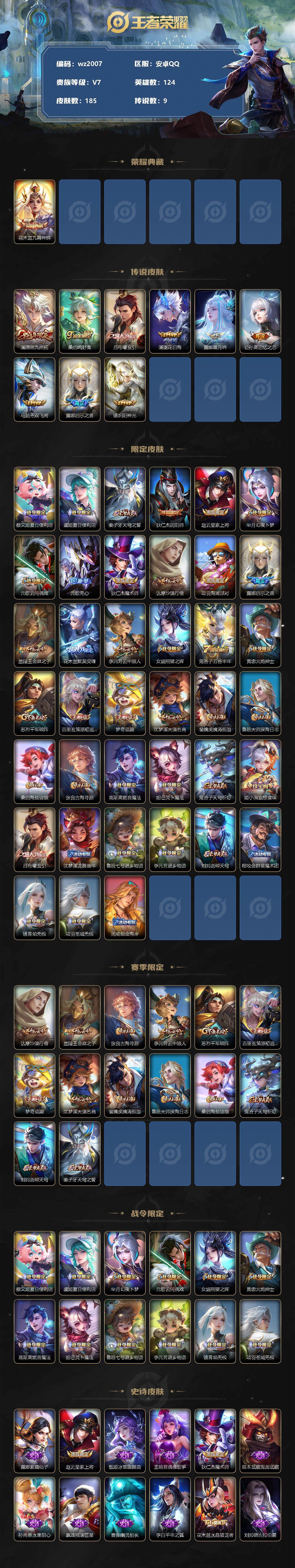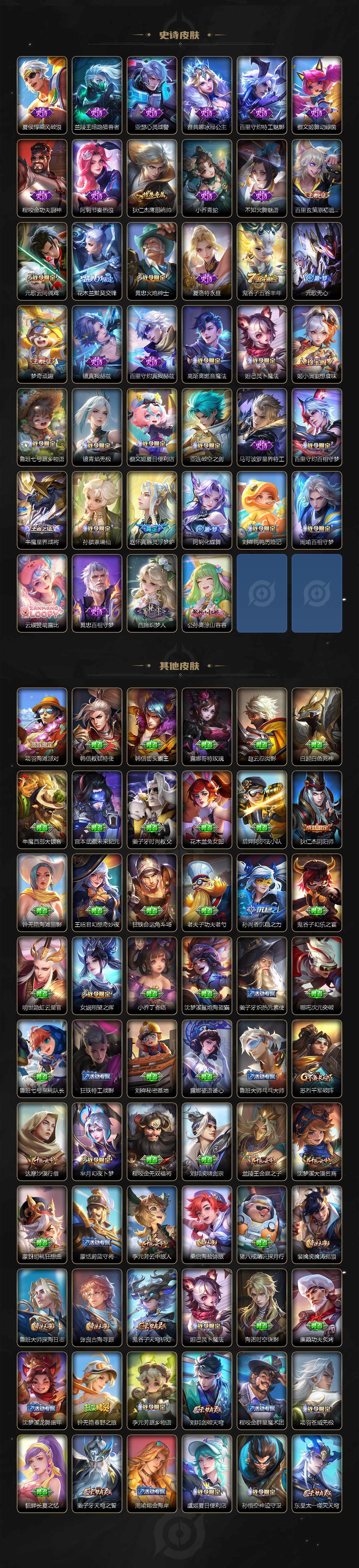 【游戏多多】【王者荣耀】【编号:3339035】【可二次实名】【wz2007】安卓Q-V7-至尊星耀II段位-124英雄-185皮肤-1典藏-0珍品无双-0无双-0珍品传说-9传说-51史诗 【英雄全皮】:空空儿全皮,影全皮 【荣耀典藏】:花木兰九霄神辉 【传说皮肤】:澜愿照九州拓,桑启鸣野蒿,吕布曦玄引,澜逐花归海,露娜霜月吟,公孙离记忆之芯,马超无双飞将,露娜启示之音,镜炽阳神光 【限定皮肤】:蔡文姬夏日便利店,虞姬夏日便利店,姜子牙天穹之誓,狄仁杰阴阳师,赵云皇家上将,芈月幻夜卜梦,元歌云间偶戏,元歌无心,狄仁杰魔术师,达摩沙漠行僧,项羽海滩派对,露娜启示之音,兰陵王金庭之子,花木兰默契交锋,李元芳云中旅人,女娲朔望之晖,鬼谷子五谷丰年,黄忠火炮绅士,苏烈千军破阵,百里玄策原初追逐者,梦奇顽趣,沈梦溪大漠名商,裴擒虎擒涛扼浪,鲁班大师探海日志,桑启海盐诗旅,张良古海寻踪,高渐离燃音魔法,妲己灵卜魔法,鬼谷子天穹祈灯,姬小满妄想食味,吕布曦玄引,沈梦溪龙舞盛年,鲁班七号蔬乡物语,李元芳蔬乡物语,刘邦剑破天穹,程咬金群星魔术团,镜青焰无极,项羽苍威无极,周瑜熔金海岸 【赛季限定】:达摩沙漠行僧,兰陵王金庭之子,张良古海寻踪,李元芳云中旅人,苏烈千军破阵,百里玄策原初追逐者,梦奇顽趣,沈梦溪大漠名商,裴擒虎擒涛扼浪,鲁班大师探海日志,桑启海盐诗旅,鬼谷子天穹祈灯,刘邦剑破天穹,姜子牙天穹之誓 【战令限定】:蔡文姬夏日便利店,虞姬夏日便利店,芈月幻夜卜梦,元歌云间偶戏,女娲朔望之晖,黄忠火炮绅士,高渐离燃音魔法,妲己灵卜魔法,鲁班七号蔬乡物语,李元芳蔬乡物语,镜青焰无极,项羽苍威无极 【史诗皮肤】:露娜紫霞仙子,赵云皇家上将,甄姬冰雪圆舞曲,王昭君偶像歌手,狄仁杰魔术师,宫本武藏鬼剑武藏,孙尚香水果甜心,嬴政摇滚巨星,曹操幽灵船长,李白千年之狐,花木兰水晶猎龙者,刘邦德古拉伯爵,夏侯惇乘风破浪,兰陵王暗隐猎兽者,亚瑟心灵战警,雅典娜冰冠公主,百里守约特工魅影,蔡文姬舞动绿茵,程咬金功夫厨神,阿轲节奏热浪,狄仁杰鹰眼统帅,小乔青蛇,不知火舞魅语,百里玄策原初追逐者,元歌云间偶戏,花木兰默契交锋,黄忠火炮绅士,夏洛特永昼,鬼谷子五谷丰年,元歌无心,梦奇顽趣,镜真我赫兹,百里守约真我赫兹,妲己灵卜魔法,高渐离燃音魔法,姬小满妄想食味,鲁班七号蔬乡物语,镜青焰无极,蔡文姬夏日便利店,亚连破空之剑,马可波罗星界特工,百里守约百相守梦,牛魔星界战将,孙膑茶境仙,赵怀真器灵浮梦炉,阿轲化蝶舞,刘禅鸭鸭历险记,周瑜百相守梦,云缨赞萌露比,黄忠百相守梦,西施织梦人,公孙离涂山容容 【其他皮肤】:项羽海滩派对,韩信教廷特使,韩信街头霸王,露娜哥特玫瑰,赵云忍炎影,白起白色死神,牛魔西部大镖客,宫本武藏未来纪元,姜子牙时尚教父,花木兰兔女郎,后羿阿尔法小队,狄仁杰阴阳师,钟无艳海滩丽影,王昭君幻想奇妙夜,狂铁命运角斗场,老夫子功夫老勺,孙尚香沉稳之力,鬼谷子幻乐之宴,明世隐虹云星官,女娲朔望之晖,小乔丁香结,沈梦溪鲨炮海盗猫,姜子牙炽热元素使,哪吒次元突破,鲁班七号黑桃队长,狂铁特工战影,刘禅秘密基地,露娜瓷语鉴心,鲁班大师乓乓大师,苏烈千军破阵,达摩沙漠行僧,芈月幻夜卜梦,程咬金无双福将,刘邦虎啸剑宗,兰陵王金庭之子,沈梦溪大漠名商,蒙犽胡桃狂想曲,蒙恬蔚蓝守将,李元芳云中旅人,桑启海盐诗旅,猪八戒潮玩探月行,裴擒虎擒涛扼浪,鲁班大师探海日志,张良古海寻踪,鬼谷子天穹祈灯,妲己灵卜魔法,海诺时空谍影,廉颇功夫炙烤,沈梦溪龙舞盛年,钟无艳春野之旅,李元芳蔬乡物语,刘邦剑破天穹,程咬金群星魔术团,项羽苍威无极,貂蝉长夏之忆,姜子牙天穹之誓,周瑜熔金海岸,虞姬夏日便利店,孙悟空神迹守卫,东皇太一噬灭天穹,老夫子百相守梦,干将莫邪雾都夜雨,苍苍林狼骑,太乙真人谧流熔炉,典韦铁骨偃魂,马超访茗客,影魅影绮裳,西施雪境奇遇,明世隐景韶洛都,戈娅玫蓝誓约,刘备浪漫序章,钟馗虚灵犬护,沈梦溪鸭鸭历险记,张良灵野札记,阿古朵布丁狗之约,露娜命运加冕,姬小满小满鸭,白起死霸装,甄姬逆浪荇歌,孙策百相守梦,庄周锦麟游梦,空空儿戏梦巡演,高渐离落日弦歌,莱西奥踏浪烽翎,鬼谷子克喵,鲁班七号木偶奇遇记,露娜绯红之刃,花木兰剑舞者,老夫子潮流仙人,后羿精灵王,刘禅英喵野望,兰陵王隐刃,李白范海辛,李元芳特种部队,马可波罗激情绿茵,苍维京掠夺者,太乙真人圆桌骑士,诸葛亮星航指挥官,黄忠芝加哥教父,大乔伊势巫女,干将莫邪第七人偶,鬼谷子阿摩司公爵,百里守约绝影神枪,百里玄策威尼斯狂欢,梦奇美梦成真,裴擒虎街头旋风,元歌午夜歌剧院,沈梦溪棒球奇才,上官婉儿修竹墨客,嫦娥露花倒影,猪八戒年年有余,瑶森,云中君荷鲁斯之眼,马超幸存者,西施归虚梦演,镜冰刃幻境,蒙恬秩序猎龙将,阿古朵熊喵少女,澜孤猎,司空震启蛰,云缨赤焰之缨,金蝉前尘,暃碧珀绯