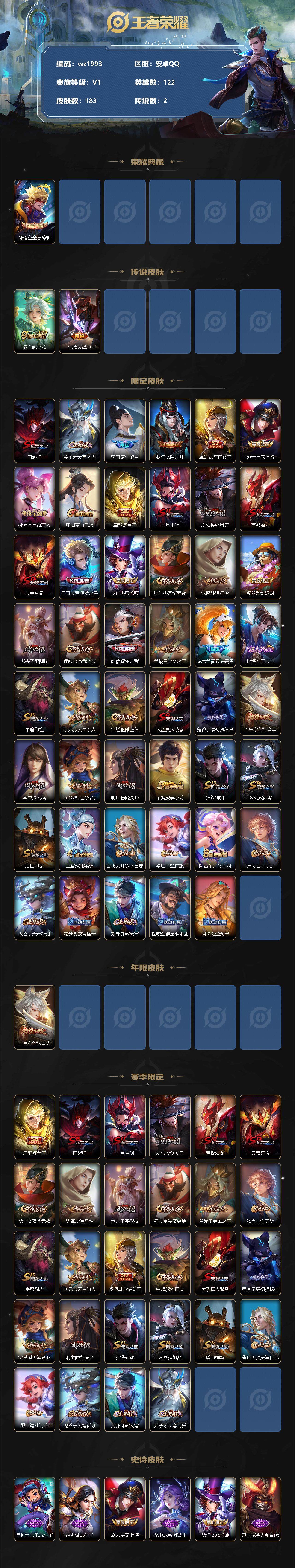 【游戏多多】【王者荣耀】【编号:3339039】【可二次实名】【wz1993】安卓Q-V1-永恒钻石I段位-122英雄-183皮肤-1典藏-0珍品无双-0无双-0珍品传说-2传说-42史诗 【英雄全皮】:影全皮 【荣耀典藏】:孙悟空全息碎影 【传说皮肤】:桑启鸣野蒿,铠绛天战甲 【限定皮肤】:白起狰,姜子牙天穹之誓,李白谪仙醉月,狄仁杰阴阳师,虞姬凯尔特女王,赵云皇家上将,孙尚香蔷薇恋人,庄周高山流水,扁鹊炼金王,芈月重明,夏侯惇朔风刀,曹操烛龙,典韦穷奇,马可波罗逐梦之星,狄仁杰魔术师,狄仁杰万华元夜,达摩沙漠行僧,项羽海滩派对,老夫子醍醐杖,程咬金演武夺筹,韩信逐梦之影,兰陵王金庭之子,花木兰青春决赛季,孙悟空至尊宝,牛魔御旌,李元芳云中旅人,钟馗驱傩正仪,太乙真人饕餮,鬼谷子原初探秘者,百里守约朱雀志,弈星混沌棋,沈梦溪大漠名商,明世隐疑决卦,裴擒虎李小龙,狂铁御狮,米莱狄御霄,盾山御銮,上官婉儿梁祝,鲁班大师探海日志,桑启海盐诗旅,阿古朵江河有灵,张良古海寻踪,鬼谷子天穹祈灯,沈梦溪龙舞盛年,刘邦剑破天穹,程咬金群星魔术团,周瑜熔金海岸 【年限皮肤】:百里守约朱雀志 【赛季限定】:扁鹊炼金王,白起狰,芈月重明,夏侯惇朔风刀,曹操烛龙,典韦穷奇,狄仁杰万华元夜,达摩沙漠行僧,老夫子醍醐杖,程咬金演武夺筹,兰陵王金庭之子,张良古海寻踪,牛魔御旌,李元芳云中旅人,虞姬凯尔特女王,钟馗驱傩正仪,太乙真人饕餮,鬼谷子原初探秘者,弈星混沌棋,沈梦溪大漠名商,明世隐疑决卦,狂铁御狮,米莱狄御霄,盾山御銮,鲁班大师探海日志,桑启海盐诗旅,鬼谷子天穹祈灯,刘邦剑破天穹,姜子牙天穹之誓 【史诗皮肤】:鲁班七号电玩小子,露娜紫霞仙子,赵云皇家上将,甄姬冰雪圆舞曲,狄仁杰魔术师,宫本武藏鬼剑武藏,孙尚香蔷薇恋人,孙尚香水果甜心,嬴政暗夜贵公子,妲己魅力维加斯,李白千年之狐,吕布末日机甲,张飞乱世虎臣,孙悟空至尊宝,花木兰水晶猎龙者,韩信逐梦之影,夏侯惇乘风破浪,小乔缤纷独角兽,兰陵王暗隐猎兽者,诸葛亮黄金分割率,马可波罗逐梦之星,亚瑟心灵战警,雅典娜冰冠公主,安琪拉心灵骇客,花木兰青春决赛季,百里守约特工魅影,铠曙光守护者,阿轲节奏热浪,孙策猫狗日记,百里守约朱雀志,狄仁杰鹰眼统帅,公孙离无限星赏官,上官婉儿梁祝,裴擒虎李小龙,钟馗乐园奇幻夜,庄周高山流水,澜赏金猎手,阿古朵江河有灵,亚连破空之剑,李白谪仙醉月,孙膑茶境仙,阿轲化蝶舞 【其他皮肤】:项羽海滩派对,韩信教廷特使,韩信街头霸王,露娜哥特玫瑰,阿轲致命风华,阿轲爱心护理,赵云白执事,赵云忍炎影,程咬金星际陆战队,白起白色死神,扁鹊化身博士,宫本武藏未来纪元,妲己少女阿狸,典韦黄金武士,亚瑟死亡骑士,达摩拳王,花木兰兔女郎,张飞五福同心,甄姬花好人间,宫本武藏万象初新,狄仁杰阴阳师,扁鹊炼金王,虞姬凯尔特女王,白起狰,钟无艳海滩丽影,太乙真人饕餮,宫本武藏霸王丸,曹操烛龙,王昭君幻想奇妙夜,芈月重明,狂铁命运角斗场,老夫子功夫老勺,典韦穷奇,诸葛亮掌控之力,李白敏锐之力,鬼谷子幻乐之宴,狂铁御狮,苏烈坚韧之力,大乔守护之力,米莱狄御霄,明世隐虹云星官,庄周奇妙博物学,牛魔御旌,吕布野性能量,盾山御銮,沈梦溪鲨炮海盗猫,姜子牙炽热元素使,夏侯惇朔风刀,弈星混沌棋,哪吒次元突破,明世隐疑决卦,盾山圆桌骑士,老夫子醍醐杖,鬼谷子原初探秘者,狄仁杰万华元夜,刘禅秘密基地,露娜瓷语鉴心,程咬金演武夺筹,张良缤纷绘卷,钟馗驱傩正仪,鲁班大师乓乓大师,达摩沙漠行僧,程咬金无双福将,兰陵王金庭之子,沈梦溪大漠名商,蒙恬蔚蓝守将,李元芳云中旅人,桑启海盐诗旅,海月幻泉雾影,猪八戒潮玩探月行,太乙真人劲辣红锅,莱西奥西部游侠,鲁班大师探海日志,张良古海寻踪,钟无艳聚星闪耀,鬼谷子天穹祈灯,廉颇功夫炙烤,沈梦溪龙舞盛年,钟无艳春野之旅,刘邦剑破天穹,程咬金群星魔术团,姜子牙天穹之誓,周瑜熔金海岸,孙悟空神迹守卫,盘古敬我三分,东皇太一噬灭天穹,干将莫邪雾都夜雨,苍苍林狼骑,太乙真人谧流熔炉,典韦铁骨偃魂,马超访茗客,影魅影绮裳,西施雪境奇遇,姜子牙星梦巡礼,明世隐景韶洛都,戈娅玫蓝誓约,钟馗虚灵犬护,苏烈春野闲踪,阿古朵布丁狗之约,露娜命运加冕,姬小满小满鸭,高渐离金属狂潮,钟无艳生化警戒,貂蝉异域舞娘,花木兰剑舞者,王昭君精灵公主,孙悟空西部大镖客,李白范海辛,钟馗地府判官,李元芳特种部队,蔡文姬蔷薇王座,雅典娜战争女神,诸葛亮星航指挥官,黄忠芝加哥教父,干将莫邪第七人偶,铠龙域领主,百里守约绝影神枪,百里玄策威尼斯狂欢,梦奇美梦成真,明世隐占星师,杨玉环霓裳曲,裴擒虎街头旋风,弈星踏雪寻梅,元歌午夜歌剧院,孙策海之征途,盾山极冰防御线,伽罗花见巫女,李信灼热之刃,上官婉儿修竹墨客,猪八戒年年有余,盘古创世神祝,云中君荷鲁斯之眼,曜归虚梦演,西施归虚梦演,澜孤