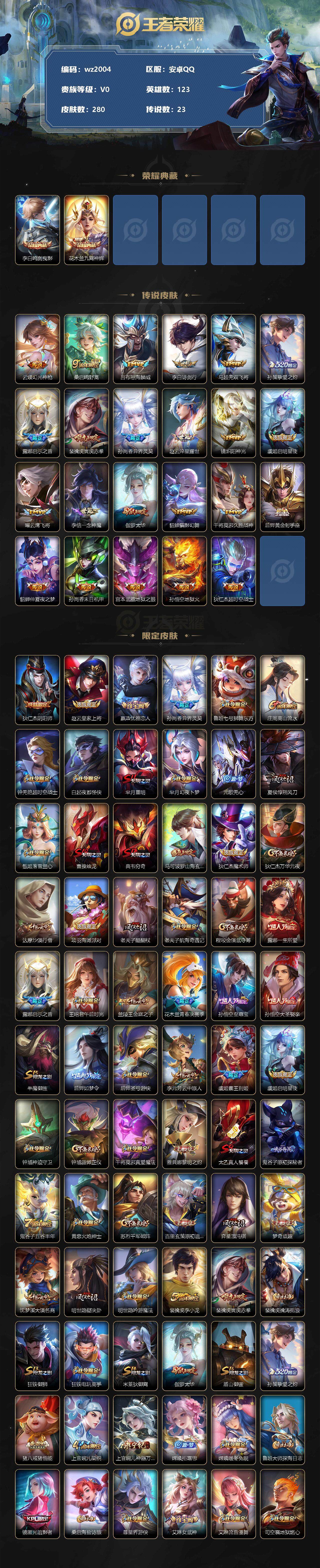 【游戏多多】【王者荣耀】【编号:3339042】【可二次实名】【wz2004】安卓Q-V0-尊贵铂金IV段位-123英雄-280皮肤-2典藏-0珍品无双-0无双-0珍品传说-23传说-78史诗 【荣耀典藏】:李白鸣剑曳影,花木兰九霄神辉 【传说皮肤】:云缨幻光神枪,桑启鸣野蒿,吕布怒海麟威,李白诗剑行,马超无双飞将,孙策挚爱之约,露娜启示之音,裴擒虎寅虎赤拳,孙尚香异界灵契,赵云淬星耀世,镜炽阳神光,虞姬启明星使,曜云鹰飞将,李信一念神魔,伽罗太华,貂蝉猫影幻舞,干将莫邪久胜战神,后羿黄金射手座,貂蝉仲夏夜之梦,孙尚香末日机甲,宫本武藏地狱之眼,孙悟空地狱火,狄仁杰超时空战士 【限定皮肤】:狄仁杰阴阳师,赵云皇家上将,嬴政优雅恋人,孙尚香异界灵契,鲁班七号狮舞东方,庄周高山流水,钟无艳超时空战士,白起夜都怪侠,芈月重明,芈月幻夜卜梦,元歌无心,夏侯惇朔风刀,甄姬落雪兰心,曹操烛龙,典韦穷奇,马可波罗山海玄木吟,狄仁杰魔术师,狄仁杰万华元夜,达摩沙漠行僧,项羽海滩派对,老夫子醍醐杖,老夫子航海奇遇记,程咬金演武夺筹,露娜一生所爱,露娜启示之音,王昭君午后时光,兰陵王金庭之子,花木兰青春决赛季,孙悟空至尊宝,孙悟空大圣娶亲,牛魔御旌,后羿如梦令,后羿圣弓游侠,李元芳云中旅人,虞姬霸王别姬,虞姬启明星使,钟馗神迹守卫,钟馗驱傩正仪,干将莫邪真爱魔法,雅典娜黎明之约,太乙真人饕餮,鬼谷子原初探秘者,鬼谷子五谷丰年,黄忠火炮绅士,苏烈千军破阵,百里玄策原初追逐者,弈星混沌棋,梦奇顽趣,沈梦溪大漠名商,明世隐疑决卦,明世隐吟游魔法,裴擒虎李小龙,裴擒虎寅虎赤拳,裴擒虎擒涛扼浪,狂铁御狮,狂铁电玩高手,米莱狄御霄,伽罗太华,盾山御銮,孙策挚爱之约,猪八戒猪悟能,上官婉儿梁祝,上官婉儿神器万象笔,嫦娥拒霜思,嫦娥暖冬兔眠,鲁班大师探海日志,镜匿光追影者,桑启海盐诗旅,暃星界游侠,艾琳女武神,艾琳流音漫舞,司空震地狱燃心,阿古朵江河有灵,张良古海寻踪,蒙犽百解令,高渐离燃音魔法,妲己灵卜魔法,鬼谷子天穹祈灯,沈梦溪龙舞盛年,刘邦剑破天穹 【年限皮肤】:裴擒虎寅虎赤拳,伽罗太华,马超神威,马可波罗山海玄木吟 【赛季限定】:芈月重明,夏侯惇朔风刀,曹操烛龙,典韦穷奇,狄仁杰万华元夜,达摩沙漠行僧,老夫子醍醐杖,程咬金演武夺筹,兰陵王金庭之子,张良古海寻踪,牛魔御旌,李元芳云中旅人,钟馗驱傩正仪,雅典娜黎明之约,太乙真人饕餮,鬼谷子原初探秘者,苏烈千军破阵,百里玄策原初追逐者,弈星混沌棋,梦奇顽趣,沈梦溪大漠名商,明世隐疑决卦,裴擒虎擒涛扼浪,狂铁御狮,米莱狄御霄,盾山御銮,鲁班大师探海日志,桑启海盐诗旅,鬼谷子天穹祈灯,刘邦剑破天穹 【战令限定】:鲁班七号狮舞东方,钟无艳超时空战士,白起夜都怪侠,芈月幻夜卜梦,甄姬落雪兰心,老夫子航海奇遇记,王昭君午后时光,艾琳流音漫舞,后羿圣弓游侠,钟馗神迹守卫,干将莫邪真爱魔法,黄忠火炮绅士,明世隐吟游魔法,狂铁电玩高手,嫦娥暖冬兔眠,司空震地狱燃心,暃星界游侠,高渐离燃音魔法,妲己灵卜魔法 【史诗皮肤】:鲁班七号电玩小子,露娜紫霞仙子,阿轲暗夜猫娘,赵云皇家上将,赵云未来纪元,甄姬冰雪圆舞曲,王昭君偶像歌手,狄仁杰魔术师,宫本武藏鬼剑武藏,孙尚香水果甜心,嬴政优雅恋人,妲己魅力维加斯,墨子龙骑士,墨子金属风暴,吕布圣诞狂欢,刘禅绅士熊喵,曹操幽灵船长,李白千年之狐,张飞乱世虎臣,韩信白龙吟,虞姬霸王别姬,孙悟空至尊宝,花木兰水晶猎龙者,刘邦德古拉伯爵,夏侯惇乘风破浪,小乔缤纷独角兽,兰陵王暗隐猎兽者,亚瑟心灵战警,雅典娜冰冠公主,安琪拉心灵骇客,花木兰青春决赛季,百里守约特工魅影,铠曙光守护者,刘禅天才门将,李元芳逐浪之夏,程咬金功夫厨神,白起星夜王子,阿轲节奏热浪,孙策猫狗日记,露娜一生所爱,孙悟空大圣娶亲,鲁班七号狮舞东方,狄仁杰鹰眼统帅,上官婉儿梁祝,娜可露露晚萤,后羿如梦令,不知火舞魅语,橘右京修罗,瑶遇见神鹿,马超神威,百里玄策原初追逐者,裴擒虎李小龙,西施诗语江南,老夫子航海奇遇记,干将莫邪真爱魔法,猪八戒猪悟能,庄周高山流水,嫦娥拒霜思,镜匿光追影者,黄忠火炮绅士,雅典娜黎明之约,夏洛特永昼,澜赏金猎手,艾琳奇遇舞章,明世隐吟游魔法,狂铁电玩高手,钟无艳超时空战士,鬼谷子五谷丰年,上官婉儿神器万象笔,元歌无心,梦奇顽趣,暃星界游侠,马可波罗山海玄木吟,镜玫瑰异探,司空震地狱燃心,阿古朵江河有灵,蒙犽百解令,妲己灵卜魔法,高渐离燃音魔法 【其他皮肤】:项羽海滩派对,韩信教廷特使,韩信街头霸王,阿轲爱心护理,达摩大发明家,赵云白执事,赵云忍炎影,芈月红桃皇后,艾琳女武神,白起白色死神,牛魔西部大镖客,扁鹊化身博士,宫本武藏未来纪元,安琪拉玩偶对对碰,孙膑天使之翼,妲己少女阿狸,典韦黄金武士,亚瑟死亡骑士,达摩拳王,花木兰兔女郎,张飞五福同心,甄姬花好人间,