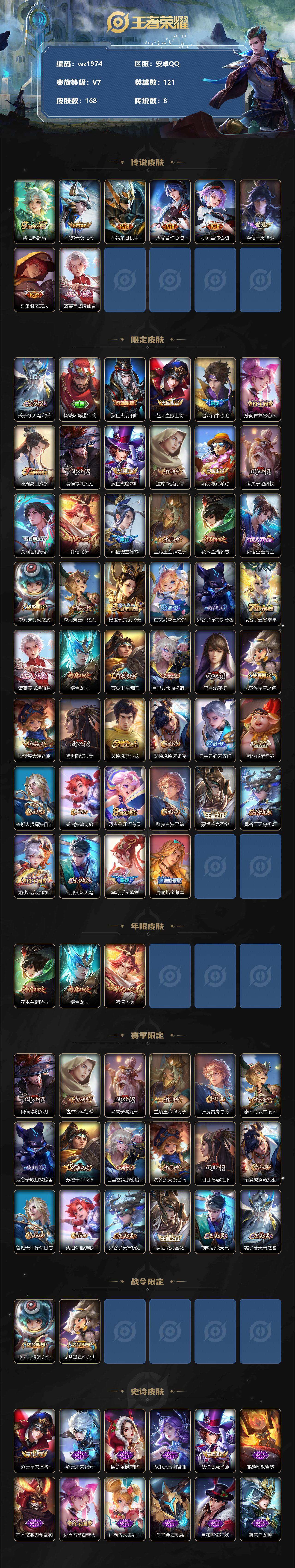 【游戏多多】【王者荣耀】【编号:3339054】【可二次实名】【wz1974】安卓Q-V7-至尊星耀II段位-121英雄-168皮肤-0典藏-0珍品无双-0无双-0珍品传说-8传说-45史诗 【英雄全皮】:影全皮 【传说皮肤】:桑启鸣野蒿,马超无双飞将,孙策末日机甲,周瑜音你心动,小乔音你心动,李信一念神魔,刘备时之恋人,诸葛亮武陵仙君 【限定皮肤】:姜子牙天穹之誓,杨戬破阵退雄兵,狄仁杰阴阳师,赵云皇家上将,赵云百木心枪,孙尚香蔷薇恋人,庄周高山流水,夏侯惇朔风刀,狄仁杰魔术师,达摩沙漠行僧,项羽海滩派对,老夫子醍醐杖,关羽百相守梦,韩信飞衡,韩信傲雪梅枪,兰陵王金庭之子,花木兰瑞麟志,孙悟空至尊宝,李元芳银河之约,李元芳云中旅人,杨玉环遇见飞天,蔡文姬繁星吟游,鬼谷子原初探秘者,鬼谷子五谷丰年,诸葛亮武陵仙君,铠青龙志,苏烈千军破阵,百里玄策原初追逐者,弈星混沌棋,沈梦溪星空之诺,沈梦溪大漠名商,明世隐疑决卦,裴擒虎李小龙,裴擒虎擒涛扼浪,云中君纤云弄巧,猪八戒猪悟能,鲁班大师探海日志,桑启海盐诗旅,阿古朵江河有灵,张良古海寻踪,蒙恬荣光圣徽,鬼谷子天穹祈灯,姬小满妄想食味,刘邦剑破天穹,芈月浮光幕影,周瑜熔金海岸 【年限皮肤】:花木兰瑞麟志,铠青龙志,韩信飞衡 【赛季限定】:夏侯惇朔风刀,达摩沙漠行僧,老夫子醍醐杖,兰陵王金庭之子,张良古海寻踪,李元芳云中旅人,鬼谷子原初探秘者,苏烈千军破阵,百里玄策原初追逐者,弈星混沌棋,沈梦溪大漠名商,明世隐疑决卦,裴擒虎擒涛扼浪,鲁班大师探海日志,桑启海盐诗旅,鬼谷子天穹祈灯,蒙恬荣光圣徽,刘邦剑破天穹,姜子牙天穹之誓 【战令限定】:李元芳银河之约,沈梦溪星空之诺 【史诗皮肤】:赵云皇家上将,赵云未来纪元,貂蝉圣诞恋歌,甄姬冰雪圆舞曲,狄仁杰魔术师,廉颇地狱岩魂,宫本武藏鬼剑武藏,孙尚香蔷薇恋人,孙尚香水果甜心,墨子金属风暴,吕布圣诞狂欢,韩信白龙吟,孙悟空至尊宝,花木兰水晶猎龙者,小乔缤纷独角兽,兰陵王暗隐猎兽者,百里守约特工魅影,蔡文姬舞动绿茵,程咬金功夫厨神,白起星夜王子,杨玉环遇见飞天,铠青龙志,花木兰瑞麟志,狄仁杰鹰眼统帅,蔡文姬繁星吟游,李元芳银河之约,韩信飞衡,百里玄策原初追逐者,裴擒虎李小龙,云中君纤云弄巧,杨戬天秀启明,猪八戒猪悟能,庄周高山流水,韩信傲雪梅枪,赵云百木心枪,澜赏金猎手,鬼谷子五谷丰年,关羽百相守梦,阿古朵江河有灵,蒙恬荣光圣徽,姬小满妄想食味,芈月浮光幕影,牛魔星界战将,狂铁龙之律动,黄忠百相守梦 【其他皮肤】:项羽海滩派对,韩信教廷特使,韩信街头霸王,露娜哥特玫瑰,阿轲爱心护理,达摩大发明家,赵云忍炎影,芈月红桃皇后,白起白色死神,牛魔西部大镖客,武则天东方不败,扁鹊化身博士,扁鹊救世之瞳,宫本武藏未来纪元,孙膑天使之翼,妲己少女阿狸,典韦黄金武士,亚瑟死亡骑士,达摩拳王,张飞五福同心,甄姬花好人间,刘备万事如意,宫本武藏万象初新,后羿阿尔法小队,狄仁杰阴阳师,刘备纽约教父,刘备汉昭烈帝,关羽龙腾万里,墨子进击墨子号,狂铁命运角斗场,老夫子功夫老勺,牛魔制霸全明星,孙尚香沉稳之力,诸葛亮掌控之力,李白敏锐之力,苏烈坚韧之力,大乔守护之力,吕布野性能量,夏侯惇朔风刀,沈梦溪星空之诺,弈星混沌棋,哪吒次元突破,明世隐疑决卦,盾山圆桌骑士,老夫子醍醐杖,鬼谷子原初探秘者,刘禅秘密基地,苏烈千军破阵,达摩沙漠行僧,兰陵王金庭之子,米莱狄契约魔法,沈梦溪大漠名商,蒙犽胡桃狂想曲,蒙恬蔚蓝守将,李元芳云中旅人,桑启海盐诗旅,猪八戒潮玩探月行,裴擒虎擒涛扼浪,太乙真人劲辣红锅,鲁班大师探海日志,李元芳妄想特派,张良古海寻踪,后羿完美运算,鬼谷子天穹祈灯,嫦娥漠中幻影,廉颇功夫炙烤,刘邦剑破天穹,杨戬破阵退雄兵,姜子牙天穹之誓,周瑜熔金海岸,东皇太一噬灭天穹,干将莫邪雾都夜雨,苍苍林狼骑,太乙真人谧流熔炉,典韦铁骨偃魂,影魅影绮裳,西施雪境奇遇,姜子牙星梦巡礼,钟馗虚灵犬护,甄姬逆浪荇歌,莱西奥踏浪烽翎,哪吒罗小黑战记,鲁班七号福禄兄弟,鲁班七号木偶奇遇记,钟无艳生化警戒,王昭君精灵公主,曹操超能战警,张良一千零一夜,孙悟空西部大镖客,后羿精灵王,刘禅英喵野望,夏侯惇战争骑士,马可波罗激情绿茵,哪吒三太子,诸葛亮星航指挥官,黄忠芝加哥教父,大乔伊势巫女,干将莫邪第七人偶,鬼谷子阿摩司公爵,铠龙域领主,百里守约绝影神枪,百里玄策威尼斯狂欢,苏烈爱与和平,女娲尼罗河女神,明世隐占星师,裴擒虎街头旋风,孙策海之征途,司马懿魇语军师,李信灼热之刃,嫦娥露花倒影,马超幸存者,澜孤猎,司空震启蛰,暃碧珀绯影,桑启画中游 【内测皮肤】:孙尚香蔷薇恋人 【营地ID】:2129659727