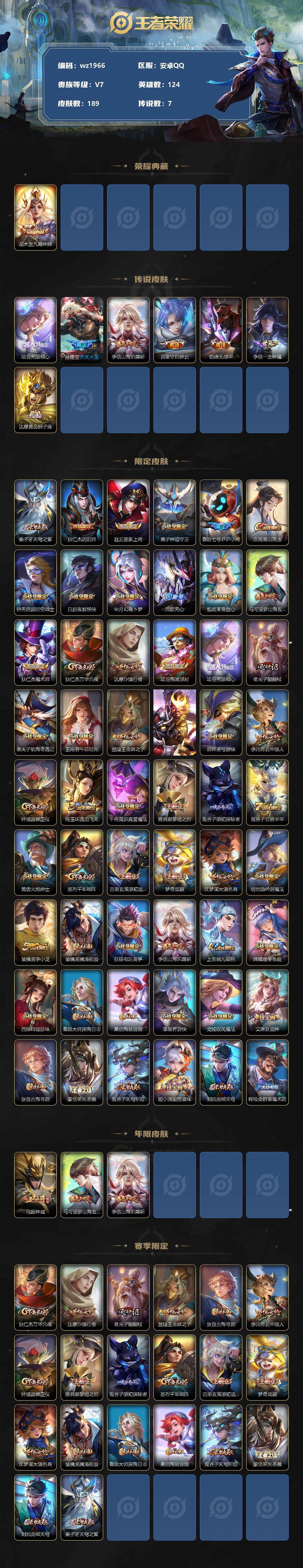 【游戏多多】【王者荣耀】【编号:3339061】【可二次实名】【wz1966】安卓Q-V7-最强王者段位-124英雄-189皮肤-1典藏-0珍品无双-0无双-0珍品传说-7传说-52史诗 【英雄全皮】:李信全皮,蒙恬全皮,戈娅全皮 【荣耀典藏】:花木兰九霄神辉 【传说皮肤】:项羽无限倾心,孙悟空齐天大圣,李信山海炽霜斩,百里守约碎云,铠绛天战甲,李信一念神魔,达摩黄金狮子座 【限定皮肤】:姜子牙天穹之誓,狄仁杰阴阳师,赵云皇家上将,墨子神迹守卫,鲁班七号乒乒小将,庄周高山流水,钟无艳超时空战士,白起夜都怪侠,芈月幻夜卜梦,元歌无心,甄姬落雪兰心,马可波罗山海玄木吟,狄仁杰魔术师,狄仁杰万华元夜,达摩沙漠行僧,项羽海滩派对,项羽无限倾心,老夫子醍醐杖,老夫子航海奇遇记,王昭君午后时光,兰陵王金庭之子,孙悟空齐天大圣,后羿圣弓游侠,李元芳云中旅人,钟馗驱傩正仪,杨玉环遇见飞天,干将莫邪真爱魔法,雅典娜黎明之约,鬼谷子原初探秘者,鬼谷子五谷丰年,黄忠火炮绅士,苏烈千军破阵,百里玄策原初追逐者,梦奇顽趣,沈梦溪大漠名商,明世隐吟游魔法,裴擒虎李小龙,裴擒虎擒涛扼浪,狂铁电玩高手,李信山海炽霜斩,上官婉儿梁祝,嫦娥暖冬兔眠,西施玲珑珍味,鲁班大师探海日志,桑启海盐诗旅,暃星界游侠,戈娅驭风魔法,艾琳女武神,张良古海寻踪,蒙恬荣光圣徽,鬼谷子天穹祈灯,姬小满妄想食味,刘邦剑破天穹,程咬金群星魔术团 【年限皮肤】:马超神威,马可波罗山海玄木吟,李信山海炽霜斩 【赛季限定】:狄仁杰万华元夜,达摩沙漠行僧,老夫子醍醐杖,兰陵王金庭之子,张良古海寻踪,李元芳云中旅人,钟馗驱傩正仪,雅典娜黎明之约,鬼谷子原初探秘者,苏烈千军破阵,百里玄策原初追逐者,梦奇顽趣,沈梦溪大漠名商,裴擒虎擒涛扼浪,鲁班大师探海日志,桑启海盐诗旅,鬼谷子天穹祈灯,蒙恬荣光圣徽,刘邦剑破天穹,姜子牙天穹之誓 【战令限定】:墨子神迹守卫,钟无艳超时空战士,白起夜都怪侠,芈月幻夜卜梦,甄姬落雪兰心,老夫子航海奇遇记,王昭君午后时光,后羿圣弓游侠,干将莫邪真爱魔法,黄忠火炮绅士,明世隐吟游魔法,狂铁电玩高手,嫦娥暖冬兔眠,西施玲珑珍味,暃星界游侠,戈娅驭风魔法 【史诗皮肤】:项羽苍穹之光,赵云皇家上将,赵云未来纪元,甄姬冰雪圆舞曲,狄仁杰魔术师,廉颇地狱岩魂,宫本武藏鬼剑武藏,孙尚香水果甜心,嬴政摇滚巨星,妲己女仆咖啡,墨子金属风暴,曹操幽灵船长,李白千年之狐,吕布末日机甲,花木兰水晶猎龙者,刘邦德古拉伯爵,夏侯惇乘风破浪,小乔缤纷独角兽,诸葛亮黄金分割率,雅典娜冰冠公主,百里守约特工魅影,刘禅天才门将,李元芳逐浪之夏,程咬金功夫厨神,白起星夜王子,杨玉环遇见飞天,狄仁杰鹰眼统帅,上官婉儿梁祝,橘右京修罗,马超神威,百里玄策原初追逐者,裴擒虎李小龙,老夫子航海奇遇记,鲁班七号乒乒小将,干将莫邪真爱魔法,安琪拉时之奇旅,庄周高山流水,黄忠火炮绅士,雅典娜黎明之约,明世隐吟游魔法,狂铁电玩高手,钟无艳超时空战士,鬼谷子五谷丰年,元歌无心,梦奇顽趣,暃星界游侠,马可波罗山海玄木吟,戈娅驭风魔法,周瑜雪夜绮愿,蒙恬荣光圣徽,姬小满妄想食味,阿轲化蝶舞 【其他皮肤】:项羽海滩派对,韩信教廷特使,韩信街头霸王,露娜哥特玫瑰,达摩大发明家,赵云忍炎影,芈月红桃皇后,艾琳女武神,白起白色死神,牛魔西部大镖客,安琪拉玩偶对对碰,妲己少女阿狸,花木兰兔女郎,张飞五福同心,甄姬花好人间,刘备万事如意,宫本武藏万象初新,后羿阿尔法小队,狄仁杰阴阳师,刘备纽约教父,刘备汉昭烈帝,关羽龙腾万里,钟无艳海滩丽影,宫本武藏霸王丸,王昭君幻想奇妙夜,老夫子功夫老勺,孙尚香沉稳之力,诸葛亮掌控之力,李白敏锐之力,鬼谷子幻乐之宴,大乔守护之力,明世隐虹云星官,小乔丁香结,吕布野性能量,孙膑归虚梦演,沈梦溪鲨炮海盗猫,哪吒次元突破,盾山圆桌骑士,老夫子醍醐杖,狂铁特工战影,鬼谷子原初探秘者,狄仁杰万华元夜,刘禅秘密基地,杨戬次元傲视,钟馗驱傩正仪,墨子神迹守卫,鲁班大师乓乓大师,苏烈千军破阵,后羿圣弓游侠,马可波罗潮玩牛仔,达摩沙漠行僧,芈月幻夜卜梦,程咬金无双福将,白起夜都怪侠,兰陵王金庭之子,刘禅唤灵魔甲,王昭君午后时光,沈梦溪大漠名商,蒙恬蔚蓝守将,甄姬落雪兰心,李元芳云中旅人,戈娅危途狂花,桑启海盐诗旅,嫦娥暖冬兔眠,猪八戒潮玩探月行,牛魔牛运亨通,赵怀真太极少年,裴擒虎擒涛扼浪,太乙真人劲辣红锅,鲁班大师探海日志,西施玲珑珍味,姬小满零食大作战,李元芳妄想特派,哪吒热血海滩,张良古海寻踪,后羿完美运算,鬼谷子天穹祈灯,廉颇功夫炙烤,刘邦剑破天穹,程咬金群星魔术团,姜子牙天穹之誓,苍苍林狼骑,太乙真人谧流熔炉,西施雪境奇遇,姜子牙星梦巡礼,东皇太一金福满堂,少司缘灵卦秘语,戈娅玫蓝誓约,钟馗虚灵犬护,露娜命运加冕,甄姬逆浪荇歌,鲁班七号福禄兄弟,高渐离金属狂潮,露娜绯红