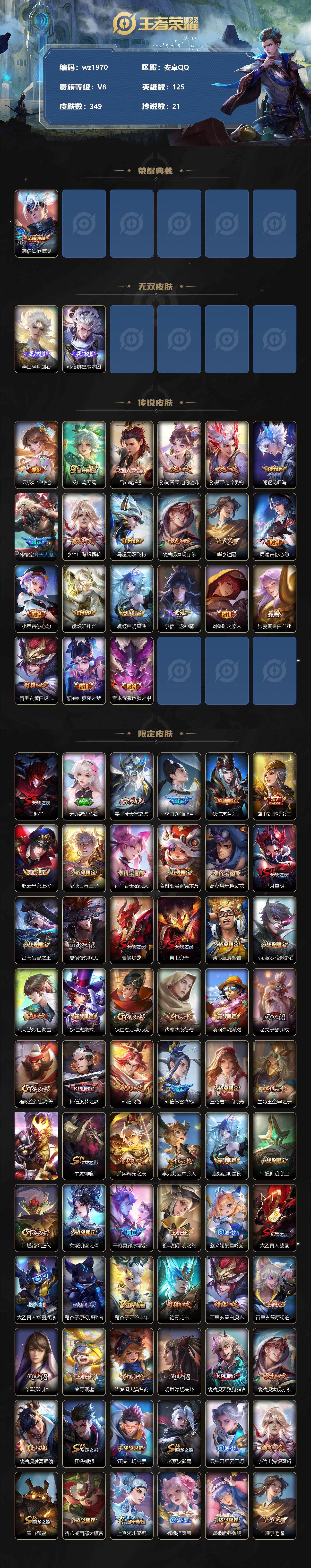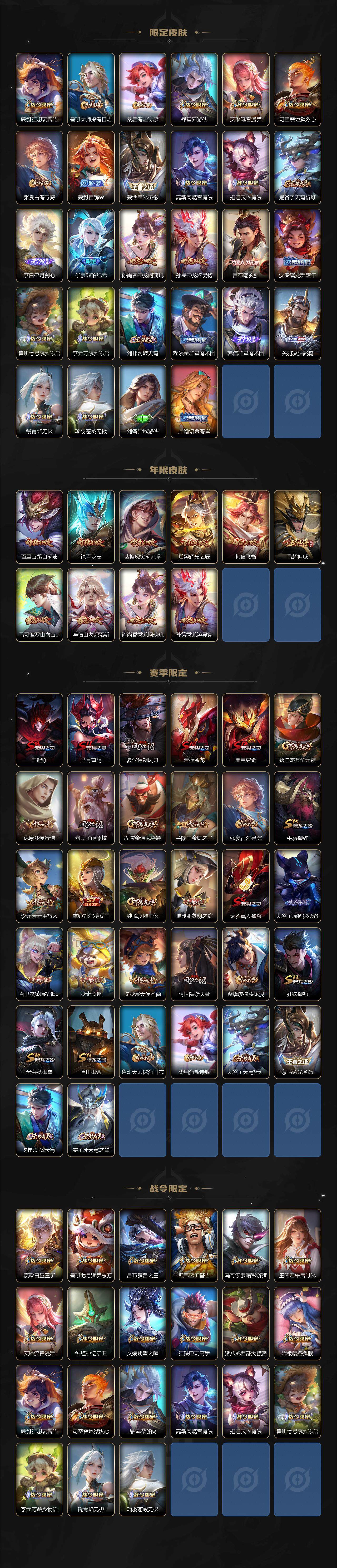 【游戏多多】【王者荣耀】【编号:3339064】【可二次实名】【wz1970】安卓Q-V8-最强王者段位-125英雄-349皮肤-1典藏-0珍品无双-2无双-0珍品传说-21传说-100史诗 【英雄全皮】:韩信全皮,钟馗全皮,鬼谷子全皮,狂铁全皮,李信全皮,蒙恬全皮,空空儿全皮,影全皮 【荣耀典藏】:韩信弑枪猎影 【无双皮肤】:李白碎月剑心,韩信群星魔术团 【传说皮肤】:云缨幻光神枪,桑启鸣野蒿,吕布曦玄引,孙尚香乘龙问璇玑,孙策乘龙淬吴钩,澜逐花归海,孙悟空齐天大圣,李信山海炽霜斩,马超无双飞将,裴擒虎寅虎赤拳,曜李逍遥 ,周瑜音你心动,小乔音你心动,镜炽阳神光,虞姬启明星使,李信一念神魔,刘备时之恋人,张良黄金白羊座,百里玄策白虎志,貂蝉仲夏夜之梦,宫本武藏地狱之眼 【限定皮肤】:白起狰,大乔绒语心约,姜子牙天穹之誓,李白谪仙醉月,狄仁杰阴阳师,虞姬凯尔特女王,赵云皇家上将,嬴政白昼王子,孙尚香蔷薇恋人,鲁班七号狮舞东方,高渐离玩趣恶龙,芈月重明,吕布猎兽之王,夏侯惇朔风刀,曹操烛龙,典韦穷奇,典韦蓝屏警告,马可波罗暗影游猎,马可波罗山海玄木吟,狄仁杰魔术师,狄仁杰万华元夜,达摩沙漠行僧,项羽海滩派对,老夫子醍醐杖,程咬金演武夺筹,韩信逐梦之影,韩信飞衡,韩信傲雪梅枪,王昭君午后时光,兰陵王金庭之子,孙悟空齐天大圣,牛魔御旌,后羿辉光之辰,李元芳云中旅人,虞姬启明星使,钟馗神迹守卫,钟馗驱傩正仪,女娲朔望之晖,干将莫邪冰霜恋舞曲,雅典娜黎明之约,蔡文姬繁星吟游,太乙真人饕餮,太乙真人华丽摇滚,鬼谷子原初探秘者,鬼谷子五谷丰年,铠青龙志,百里玄策白虎志,百里玄策原初追逐者,弈星混沌棋,梦奇顽趣,沈梦溪大漠名商,明世隐疑决卦,裴擒虎天狼狩猎者,裴擒虎寅虎赤拳,裴擒虎擒涛扼浪,狂铁御狮,狂铁电玩高手,米莱狄御霄,云中君纤云弄巧,李信山海炽霜斩,盾山御銮,猪八戒西部大镖客,上官婉儿梁祝,嫦娥拒霜思,嫦娥暖冬兔眠,曜李逍遥 ,蒙犽狂想玩偶喵,鲁班大师探海日志,桑启海盐诗旅,暃星界游侠,艾琳流音漫舞,司空震地狱燃心,张良古海寻踪,蒙犽百解令,蒙恬荣光圣徽,高渐离燃音魔法,妲己灵卜魔法,鬼谷子天穹祈灯,李白碎月剑心,伽罗琥珀纪元,孙尚香乘龙问璇玑,孙策乘龙淬吴钩,吕布曦玄引,沈梦溪龙舞盛年,鲁班七号蔬乡物语,李元芳蔬乡物语,刘邦剑破天穹,程咬金群星魔术团,韩信群星魔术团,关羽决胜骁骑,镜青焰无极,项羽苍威无极,刘备异域游侠,周瑜熔金海岸 【年限皮肤】:百里玄策白虎志,铠青龙志,裴擒虎寅虎赤拳,后羿辉光之辰,韩信飞衡,马超神威,马可波罗山海玄木吟,李信山海炽霜斩,孙尚香乘龙问璇玑,孙策乘龙淬吴钩 【赛季限定】:白起狰,芈月重明,夏侯惇朔风刀,曹操烛龙,典韦穷奇,狄仁杰万华元夜,达摩沙漠行僧,老夫子醍醐杖,程咬金演武夺筹,兰陵王金庭之子,张良古海寻踪,牛魔御旌,李元芳云中旅人,虞姬凯尔特女王,钟馗驱傩正仪,雅典娜黎明之约,太乙真人饕餮,鬼谷子原初探秘者,百里玄策原初追逐者,弈星混沌棋,梦奇顽趣,沈梦溪大漠名商,明世隐疑决卦,裴擒虎擒涛扼浪,狂铁御狮,米莱狄御霄,盾山御銮,鲁班大师探海日志,桑启海盐诗旅,鬼谷子天穹祈灯,蒙恬荣光圣徽,刘邦剑破天穹,姜子牙天穹之誓 【战令限定】:嬴政白昼王子,鲁班七号狮舞东方,吕布猎兽之王,典韦蓝屏警告,马可波罗暗影游猎,王昭君午后时光,艾琳流音漫舞,钟馗神迹守卫,女娲朔望之晖,狂铁电玩高手,猪八戒西部大镖客,嫦娥暖冬兔眠,蒙犽狂想玩偶喵,司空震地狱燃心,暃星界游侠,高渐离燃音魔法,妲己灵卜魔法,鲁班七号蔬乡物语,李元芳蔬乡物语,镜青焰无极,项羽苍威无极 【史诗皮肤】:鲁班七号电玩小子,项羽苍穹之光,露娜紫霞仙子,赵云皇家上将,赵云未来纪元,貂蝉圣诞恋歌,甄姬冰雪圆舞曲,王昭君偶像歌手,狄仁杰魔术师,廉颇地狱岩魂,宫本武藏鬼剑武藏,孙尚香蔷薇恋人,孙尚香水果甜心,嬴政暗夜贵公子,嬴政摇滚巨星,妲己魅力维加斯,妲己女仆咖啡,墨子龙骑士,墨子金属风暴,吕布圣诞狂欢,刘禅绅士熊喵,曹操幽灵船长,李白千年之狐,吕布末日机甲,张飞乱世虎臣,韩信白龙吟,花木兰水晶猎龙者,刘邦德古拉伯爵,韩信逐梦之影,夏侯惇乘风破浪,小乔缤纷独角兽,兰陵王暗隐猎兽者,诸葛亮黄金分割率,亚瑟心灵战警,雅典娜冰冠公主,安琪拉心灵骇客,后羿辉光之辰,百里守约特工魅影,铠曙光守护者,蔡文姬舞动绿茵,刘禅天才门将,李元芳逐浪之夏,程咬金功夫厨神,白起星夜王子,阿轲节奏热浪,嬴政白昼王子,孙策猫狗日记,大乔猫狗日记,铠青龙志,干将莫邪冰霜恋舞曲,典韦蓝屏警告,伽罗箭羽风息,裴擒虎天狼狩猎者,鲁班七号狮舞东方,狄仁杰鹰眼统帅,公孙离无限星赏官,上官婉儿梁祝,蔡文姬繁星吟游,娜可露露晚萤,韩信飞衡,小乔青蛇,不知火舞魅语,橘右京修罗,马超神威,马可波罗暗影游猎,蒙犽狂想玩偶喵,百里玄策原初追逐者,云中君纤云弄巧,
