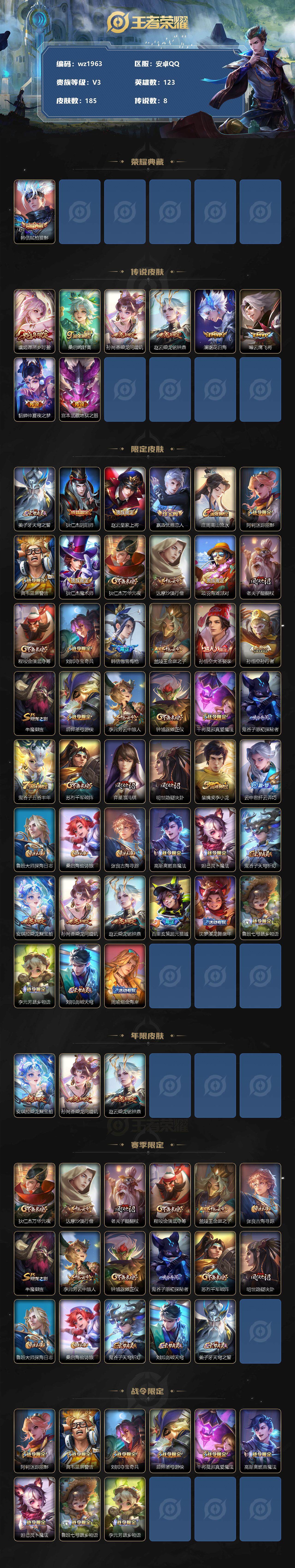 【游戏多多】【王者荣耀】【编号:3339066】【可二次实名】【wz1963】安卓Q-V3-永恒钻石V段位-123英雄-185皮肤-1典藏-0珍品无双-0无双-0珍品传说-8传说-48史诗 【荣耀典藏】:韩信弑枪猎影 【传说皮肤】:虞姬愿照岁时盈,桑启鸣野蒿,孙尚香乘龙问璇玑,赵云乘龙铭钟鼎,澜逐花归海,曜云鹰飞将,貂蝉仲夏夜之梦,宫本武藏地狱之眼 【限定皮肤】:姜子牙天穹之誓,狄仁杰阴阳师,赵云皇家上将,嬴政优雅恋人,庄周高山流水,阿轲迷踪丽影,典韦蓝屏警告,狄仁杰魔术师,狄仁杰万华元夜,达摩沙漠行僧,项羽海滩派对,老夫子醍醐杖,程咬金演武夺筹,刘邦夺宝奇兵,韩信傲雪梅枪,兰陵王金庭之子,孙悟空大圣娶亲,孙悟空孙行者,牛魔御旌,后羿圣弓游侠,李元芳云中旅人,钟馗驱傩正仪,干将莫邪真爱魔法,鬼谷子原初探秘者,鬼谷子五谷丰年,苏烈千军破阵,弈星混沌棋,明世隐疑决卦,裴擒虎李小龙,云中君纤云弄巧,鲁班大师探海日志,桑启海盐诗旅,张良古海寻踪,高渐离燃音魔法,妲己灵卜魔法,鬼谷子天穹祈灯,安琪拉乘龙聚宝船,孙尚香乘龙问璇玑,赵云乘龙铭钟鼎,百里玄策超元猎域,沈梦溪龙舞盛年,鲁班七号蔬乡物语,李元芳蔬乡物语,刘邦剑破天穹,周瑜熔金海岸 【年限皮肤】:安琪拉乘龙聚宝船,孙尚香乘龙问璇玑,赵云乘龙铭钟鼎 【赛季限定】:狄仁杰万华元夜,达摩沙漠行僧,老夫子醍醐杖,程咬金演武夺筹,兰陵王金庭之子,张良古海寻踪,牛魔御旌,李元芳云中旅人,钟馗驱傩正仪,鬼谷子原初探秘者,苏烈千军破阵,弈星混沌棋,明世隐疑决卦,鲁班大师探海日志,桑启海盐诗旅,鬼谷子天穹祈灯,刘邦剑破天穹,姜子牙天穹之誓 【战令限定】:阿轲迷踪丽影,典韦蓝屏警告,刘邦夺宝奇兵,后羿圣弓游侠,干将莫邪真爱魔法,高渐离燃音魔法,妲己灵卜魔法,鲁班七号蔬乡物语,李元芳蔬乡物语 【史诗皮肤】:鲁班七号电玩小子,赵云皇家上将,赵云未来纪元,貂蝉圣诞恋歌,甄姬冰雪圆舞曲,狄仁杰魔术师,廉颇地狱岩魂,宫本武藏鬼剑武藏,孙尚香水果甜心,嬴政优雅恋人,嬴政摇滚巨星,妲己魅力维加斯,妲己女仆咖啡,墨子金属风暴,吕布圣诞狂欢,李白千年之狐,张飞乱世虎臣,花木兰水晶猎龙者,刘邦德古拉伯爵,夏侯惇乘风破浪,小乔缤纷独角兽,兰陵王暗隐猎兽者,诸葛亮黄金分割率,百里守约特工魅影,蔡文姬舞动绿茵,刘禅天才门将,阿轲节奏热浪,孙策猫狗日记,孙悟空大圣娶亲,典韦蓝屏警告,狄仁杰鹰眼统帅,娜可露露晚萤,不知火舞魅语,阿轲迷踪丽影,橘右京修罗,裴擒虎李小龙,云中君纤云弄巧,干将莫邪真爱魔法,孙悟空孙行者,庄周高山流水,韩信傲雪梅枪,鬼谷子五谷丰年,妲己灵卜魔法,高渐离燃音魔法,百里玄策超元猎域,安琪拉乘龙聚宝船,鲁班七号蔬乡物语,阿轲化蝶舞,狂铁龙之律动 【其他皮肤】:项羽海滩派对,韩信教廷特使,韩信街头霸王,芈月红桃皇后,扁鹊化身博士,安琪拉玩偶对对碰,妲己少女阿狸,典韦黄金武士,亚瑟死亡骑士,甄姬花好人间,刘备万事如意,宫本武藏万象初新,狄仁杰阴阳师,刘备纽约教父,钟无艳海滩丽影,宫本武藏霸王丸,王昭君幻想奇妙夜,老夫子功夫老勺,孙尚香沉稳之力,诸葛亮掌控之力,李白敏锐之力,大乔守护之力,明世隐虹云星官,牛魔御旌,小乔丁香结,沈梦溪鲨炮海盗猫,姜子牙炽热元素使,弈星混沌棋,哪吒次元突破,明世隐疑决卦,刘邦夺宝奇兵,盾山圆桌骑士,老夫子醍醐杖,狂铁特工战影,鬼谷子原初探秘者,狄仁杰万华元夜,刘禅秘密基地,露娜瓷语鉴心,程咬金演武夺筹,钟馗驱傩正仪,鲁班大师乓乓大师,苏烈千军破阵,后羿圣弓游侠,达摩沙漠行僧,程咬金无双福将,兰陵王金庭之子,李元芳云中旅人,桑启海盐诗旅,海月幻泉雾影,猪八戒潮玩探月行,太乙真人劲辣红锅,莱西奥西部游侠,鲁班大师探海日志,张良古海寻踪,钟无艳聚星闪耀,亚连破局者,后羿完美运算,鬼谷子天穹祈灯,妲己灵卜魔法,朵莉亚金色潮汐,廉颇功夫炙烤,亚瑟鸿运当头,沈梦溪龙舞盛年,李元芳蔬乡物语,刘邦剑破天穹,大司命暗都幽影,姜子牙天穹之誓,周瑜熔金海岸,盘古敬我三分,东皇太一噬灭天穹,干将莫邪雾都夜雨,苍苍林狼骑,太乙真人谧流熔炉,西施雪境奇遇,姜子牙星梦巡礼,明世隐景韶洛都,刘备浪漫序章,钟馗虚灵犬护,苏烈春野闲踪,张良灵野札记,阿古朵布丁狗之约,鲁班七号福禄兄弟,高渐离金属狂潮,项羽帝国元帅,露娜绯红之刃,花木兰剑舞者,曹操超能战警,张良一千零一夜,小乔万圣前夜,孙悟空西部大镖客,后羿精灵王,刘禅英喵野望,兰陵王隐刃,李元芳特种部队,虞姬加勒比小姐,关羽天启骑士,夏侯惇战争骑士,马可波罗激情绿茵,苍维京掠夺者,杨戬埃及法老,哪吒三太子,诸葛亮星航指挥官,黄忠芝加哥教父,干将莫邪第七人偶,铠龙域领主,百里守约绝影神枪,百里玄策威尼斯狂欢,裴擒虎街头旋风,弈星踏雪寻梅,米莱狄精准探案法,元歌午夜歌剧院,司马懿魇语军师,盾山极冰防御线,伽罗花见巫女,沈梦溪棒球奇才