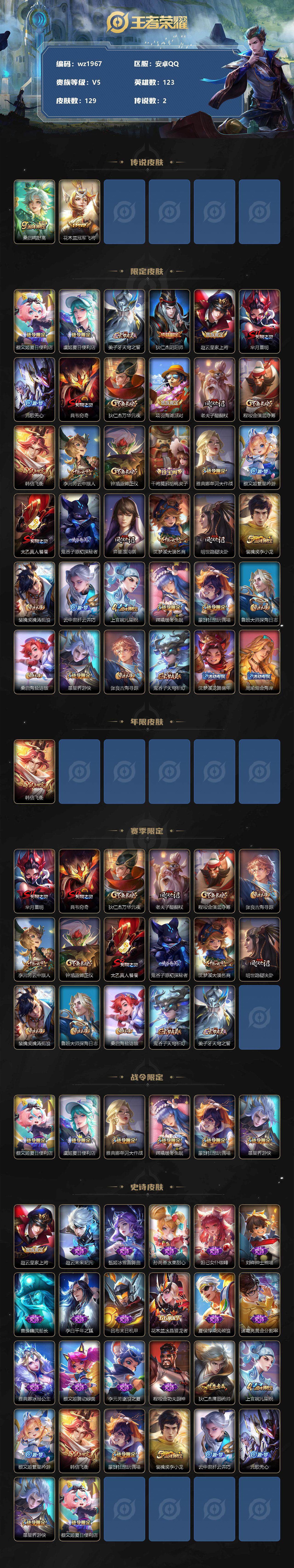 【游戏多多】【王者荣耀】【编号:3339070】【可二次实名】【wz1967】安卓Q-V5-尊贵铂金IV段位-123英雄-129皮肤-0典藏-0珍品无双-0无双-0珍品传说-2传说-26史诗 【传说皮肤】:桑启鸣野蒿,花木兰冠军飞将 【限定皮肤】:蔡文姬夏日便利店,虞姬夏日便利店,姜子牙天穹之誓,狄仁杰阴阳师,赵云皇家上将,芈月重明,元歌无心,典韦穷奇,狄仁杰万华元夜,项羽海滩派对,老夫子醍醐杖,程咬金演武夺筹,韩信飞衡,李元芳云中旅人,钟馗驱傩正仪,干将莫邪胡桃夹子,雅典娜单词大作战,蔡文姬繁星吟游,太乙真人饕餮,鬼谷子原初探秘者,弈星混沌棋,沈梦溪大漠名商,明世隐疑决卦,裴擒虎李小龙,裴擒虎擒涛扼浪,云中君纤云弄巧,上官婉儿梁祝,嫦娥暖冬兔眠,蒙犽狂想玩偶喵,鲁班大师探海日志,桑启海盐诗旅,暃星界游侠,张良古海寻踪,鬼谷子天穹祈灯,沈梦溪龙舞盛年,周瑜熔金海岸 【年限皮肤】:韩信飞衡 【赛季限定】:芈月重明,典韦穷奇,狄仁杰万华元夜,老夫子醍醐杖,程咬金演武夺筹,张良古海寻踪,李元芳云中旅人,钟馗驱傩正仪,太乙真人饕餮,鬼谷子原初探秘者,弈星混沌棋,沈梦溪大漠名商,明世隐疑决卦,裴擒虎擒涛扼浪,鲁班大师探海日志,桑启海盐诗旅,鬼谷子天穹祈灯,姜子牙天穹之誓 【战令限定】:蔡文姬夏日便利店,虞姬夏日便利店,雅典娜单词大作战,嫦娥暖冬兔眠,蒙犽狂想玩偶喵,暃星界游侠 【史诗皮肤】:赵云皇家上将,赵云未来纪元,甄姬冰雪圆舞曲,孙尚香水果甜心,妲己女仆咖啡,刘禅绅士熊喵,曹操幽灵船长,李白千年之狐,吕布末日机甲,花木兰水晶猎龙者,夏侯惇乘风破浪,诸葛亮黄金分割率,雅典娜冰冠公主,蔡文姬舞动绿茵,李元芳逐浪之夏,程咬金功夫厨神,狄仁杰鹰眼统帅,上官婉儿梁祝,蔡文姬繁星吟游,韩信飞衡,蒙犽狂想玩偶喵,裴擒虎李小龙,云中君纤云弄巧,元歌无心,暃星界游侠,蔡文姬夏日便利店 【其他皮肤】:项羽海滩派对,韩信教廷特使,露娜哥特玫瑰,达摩大发明家,赵云忍炎影,白起白色死神,扁鹊化身博士,安琪拉玩偶对对碰,妲己少女阿狸,典韦黄金武士,达摩拳王,花木兰兔女郎,宫本武藏万象初新,狄仁杰阴阳师,刘备纽约教父,关羽龙腾万里,钟无艳海滩丽影,太乙真人饕餮,王昭君幻想奇妙夜,芈月重明,狂铁命运角斗场,老夫子功夫老勺,典韦穷奇,诸葛亮掌控之力,项羽科学大爆炸,明世隐虹云星官,小乔丁香结,沈梦溪鲨炮海盗猫,弈星混沌棋,哪吒次元突破,明世隐疑决卦,盾山圆桌骑士,老夫子醍醐杖,鬼谷子原初探秘者,雅典娜单词大作战,狄仁杰万华元夜,刘禅秘密基地,杨戬次元傲视,露娜瓷语鉴心,程咬金演武夺筹,钟馗驱傩正仪,鲁班大师乓乓大师,干将莫邪胡桃夹子,沈梦溪大漠名商,李元芳云中旅人,桑启海盐诗旅,嫦娥暖冬兔眠,赵怀真太极少年,裴擒虎擒涛扼浪,太乙真人劲辣红锅,莱西奥西部游侠,鲁班大师探海日志,姬小满零食大作战,李元芳妄想特派,张良古海寻踪,后羿完美运算,鬼谷子天穹祈灯,廉颇功夫炙烤,沈梦溪龙舞盛年,姜子牙天穹之誓,周瑜熔金海岸,虞姬夏日便利店,苍苍林狼骑,典韦铁骨偃魂,西施雪境奇遇,姜子牙星梦巡礼,钟馗虚灵犬护,苏烈春野闲踪,张良灵野札记,白起死霸装,鲁班七号木偶奇遇记,貂蝉异域舞娘,老夫子潮流仙人,狄仁杰锦衣卫,曹操超能战警,小乔万圣前夜,孙悟空西部大镖客,后羿精灵王,李白范海辛,虞姬加勒比小姐,夏侯惇战争骑士,马可波罗激情绿茵,太乙真人圆桌骑士,哪吒三太子,东皇太一东海龙王,鬼谷子阿摩司公爵,铠龙域领主,百里守约绝影神枪,裴擒虎街头旋风,元歌午夜歌剧院,盾山极冰防御线,伽罗花见巫女,李信灼热之刃,上官婉儿修竹墨客,马超幸存者,西施归虚梦演,镜冰刃幻境,蒙恬秩序猎龙将,澜孤猎,司空震启蛰,云缨赤焰之缨 【内测皮肤】:干将莫邪胡桃夹子 【营地ID】:402702861
