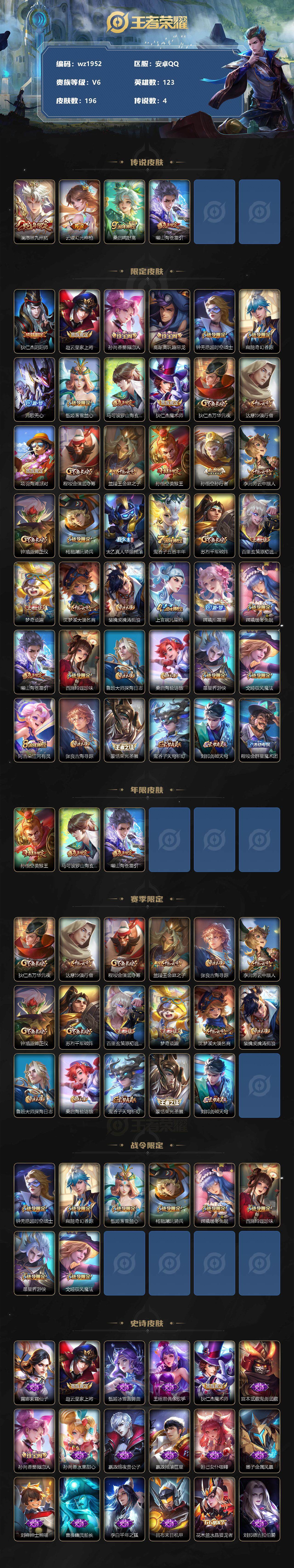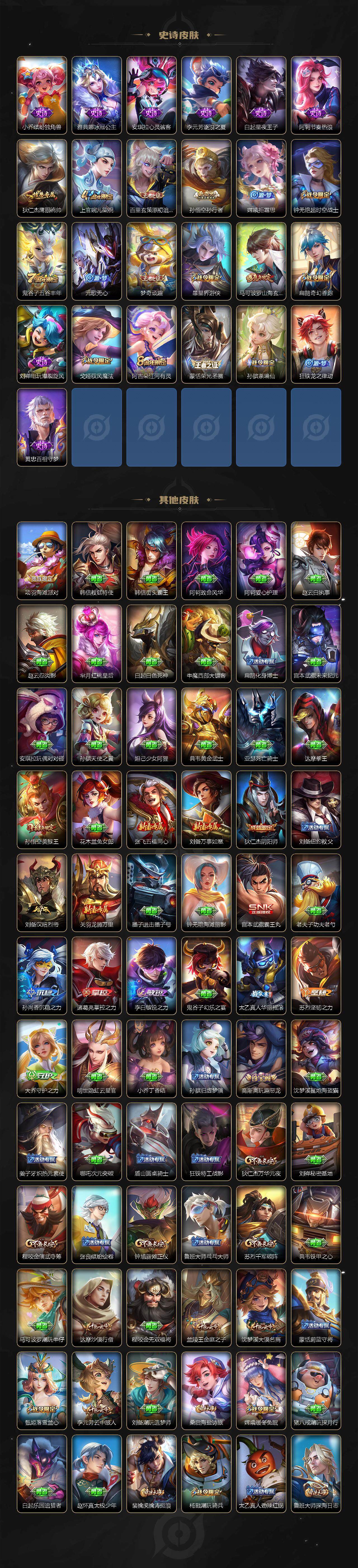 【游戏多多】【王者荣耀】【编号:3339074】【可二次实名】【wz1952】安卓Q-V6-永恒钻石II段位-123英雄-196皮肤-0典藏-0珍品无双-0无双-0珍品传说-4传说-43史诗 【英雄全皮】:蒙恬全皮 【传说皮肤】:澜愿照九州拓,云缨幻光神枪,桑启鸣野蒿,曜山海苍雷引 【限定皮肤】:狄仁杰阴阳师,赵云皇家上将,孙尚香蔷薇恋人,高渐离玩趣恶龙,钟无艳超时空战士,扁鹊奇幻香踪,元歌无心,甄姬落雪兰心,马可波罗山海玄木吟,狄仁杰魔术师,狄仁杰万华元夜,达摩沙漠行僧,项羽海滩派对,程咬金演武夺筹,兰陵王金庭之子,孙悟空美猴王,孙悟空孙行者,李元芳云中旅人,钟馗驱傩正仪,杨戬潮玩骑兵,太乙真人华丽摇滚,鬼谷子五谷丰年,苏烈千军破阵,百里玄策原初追逐者,梦奇顽趣,沈梦溪大漠名商,裴擒虎擒涛扼浪,上官婉儿梁祝,嫦娥拒霜思,嫦娥暖冬兔眠,曜山海苍雷引,西施玲珑珍味,鲁班大师探海日志,桑启海盐诗旅,暃星界游侠,戈娅驭风魔法,阿古朵江河有灵,张良古海寻踪,蒙恬荣光圣徽,鬼谷子天穹祈灯,刘邦剑破天穹,程咬金群星魔术团 【年限皮肤】:孙悟空美猴王,马可波罗山海玄木吟,曜山海苍雷引 【赛季限定】:狄仁杰万华元夜,达摩沙漠行僧,程咬金演武夺筹,兰陵王金庭之子,张良古海寻踪,李元芳云中旅人,钟馗驱傩正仪,苏烈千军破阵,百里玄策原初追逐者,梦奇顽趣,沈梦溪大漠名商,裴擒虎擒涛扼浪,鲁班大师探海日志,桑启海盐诗旅,鬼谷子天穹祈灯,蒙恬荣光圣徽,刘邦剑破天穹 【战令限定】:钟无艳超时空战士,扁鹊奇幻香踪,甄姬落雪兰心,杨戬潮玩骑兵,嫦娥暖冬兔眠,西施玲珑珍味,暃星界游侠,戈娅驭风魔法 【史诗皮肤】:露娜紫霞仙子,赵云皇家上将,甄姬冰雪圆舞曲,王昭君偶像歌手,狄仁杰魔术师,宫本武藏鬼剑武藏,孙尚香蔷薇恋人,孙尚香水果甜心,嬴政暗夜贵公子,嬴政摇滚巨星,妲己女仆咖啡,墨子金属风暴,刘禅绅士熊喵,曹操幽灵船长,李白千年之狐,吕布末日机甲,花木兰水晶猎龙者,刘邦德古拉伯爵,小乔缤纷独角兽,雅典娜冰冠公主,安琪拉心灵骇客,李元芳逐浪之夏,白起星夜王子,阿轲节奏热浪,狄仁杰鹰眼统帅,上官婉儿梁祝,百里玄策原初追逐者,孙悟空孙行者,嫦娥拒霜思,钟无艳超时空战士,鬼谷子五谷丰年,元歌无心,梦奇顽趣,暃星界游侠,马可波罗山海玄木吟,扁鹊奇幻香踪,刘禅电玩爆裂旋风,戈娅驭风魔法,阿古朵江河有灵,蒙恬荣光圣徽,孙膑茶境仙,狂铁龙之律动,黄忠百相守梦 【其他皮肤】:项羽海滩派对,韩信教廷特使,韩信街头霸王,阿轲致命风华,阿轲爱心护理,赵云白执事,赵云忍炎影,芈月红桃皇后,白起白色死神,牛魔西部大镖客,扁鹊化身博士,宫本武藏未来纪元,安琪拉玩偶对对碰,孙膑天使之翼,妲己少女阿狸,典韦黄金武士,亚瑟死亡骑士,达摩拳王,孙悟空美猴王,花木兰兔女郎,张飞五福同心,刘备万事如意,狄仁杰阴阳师,刘备纽约教父,刘备汉昭烈帝,关羽龙腾万里,墨子进击墨子号,钟无艳海滩丽影,宫本武藏霸王丸,老夫子功夫老勺,孙尚香沉稳之力,诸葛亮掌控之力,李白敏锐之力,鬼谷子幻乐之宴,太乙真人华丽摇滚,苏烈坚韧之力,大乔守护之力,明世隐虹云星官,小乔丁香结,孙膑归虚梦演,高渐离玩趣恶龙,沈梦溪鲨炮海盗猫,姜子牙炽热元素使,哪吒次元突破,盾山圆桌骑士,狂铁特工战影,狄仁杰万华元夜,刘禅秘密基地,程咬金演武夺筹,张良缤纷绘卷,钟馗驱傩正仪,鲁班大师乓乓大师,苏烈千军破阵,典韦铁甲之心,马可波罗潮玩牛仔,达摩沙漠行僧,程咬金无双福将,兰陵王金庭之子,沈梦溪大漠名商,蒙恬蔚蓝守将,甄姬落雪兰心,李元芳云中旅人,刘备潮玩造梦师,桑启海盐诗旅,嫦娥暖冬兔眠,猪八戒潮玩探月行,白起乐园追猎者,赵怀真太极少年,裴擒虎擒涛扼浪,杨戬潮玩骑兵,太乙真人劲辣红锅,鲁班大师探海日志,西施玲珑珍味,姬小满零食大作战,李元芳妄想特派,哪吒热血海滩,张良古海寻踪,钟无艳聚星闪耀,后羿完美运算,鬼谷子天穹祈灯,海诺时空谍影,廉颇功夫炙烤,钟无艳春野之旅,刘邦剑破天穹,程咬金群星魔术团,大司命暗都幽影,东皇太一噬灭天穹,苍苍林狼骑,太乙真人谧流熔炉,典韦铁骨偃魂,马超访茗客,西施雪境奇遇,姜子牙星梦巡礼,东皇太一金福满堂,达摩爆裂喵拳,少司缘灵卦秘语,明世隐景韶洛都,戈娅玫蓝誓约,刘备浪漫序章,钟馗虚灵犬护,张良灵野札记,阿古朵布丁狗之约,露娜命运加冕,白起死霸装,甄姬逆浪荇歌,云中君云械蓝图,庄周锦麟游梦,莱西奥踏浪烽翎,鲁班七号福禄兄弟,鲁班七号木偶奇遇记,高渐离金属狂潮,项羽帝国元帅,露娜绯红之刃,貂蝉异域舞娘,老夫子潮流仙人,狄仁杰锦衣卫,孙膑未来旅行,孙悟空西部大镖客,周瑜海军大将,后羿精灵王,刘禅英喵野望,李白范海辛,钟馗地府判官,李元芳特种部队,马可波罗激情绿茵,苍维京掠夺者,杨戬埃及法老,黄忠芝加哥教父,大乔伊势巫女,鬼谷子阿摩司公爵,铠龙域领主,百里守约绝影神枪,百里玄策威尼斯狂欢