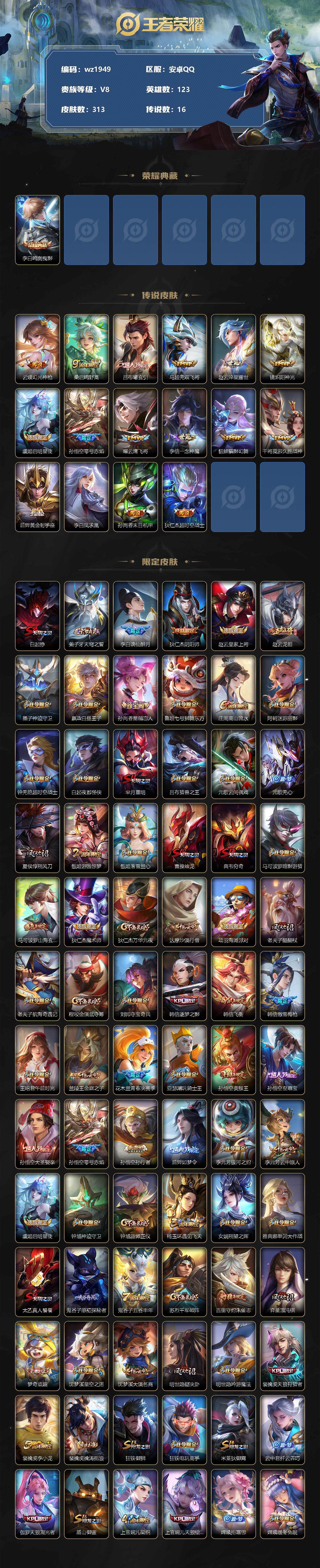 【游戏多多】【王者荣耀】【编号:3339075】【可二次实名】【wz1949】安卓Q-V8-最强王者段位-123英雄-313皮肤-1典藏-0珍品无双-0无双-0珍品传说-16传说-94史诗 【英雄全皮】:戈娅全皮 【荣耀典藏】:李白鸣剑曳影 【传说皮肤】:云缨幻光神枪,桑启鸣野蒿,吕布曦玄引,马超无双飞将,赵云淬星耀世,镜炽阳神光,虞姬启明星使,孙悟空零号赤焰,曜云鹰飞将,李信一念神魔,貂蝉猫影幻舞,干将莫邪久胜战神,后羿黄金射手座,李白凤求凰,孙尚香末日机甲,狄仁杰超时空战士 【限定皮肤】:白起狰,姜子牙天穹之誓,李白谪仙醉月,狄仁杰阴阳师,赵云皇家上将,赵云龙胆,墨子神迹守卫,嬴政白昼王子,孙尚香蔷薇恋人,鲁班七号狮舞东方,庄周高山流水,阿轲迷踪丽影,钟无艳超时空战士,白起夜都怪侠,芈月重明,吕布猎兽之王,元歌云间偶戏,元歌无心,夏侯惇朔风刀,甄姬游园惊梦,甄姬落雪兰心,曹操烛龙,典韦穷奇,马可波罗暗影游猎,马可波罗山海玄木吟,狄仁杰魔术师,狄仁杰万华元夜,达摩沙漠行僧,项羽海滩派对,老夫子醍醐杖,老夫子航海奇遇记,程咬金演武夺筹,刘邦夺宝奇兵,韩信逐梦之影,韩信飞衡,韩信傲雪梅枪,王昭君午后时光,兰陵王金庭之子,花木兰青春决赛季,亚瑟潮玩骑士王,孙悟空美猴王,孙悟空至尊宝,孙悟空大圣娶亲,孙悟空零号赤焰,孙悟空孙行者,后羿如梦令,李元芳银河之约,李元芳云中旅人,虞姬启明星使,钟馗神迹守卫,钟馗驱傩正仪,杨玉环遇见飞天,女娲朔望之晖,雅典娜单词大作战,太乙真人饕餮,鬼谷子原初探秘者,鬼谷子五谷丰年,苏烈千军破阵,百里守约朱雀志,弈星混沌棋,梦奇顽趣,沈梦溪星空之诺,沈梦溪大漠名商,明世隐疑决卦,明世隐吟游魔法,裴擒虎天狼狩猎者,裴擒虎李小龙,裴擒虎擒涛扼浪,狂铁御狮,狂铁电玩高手,米莱狄御霄,云中君纤云弄巧,伽罗天狼溯光者,盾山御銮,上官婉儿梁祝,上官婉儿天狼绘梦者,嫦娥拒霜思,嫦娥暖冬兔眠,西施玲珑珍味,蒙犽狂想玩偶喵,鲁班大师探海日志,桑启海盐诗旅,暃星界游侠,戈娅驭风魔法,艾琳女武神,艾琳流音漫舞,司空震地狱燃心,阿古朵江河有灵,张良古海寻踪,蒙犽百解令,高渐离燃音魔法,妲己灵卜魔法,鬼谷子天穹祈灯,安琪拉乘龙聚宝船,吕布曦玄引,鲁班七号蔬乡物语,李元芳蔬乡物语,刘邦剑破天穹 【年限皮肤】:百里守约朱雀志,孙悟空美猴王,李白凤求凰,韩信飞衡,马超神威,赵云龙胆,马可波罗山海玄木吟,安琪拉乘龙聚宝船 【赛季限定】:白起狰,芈月重明,夏侯惇朔风刀,曹操烛龙,典韦穷奇,狄仁杰万华元夜,达摩沙漠行僧,老夫子醍醐杖,程咬金演武夺筹,兰陵王金庭之子,张良古海寻踪,李元芳云中旅人,钟馗驱傩正仪,太乙真人饕餮,鬼谷子原初探秘者,苏烈千军破阵,弈星混沌棋,梦奇顽趣,沈梦溪大漠名商,明世隐疑决卦,裴擒虎擒涛扼浪,狂铁御狮,米莱狄御霄,盾山御銮,鲁班大师探海日志,桑启海盐诗旅,鬼谷子天穹祈灯,刘邦剑破天穹,姜子牙天穹之誓 【战令限定】:墨子神迹守卫,嬴政白昼王子,鲁班七号狮舞东方,阿轲迷踪丽影,钟无艳超时空战士,白起夜都怪侠,吕布猎兽之王,元歌云间偶戏,甄姬落雪兰心,马可波罗暗影游猎,老夫子航海奇遇记,刘邦夺宝奇兵,王昭君午后时光,艾琳流音漫舞,亚瑟潮玩骑士王,李元芳银河之约,钟馗神迹守卫,女娲朔望之晖,雅典娜单词大作战,沈梦溪星空之诺,明世隐吟游魔法,狂铁电玩高手,嫦娥暖冬兔眠,西施玲珑珍味,蒙犽狂想玩偶喵,司空震地狱燃心,暃星界游侠,戈娅驭风魔法,高渐离燃音魔法,妲己灵卜魔法,鲁班七号蔬乡物语,李元芳蔬乡物语 【史诗皮肤】:鲁班七号电玩小子,露娜紫霞仙子,赵云皇家上将,赵云未来纪元,貂蝉圣诞恋歌,甄姬冰雪圆舞曲,狄仁杰魔术师,廉颇地狱岩魂,宫本武藏鬼剑武藏,孙尚香蔷薇恋人,孙尚香水果甜心,嬴政暗夜贵公子,妲己魅力维加斯,妲己女仆咖啡,墨子金属风暴,吕布圣诞狂欢,刘禅绅士熊喵,曹操幽灵船长,李白千年之狐,吕布末日机甲,张飞乱世虎臣,韩信白龙吟,孙悟空至尊宝,花木兰水晶猎龙者,韩信逐梦之影,夏侯惇乘风破浪,兰陵王暗隐猎兽者,诸葛亮黄金分割率,甄姬游园惊梦,亚瑟心灵战警,安琪拉心灵骇客,花木兰青春决赛季,百里守约特工魅影,铠曙光守护者,刘禅天才门将,李元芳逐浪之夏,程咬金功夫厨神,白起星夜王子,阿轲节奏热浪,杨玉环遇见飞天,嬴政白昼王子,孙策猫狗日记,百里守约朱雀志,孙悟空大圣娶亲,伽罗箭羽风息,裴擒虎天狼狩猎者,鲁班七号狮舞东方,狄仁杰鹰眼统帅,公孙离无限星赏官,上官婉儿梁祝,李元芳银河之约,韩信飞衡,后羿如梦令,阿轲迷踪丽影,橘右京修罗,马超神威,赵云龙胆,上官婉儿天狼绘梦者,马可波罗暗影游猎,蒙犽狂想玩偶喵,裴擒虎李小龙,云中君纤云弄巧,元歌云间偶戏,百里玄策热力回旋,老夫子航海奇遇记,伽罗天狼溯光者,沈梦溪月团寄思,孙悟空孙行者,庄周高山流水,嫦娥拒霜思,韩信傲雪梅枪,明世隐吟游魔法,狂铁
