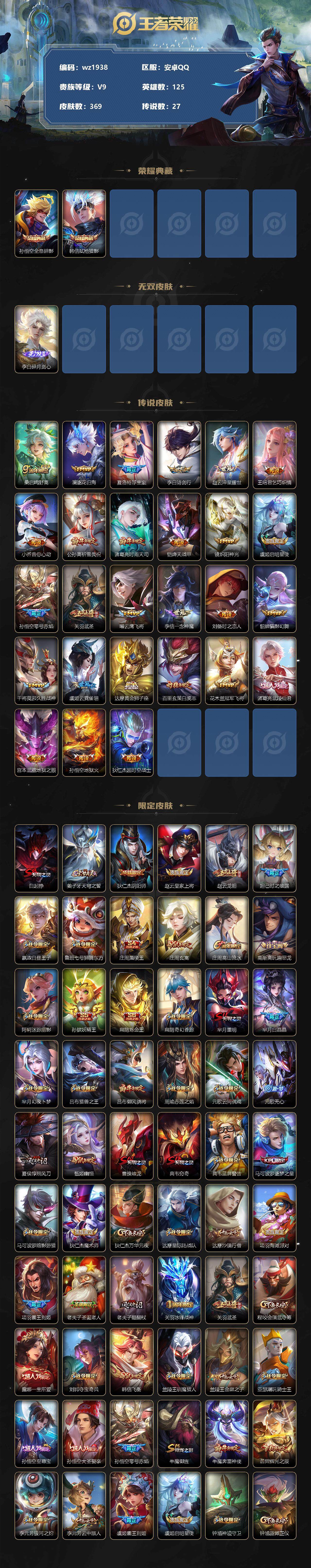 【游戏多多】【王者荣耀】【编号:3339082】【可二次实名】【wz1938】安卓Q-V9-最强王者段位-125英雄-369皮肤-2典藏-0珍品无双-1无双-0珍品传说-27传说-115史诗 【英雄全皮】:阿轲全皮,钟馗全皮,鬼谷子全皮,猪八戒全皮,蒙恬全皮,戈娅全皮,空空儿全皮 【荣耀典藏】:孙悟空全息碎影,韩信弑枪猎影 【无双皮肤】:李白碎月剑心 【传说皮肤】:桑启鸣野蒿,澜逐花归海,夏洛特浮生妄,李白诗剑行,赵云淬星耀世,王昭君乞巧织情,小乔音你心动,公孙离祈雪灵祝,诸葛亮时雨天司,铠绛天战甲,镜炽阳神光,虞姬启明星使,孙悟空零号赤焰,关羽武圣,曜云鹰飞将,李信一念神魔,刘备时之恋人,貂蝉猫影幻舞,干将莫邪久胜战神,虞姬云霓雀翎,达摩黄金狮子座,百里玄策白虎志,花木兰冠军飞将,诸葛亮武陵仙君,宫本武藏地狱之眼,孙悟空地狱火,狄仁杰超时空战士 【限定皮肤】:白起狰,姜子牙天穹之誓,狄仁杰阴阳师,赵云皇家上将,赵云龙胆,妲己时之彼端,嬴政白昼王子,鲁班七号狮舞东方,庄周蜃楼王,庄周玄嵩,庄周高山流水,高渐离玩趣恶龙,阿轲迷踪丽影,孙膑妖精王,扁鹊炼金王,扁鹊奇幻香踪,芈月重明,芈月白晶晶,芈月幻夜卜梦,吕布猎兽之王,吕布御风骁将,周瑜赤莲之焰,元歌云间偶戏,元歌无心,夏侯惇朔风刀,甄姬幽恒,曹操烛龙,典韦穷奇,典韦蓝屏警告,马可波罗逐梦之星,马可波罗暗影游猎,狄仁杰魔术师,狄仁杰万华元夜,达摩星际陆战队,达摩沙漠行僧,项羽海滩派对,项羽霸王别姬,老夫子圣诞老人,老夫子醍醐杖,关羽冰锋战神,关羽武圣,程咬金演武夺筹,露娜一生所爱,刘邦夺宝奇兵,韩信飞衡,兰陵王驯魔猎人,兰陵王金庭之子,亚瑟潮玩骑士王,孙悟空至尊宝,孙悟空大圣娶亲,孙悟空零号赤焰,牛魔御旌,牛魔奔雷神使,后羿辉光之辰,李元芳银河之约,李元芳云中旅人,虞姬霸王别姬,虞姬启明星使,钟馗神迹守卫,钟馗驱傩正仪,杨玉环遇见飞天,杨戬潮玩骑兵,女娲朔望之晖,干将莫邪冰霜恋舞曲,雅典娜单词大作战,雅典娜黎明之约,蔡文姬繁星吟游,太乙真人饕餮,东皇太一逐梦之光,鬼谷子原初探秘者,鬼谷子五谷丰年,诸葛亮武陵仙君,诸葛亮时雨天司,黄忠烈魂,黄忠火炮绅士,苏烈千军破阵,百里玄策白虎志,百里玄策原初追逐者,百里守约朱雀志,弈星混沌棋,梦奇顽趣,公孙离祈雪灵祝,沈梦溪星空之诺,沈梦溪大漠名商,明世隐疑决卦,裴擒虎天狼狩猎者,裴擒虎李小龙,裴擒虎擒涛扼浪,狂铁御狮,米莱狄御霄,云中君纤云弄巧,云中君时之祈愿,盾山御銮,猪八戒西部大镖客,猪八戒猪悟能,上官婉儿梁祝,上官婉儿天狼绘梦者,西施玲珑珍味,蒙犽狂想玩偶喵,鲁班大师探海日志,桑启海盐诗旅,夏洛特浮生妄,戈娅驭风魔法,艾琳流音漫舞,司空震地狱燃心,阿古朵江河有灵,张良古海寻踪,蒙犽百解令,蒙恬荣光圣徽,高渐离燃音魔法,妲己灵卜魔法,鬼谷子天穹祈灯,李白碎月剑心,姬小满妄想食味,沈梦溪龙舞盛年,刘邦剑破天穹,周瑜熔金海岸 【年限皮肤】:百里玄策白虎志,百里守约朱雀志,后羿辉光之辰,公孙离祈雪灵祝,吕布御风骁将,牛魔奔雷神使,诸葛亮时雨天司,甄姬幽恒,韩信飞衡,庄周玄嵩,关羽武圣,黄忠烈魂,赵云龙胆 【赛季限定】:庄周蜃楼王,孙膑妖精王,扁鹊炼金王,白起狰,芈月重明,夏侯惇朔风刀,曹操烛龙,典韦穷奇,狄仁杰万华元夜,达摩沙漠行僧,老夫子醍醐杖,程咬金演武夺筹,兰陵王金庭之子,张良古海寻踪,牛魔御旌,李元芳云中旅人,钟馗驱傩正仪,雅典娜黎明之约,太乙真人饕餮,鬼谷子原初探秘者,苏烈千军破阵,百里玄策原初追逐者,弈星混沌棋,梦奇顽趣,沈梦溪大漠名商,明世隐疑决卦,裴擒虎擒涛扼浪,狂铁御狮,米莱狄御霄,盾山御銮,鲁班大师探海日志,桑启海盐诗旅,鬼谷子天穹祈灯,蒙恬荣光圣徽,刘邦剑破天穹,姜子牙天穹之誓 【战令限定】:嬴政白昼王子,鲁班七号狮舞东方,阿轲迷踪丽影,扁鹊奇幻香踪,芈月幻夜卜梦,吕布猎兽之王,周瑜赤莲之焰,元歌云间偶戏,典韦蓝屏警告,马可波罗暗影游猎,达摩星际陆战队,刘邦夺宝奇兵,兰陵王驯魔猎人,艾琳流音漫舞,亚瑟潮玩骑士王,李元芳银河之约,钟馗神迹守卫,杨戬潮玩骑兵,女娲朔望之晖,雅典娜单词大作战,黄忠火炮绅士,沈梦溪星空之诺,猪八戒西部大镖客,西施玲珑珍味,蒙犽狂想玩偶喵,司空震地狱燃心,戈娅驭风魔法,高渐离燃音魔法,妲己灵卜魔法 【史诗皮肤】:鲁班七号电玩小子,露娜紫霞仙子,阿轲暗夜猫娘,赵云皇家上将,赵云未来纪元,貂蝉圣诞恋歌,老夫子圣诞老人,甄姬冰雪圆舞曲,王昭君偶像歌手,狄仁杰魔术师,廉颇地狱岩魂,宫本武藏鬼剑武藏,孙尚香水果甜心,嬴政暗夜贵公子,嬴政摇滚巨星,妲己魅力维加斯,妲己女仆咖啡,墨子龙骑士,墨子金属风暴,吕布圣诞狂欢,曹操幽灵船长,李白千年之狐,吕布末日机甲,张飞乱世虎臣,项羽霸王别姬,虞姬霸王别姬,关羽冰锋战神,孙悟空至尊宝,花木兰水晶猎龙者,刘邦德古拉伯爵,夏侯惇
