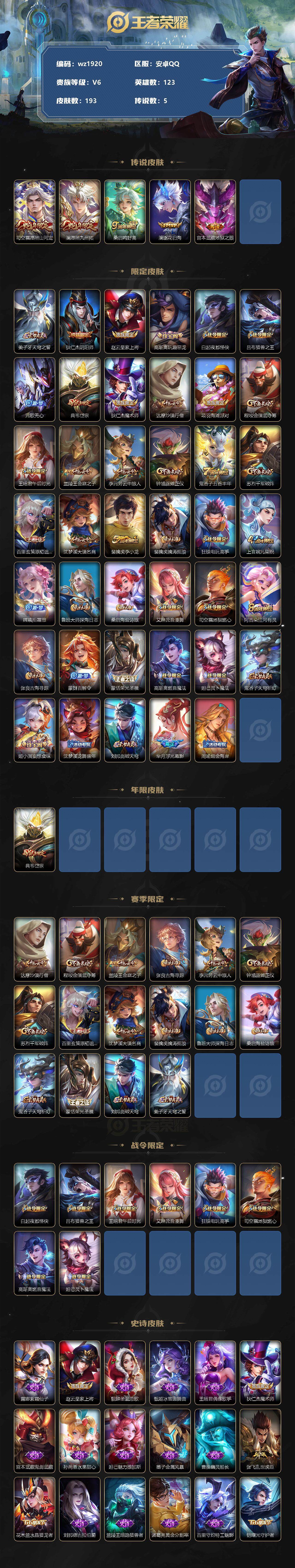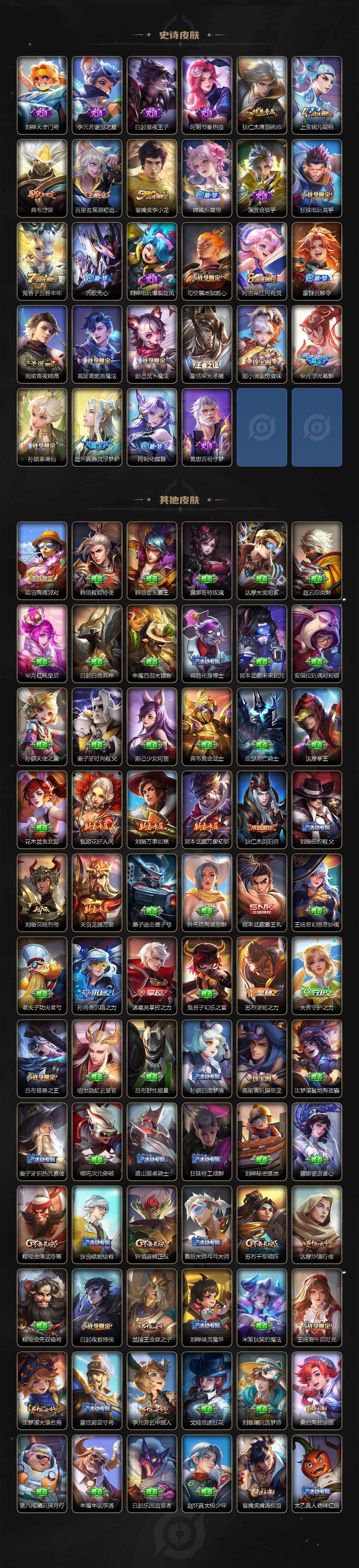 【游戏多多】【王者荣耀】【编号:3339099】【可二次实名】【wz1920】安卓Q-V6-至尊星耀V段位-123英雄-193皮肤-0典藏-0珍品无双-0无双-0珍品传说-5传说-45史诗 【英雄全皮】:蒙恬全皮,司空震全皮,空空儿全皮 【传说皮肤】:司空震愿照山河定,澜愿照九州拓,桑启鸣野蒿,澜逐花归海,宫本武藏地狱之眼 【限定皮肤】:姜子牙天穹之誓,狄仁杰阴阳师,赵云皇家上将,高渐离玩趣恶龙,白起夜都怪侠,吕布猎兽之王,元歌无心,典韦岱宗,狄仁杰魔术师,达摩沙漠行僧,项羽海滩派对,程咬金演武夺筹,王昭君午后时光,兰陵王金庭之子,李元芳云中旅人,钟馗驱傩正仪,鬼谷子五谷丰年,苏烈千军破阵,百里玄策原初追逐者,沈梦溪大漠名商,裴擒虎李小龙,裴擒虎擒涛扼浪,狂铁电玩高手,上官婉儿梁祝,嫦娥拒霜思,鲁班大师探海日志,桑启海盐诗旅,艾琳流音漫舞,司空震地狱燃心,阿古朵江河有灵,张良古海寻踪,蒙犽百解令,蒙恬荣光圣徽,高渐离燃音魔法,妲己灵卜魔法,鬼谷子天穹祈灯,姬小满妄想食味,沈梦溪龙舞盛年,刘邦剑破天穹,芈月浮光幕影,周瑜熔金海岸 【年限皮肤】:典韦岱宗 【赛季限定】:达摩沙漠行僧,程咬金演武夺筹,兰陵王金庭之子,张良古海寻踪,李元芳云中旅人,钟馗驱傩正仪,苏烈千军破阵,百里玄策原初追逐者,沈梦溪大漠名商,裴擒虎擒涛扼浪,鲁班大师探海日志,桑启海盐诗旅,鬼谷子天穹祈灯,蒙恬荣光圣徽,刘邦剑破天穹,姜子牙天穹之誓 【战令限定】:白起夜都怪侠,吕布猎兽之王,王昭君午后时光,艾琳流音漫舞,狂铁电玩高手,司空震地狱燃心,高渐离燃音魔法,妲己灵卜魔法 【史诗皮肤】:露娜紫霞仙子,赵云皇家上将,貂蝉圣诞恋歌,甄姬冰雪圆舞曲,王昭君偶像歌手,狄仁杰魔术师,宫本武藏鬼剑武藏,孙尚香水果甜心,妲己魅力维加斯,墨子金属风暴,曹操幽灵船长,张飞乱世虎臣,花木兰水晶猎龙者,刘邦德古拉伯爵,兰陵王暗隐猎兽者,诸葛亮黄金分割率,百里守约特工魅影,铠曙光守护者,刘禅天才门将,李元芳逐浪之夏,白起星夜王子,阿轲节奏热浪,狄仁杰鹰眼统帅,上官婉儿梁祝,典韦岱宗,百里玄策原初追逐者,裴擒虎李小龙,嫦娥拒霜思,澜赏金猎手,狂铁电玩高手,鬼谷子五谷丰年,元歌无心,刘禅电玩爆裂旋风,司空震地狱燃心,阿古朵江河有灵,蒙犽百解令,周瑜雪夜绮愿,妲己灵卜魔法,高渐离燃音魔法,蒙恬荣光圣徽,姬小满妄想食味,芈月浮光幕影,孙膑茶境仙,赵怀真器灵浮梦炉,阿轲化蝶舞,黄忠百相守梦 【其他皮肤】:项羽海滩派对,韩信教廷特使,韩信街头霸王,露娜哥特玫瑰,达摩大发明家,赵云忍炎影,芈月红桃皇后,白起白色死神,牛魔西部大镖客,扁鹊化身博士,宫本武藏未来纪元,安琪拉玩偶对对碰,孙膑天使之翼,姜子牙时尚教父,妲己少女阿狸,典韦黄金武士,亚瑟死亡骑士,达摩拳王,花木兰兔女郎,甄姬花好人间,刘备万事如意,宫本武藏万象初新,狄仁杰阴阳师,刘备纽约教父,刘备汉昭烈帝,关羽龙腾万里,墨子进击墨子号,钟无艳海滩丽影,宫本武藏霸王丸,王昭君幻想奇妙夜,老夫子功夫老勺,孙尚香沉稳之力,诸葛亮掌控之力,鬼谷子幻乐之宴,苏烈坚韧之力,大乔守护之力,吕布猎兽之王,明世隐虹云星官,吕布野性能量,孙膑归虚梦演,高渐离玩趣恶龙,沈梦溪鲨炮海盗猫,姜子牙炽热元素使,哪吒次元突破,盾山圆桌骑士,狂铁特工战影,刘禅秘密基地,露娜瓷语鉴心,程咬金演武夺筹,张良缤纷绘卷,钟馗驱傩正仪,鲁班大师乓乓大师,苏烈千军破阵,达摩沙漠行僧,程咬金无双福将,白起夜都怪侠,兰陵王金庭之子,刘禅唤灵魔甲,米莱狄契约魔法,王昭君午后时光,沈梦溪大漠名商,蒙恬蔚蓝守将,李元芳云中旅人,戈娅危途狂花,刘备潮玩造梦师,桑启海盐诗旅,猪八戒潮玩探月行,牛魔牛运亨通,白起乐园追猎者,赵怀真太极少年,裴擒虎擒涛扼浪,太乙真人劲辣红锅,莱西奥西部游侠,鲁班大师探海日志,姬小满零食大作战,李元芳妄想特派,艾琳流音漫舞,张良古海寻踪,钟无艳聚星闪耀,亚连破局者,曹操决胜大满贯,后羿完美运算,程咬金暖冬絮语,鬼谷子天穹祈灯,妲己灵卜魔法,嫦娥漠中幻影,廉颇功夫炙烤,沈梦溪龙舞盛年,刘邦剑破天穹,大司命暗都幽影,姜子牙天穹之誓,周瑜熔金海岸,东皇太一噬灭天穹,苍苍林狼骑,太乙真人谧流熔炉,典韦铁骨偃魂,马超访茗客,姜子牙星梦巡礼,戈娅玫蓝誓约,刘备浪漫序章,钟馗虚灵犬护,张良灵野札记,露娜命运加冕,姬小满小满鸭,白起死霸装,甄姬逆浪荇歌,庄周锦麟游梦,空空儿戏梦巡演,莱西奥踏浪烽翎,鲁班七号福禄兄弟,高渐离金属狂潮,项羽帝国元帅,花木兰剑舞者,王昭君精灵公主,小乔万圣前夜,孙悟空西部大镖客,后羿精灵王,兰陵王隐刃,李白范海辛,钟馗地府判官,马可波罗激情绿茵,杨戬埃及法老,诸葛亮星航指挥官,铠龙域领主,百里守约绝影神枪,百里玄策威尼斯狂欢,女娲尼罗河女神,弈星踏雪寻梅,元歌午夜歌剧院,李信灼热之刃,上官婉儿修竹墨客,嫦娥露花倒影,曜