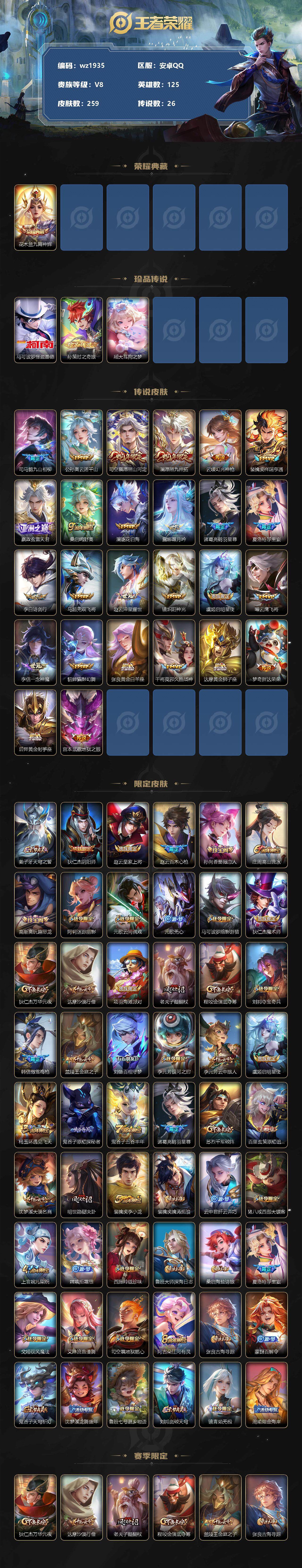 【游戏多多】【王者荣耀】【编号:3339104】【可二次实名】【wz1935】安卓Q-V8-最强王者段位-125英雄-259皮肤-1典藏-0珍品无双-0无双-3珍品传说-26传说-77史诗 【英雄全皮】:司空震全皮,戈娅全皮,空空儿全皮,影全皮 【荣耀典藏】:花木兰九霄神辉 【珍品传说】:马可波罗怪盗基德,孙策时之奇旅,瑶大耳狗之梦 【传说皮肤】:司马懿九山相柳,公孙离云诺千山,司空震愿照山河定,澜愿照九州拓,云缨幻光神枪,裴擒虎祥瑞亨通,嬴政玄雷天君,桑启鸣野蒿,澜逐花归海,露娜霜月吟,诸葛亮鹤羽星尊,夏洛特浮生妄,李白诗剑行,马超无双飞将,赵云淬星耀世,镜炽阳神光,虞姬启明星使,曜云鹰飞将,李信一念神魔,貂蝉猫影幻舞,张良黄金白羊座,干将莫邪久胜战神,达摩黄金狮子座,梦奇胖达荣荣,后羿黄金射手座,宫本武藏地狱之眼 【限定皮肤】:姜子牙天穹之誓,狄仁杰阴阳师,赵云皇家上将,赵云百木心枪,孙尚香蔷薇恋人,庄周高山流水,高渐离玩趣恶龙,阿轲迷踪丽影,元歌云间偶戏,元歌无心,马可波罗暗影游猎,狄仁杰魔术师,狄仁杰万华元夜,达摩沙漠行僧,项羽海滩派对,老夫子醍醐杖,程咬金演武夺筹,刘邦夺宝奇兵,韩信傲雪梅枪,兰陵王金庭之子,刘备百相守梦,李元芳银河之约,李元芳云中旅人,虞姬启明星使,杨玉环遇见飞天,鬼谷子原初探秘者,鬼谷子五谷丰年,诸葛亮鹤羽星尊,苏烈千军破阵,百里玄策原初追逐者,沈梦溪大漠名商,明世隐疑决卦,裴擒虎李小龙,裴擒虎擒涛扼浪,云中君纤云弄巧,猪八戒西部大镖客,上官婉儿梁祝,嫦娥拒霜思,西施玲珑珍味,鲁班大师探海日志,桑启海盐诗旅,夏洛特浮生妄,戈娅驭风魔法,艾琳流音漫舞,司空震地狱燃心,阿古朵江河有灵,张良古海寻踪,蒙犽百解令,鬼谷子天穹祈灯,沈梦溪龙舞盛年,鲁班七号蔬乡物语,刘邦剑破天穹,镜青焰无极,周瑜熔金海岸 【赛季限定】:狄仁杰万华元夜,达摩沙漠行僧,老夫子醍醐杖,程咬金演武夺筹,兰陵王金庭之子,张良古海寻踪,李元芳云中旅人,鬼谷子原初探秘者,苏烈千军破阵,百里玄策原初追逐者,沈梦溪大漠名商,明世隐疑决卦,裴擒虎擒涛扼浪,鲁班大师探海日志,桑启海盐诗旅,鬼谷子天穹祈灯,刘邦剑破天穹,姜子牙天穹之誓 【战令限定】:阿轲迷踪丽影,元歌云间偶戏,马可波罗暗影游猎,刘邦夺宝奇兵,艾琳流音漫舞,李元芳银河之约,猪八戒西部大镖客,西施玲珑珍味,司空震地狱燃心,戈娅驭风魔法,鲁班七号蔬乡物语,镜青焰无极 【史诗皮肤】:鲁班七号电玩小子,露娜紫霞仙子,赵云皇家上将,赵云未来纪元,貂蝉圣诞恋歌,甄姬冰雪圆舞曲,王昭君偶像歌手,狄仁杰魔术师,宫本武藏鬼剑武藏,孙尚香蔷薇恋人,孙尚香水果甜心,嬴政摇滚巨星,妲己魅力维加斯,妲己女仆咖啡,墨子金属风暴,吕布圣诞狂欢,曹操幽灵船长,李白千年之狐,吕布末日机甲,张飞乱世虎臣,花木兰水晶猎龙者,刘邦德古拉伯爵,夏侯惇乘风破浪,小乔缤纷独角兽,兰陵王暗隐猎兽者,雅典娜冰冠公主,百里守约特工魅影,铠曙光守护者,蔡文姬舞动绿茵,李元芳逐浪之夏,白起星夜王子,阿轲节奏热浪,杨玉环遇见飞天,孙策猫狗日记,伽罗箭羽风息,狄仁杰鹰眼统帅,公孙离无限星赏官,上官婉儿梁祝,李元芳银河之约,大乔白蛇,阿轲迷踪丽影,橘右京修罗,马可波罗暗影游猎,百里玄策原初追逐者,裴擒虎李小龙,云中君纤云弄巧,元歌云间偶戏,百里玄策热力回旋,杨戬天秀启明,钟馗乐园奇幻夜,庄周高山流水,嫦娥拒霜思,韩信傲雪梅枪,赵云百木心枪,鬼谷子五谷丰年,元歌无心,刘备百相守梦,戈娅驭风魔法,司空震地狱燃心,阿古朵江河有灵,蒙犽百解令,鲁班七号蔬乡物语,镜青焰无极,亚连破空之剑,百里守约百相守梦,牛魔星界战将,孙膑茶境仙,姬小满飞车小橘子,狄仁杰绮世丹青,阿轲化蝶舞,刘禅鸭鸭历险记,狂铁龙之律动,百里守约雪豹霜爪,牛魔小牛鸭,周瑜百相守梦,黄忠百相守梦,公孙离涂山容容 【其他皮肤】:项羽海滩派对,韩信教廷特使,韩信街头霸王,露娜哥特玫瑰,达摩大发明家,赵云白执事,赵云忍炎影,白起白色死神,牛魔西部大镖客,扁鹊化身博士,扁鹊救世之瞳,宫本武藏未来纪元,安琪拉玩偶对对碰,孙膑天使之翼,姜子牙时尚教父,妲己少女阿狸,典韦黄金武士,亚瑟死亡骑士,达摩拳王,花木兰兔女郎,甄姬花好人间,刘备万事如意,后羿阿尔法小队,狄仁杰阴阳师,刘备纽约教父,刘备汉昭烈帝,关羽龙腾万里,钟无艳海滩丽影,王昭君幻想奇妙夜,老夫子功夫老勺,孙尚香沉稳之力,诸葛亮掌控之力,李白敏锐之力,鬼谷子幻乐之宴,苏烈坚韧之力,大乔守护之力,明世隐虹云星官,小乔丁香结,吕布野性能量,孙膑归虚梦演,高渐离玩趣恶龙,沈梦溪鲨炮海盗猫,姜子牙炽热元素使,哪吒次元突破,明世隐疑决卦,刘邦夺宝奇兵,盾山圆桌骑士,老夫子醍醐杖,猪八戒西部大镖客,狂铁特工战影,鬼谷子原初探秘者,狄仁杰万华元夜,刘禅秘密基地,杨戬次元傲视,露娜瓷语鉴心,程咬金演武夺筹,鲁班大师