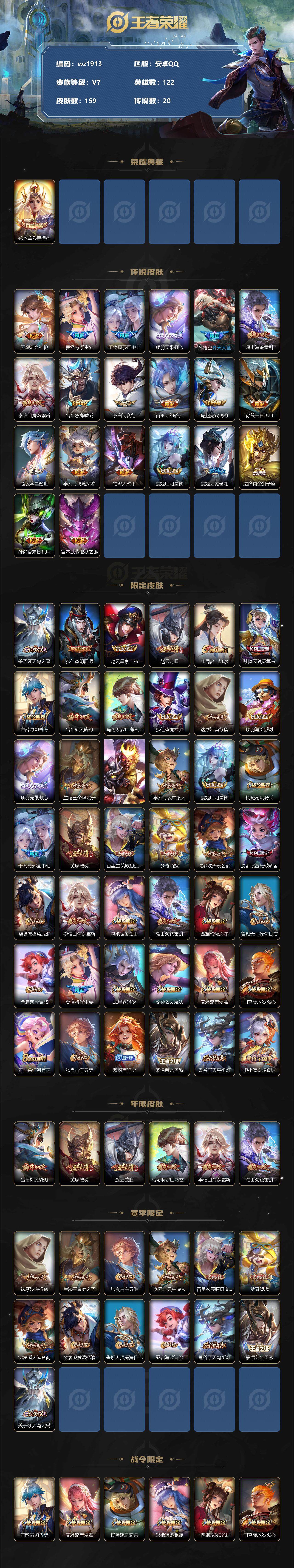 【游戏多多】【王者荣耀】【编号:3339106】【可二次实名】【wz1913】安卓Q-V7-最强王者段位-122英雄-159皮肤-1典藏-0珍品无双-0无双-0珍品传说-20传说-49史诗 【荣耀典藏】:花木兰九霄神辉 【传说皮肤】:云缨幻光神枪,夏洛特浮生妄,干将莫邪画中仙,项羽无限倾心,孙悟空齐天大圣,曜山海苍雷引,李信山海炽霜斩,吕布怒海麟威,李白诗剑行,百里守约碎云,马超无双飞将,孙策末日机甲,赵云淬星耀世,李元芳飞鸢探春,铠绛天战甲,虞姬启明星使,虞姬云霓雀翎,达摩黄金狮子座,孙尚香末日机甲,宫本武藏地狱之眼 【限定皮肤】:姜子牙天穹之誓,狄仁杰阴阳师,赵云皇家上将,赵云龙胆,庄周高山流水,孙膑天狼运算者,扁鹊奇幻香踪,吕布御风骁将,马可波罗山海玄木吟,狄仁杰魔术师,达摩沙漠行僧,项羽海滩派对,项羽无限倾心,兰陵王金庭之子,孙悟空齐天大圣,李元芳云中旅人,虞姬启明星使,杨戬潮玩骑兵,干将莫邪画中仙,黄忠烈魂,百里玄策原初追逐者,梦奇顽趣,沈梦溪大漠名商,沈梦溪匿光破解者,裴擒虎擒涛扼浪,李信山海炽霜斩,嫦娥暖冬兔眠,曜山海苍雷引,西施玲珑珍味,鲁班大师探海日志,桑启海盐诗旅,夏洛特浮生妄,暃星界游侠,戈娅驭风魔法,艾琳流音漫舞,司空震地狱燃心,阿古朵江河有灵,张良古海寻踪,蒙犽百解令,蒙恬荣光圣徽,鬼谷子天穹祈灯,姬小满妄想食味 【年限皮肤】:吕布御风骁将,黄忠烈魂,赵云龙胆,马可波罗山海玄木吟,李信山海炽霜斩,曜山海苍雷引 【赛季限定】:达摩沙漠行僧,兰陵王金庭之子,张良古海寻踪,李元芳云中旅人,百里玄策原初追逐者,梦奇顽趣,沈梦溪大漠名商,裴擒虎擒涛扼浪,鲁班大师探海日志,桑启海盐诗旅,鬼谷子天穹祈灯,蒙恬荣光圣徽,姜子牙天穹之誓 【战令限定】:扁鹊奇幻香踪,艾琳流音漫舞,杨戬潮玩骑兵,嫦娥暖冬兔眠,西施玲珑珍味,司空震地狱燃心,暃星界游侠,戈娅驭风魔法 【史诗皮肤】:鲁班七号电玩小子,赵云皇家上将,貂蝉圣诞恋歌,甄姬冰雪圆舞曲,王昭君偶像歌手,狄仁杰魔术师,廉颇地狱岩魂,宫本武藏鬼剑武藏,孙尚香水果甜心,妲己女仆咖啡,墨子龙骑士,墨子金属风暴,吕布圣诞狂欢,吕布末日机甲,张飞乱世虎臣,花木兰水晶猎龙者,刘邦德古拉伯爵,夏侯惇乘风破浪,小乔缤纷独角兽,兰陵王暗隐猎兽者,诸葛亮黄金分割率,铠曙光守护者,刘禅天才门将,白起星夜王子,阿轲节奏热浪,大乔猫狗日记,狄仁杰鹰眼统帅,小乔青蛇,赵云龙胆,黄忠烈魂,百里玄策原初追逐者,孙膑天狼运算者,吕布御风骁将,钟馗乐园奇幻夜,庄周高山流水,梦奇顽趣,暃星界游侠,马可波罗山海玄木吟,扁鹊奇幻香踪,沈梦溪匿光破解者,戈娅驭风魔法,司空震地狱燃心,阿古朵江河有灵,蒙犽百解令,蒙恬荣光圣徽,姬小满妄想食味,牛魔星界战将,狂铁龙之律动,黄忠百相守梦 【其他皮肤】:项羽海滩派对,韩信街头霸王,露娜哥特玫瑰,达摩大发明家,赵云白执事,赵云忍炎影,宫本武藏未来纪元,安琪拉玩偶对对碰,姜子牙时尚教父,妲己少女阿狸,典韦黄金武士,达摩拳王,花木兰兔女郎,后羿阿尔法小队,狄仁杰阴阳师,刘备汉昭烈帝,关羽龙腾万里,钟无艳海滩丽影,王昭君幻想奇妙夜,狂铁命运角斗场,诸葛亮掌控之力,李白敏锐之力,苏烈坚韧之力,小乔丁香结,吕布野性能量,刘禅秘密基地,鲁班大师乓乓大师,达摩沙漠行僧,程咬金无双福将,兰陵王金庭之子,米莱狄契约魔法,沈梦溪大漠名商,蒙犽胡桃狂想曲,李元芳云中旅人,桑启海盐诗旅,嫦娥暖冬兔眠,猪八戒潮玩探月行,牛魔牛运亨通,白起乐园追猎者,赵怀真太极少年,裴擒虎擒涛扼浪,杨戬潮玩骑兵,太乙真人劲辣红锅,鲁班大师探海日志,西施玲珑珍味,姬小满零食大作战,李元芳妄想特派,哪吒热血海滩,艾琳流音漫舞,张良古海寻踪,钟无艳聚星闪耀,兰陵王幻夜行动,曹操决胜大满贯,后羿完美运算,鬼谷子天穹祈灯,海诺时空谍影,朵莉亚金色潮汐,亚瑟鸿运当头,姜子牙天穹之誓,苍苍林狼骑,太乙真人谧流熔炉,典韦铁骨偃魂,西施雪境奇遇,姜子牙星梦巡礼,钟馗虚灵犬护,白起死霸装,甄姬逆浪荇歌,庄周锦麟游梦,莱西奥踏浪烽翎,鲁班七号福禄兄弟,钟无艳生化警戒,孙悟空西部大镖客,后羿精灵王,李元芳特种部队,刘邦圣殿之光,马可波罗激情绿茵,黄忠芝加哥教父,干将莫邪第七人偶,百里守约绝影神枪,米莱狄精准探案法,孙策海之征途,伽罗花见巫女,李信灼热之刃,瑶森,曜归虚梦演,司空震启蛰,金蝉前尘,暃碧珀绯影,桑启画中游 【营地ID】:1822733196