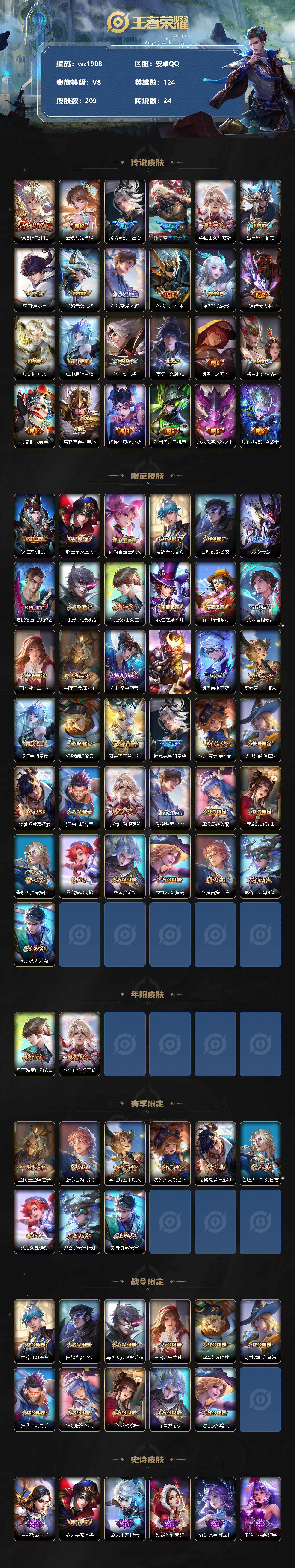 【游戏多多】【王者荣耀】【编号:3339107】【可二次实名】【wz1908】安卓Q-V8-至尊星耀IV段位-124英雄-209皮肤-0典藏-0珍品无双-0无双-0珍品传说-24传说-58史诗 【英雄全皮】:李信全皮,戈娅全皮 【传说皮肤】:澜愿照九州拓,云缨幻光神枪,诸葛亮鹤羽星尊,孙悟空齐天大圣,李信山海炽霜斩,吕布怒海麟威,李白诗剑行,马超无双飞将,孙策挚爱之约,孙策末日机甲,西施游龙清影,铠绛天战甲,镜炽阳神光,虞姬启明星使,曜云鹰飞将,李信一念神魔,刘备时之恋人,干将莫邪久胜战神,梦奇胖达荣荣,后羿黄金射手座,貂蝉仲夏夜之梦,孙尚香末日机甲,宫本武藏地狱之眼,狄仁杰超时空战士 【限定皮肤】:狄仁杰阴阳师,赵云皇家上将,孙尚香蔷薇恋人,扁鹊奇幻香踪,白起夜都怪侠,元歌无心,夏侯惇匿光决锋者,马可波罗暗影游猎,马可波罗山海玄木吟,狄仁杰魔术师,项羽海滩派对,关羽百相守梦,王昭君午后时光,兰陵王金庭之子,孙悟空至尊宝,孙悟空齐天大圣,刘备百相守梦,李元芳云中旅人,虞姬启明星使,杨戬潮玩骑兵,鬼谷子五谷丰年,诸葛亮鹤羽星尊,沈梦溪大漠名商,明世隐吟游魔法,裴擒虎擒涛扼浪,狂铁电玩高手,李信山海炽霜斩,孙策挚爱之约,嫦娥暖冬兔眠,西施玲珑珍味,鲁班大师探海日志,桑启海盐诗旅,暃星界游侠,戈娅驭风魔法,张良古海寻踪,鬼谷子天穹祈灯,刘邦剑破天穹 【年限皮肤】:马可波罗山海玄木吟,李信山海炽霜斩 【赛季限定】:兰陵王金庭之子,张良古海寻踪,李元芳云中旅人,沈梦溪大漠名商,裴擒虎擒涛扼浪,鲁班大师探海日志,桑启海盐诗旅,鬼谷子天穹祈灯,刘邦剑破天穹 【战令限定】:扁鹊奇幻香踪,白起夜都怪侠,马可波罗暗影游猎,王昭君午后时光,杨戬潮玩骑兵,明世隐吟游魔法,狂铁电玩高手,嫦娥暖冬兔眠,西施玲珑珍味,暃星界游侠,戈娅驭风魔法 【史诗皮肤】:露娜紫霞仙子,赵云皇家上将,赵云未来纪元,貂蝉圣诞恋歌,甄姬冰雪圆舞曲,王昭君偶像歌手,狄仁杰魔术师,廉颇地狱岩魂,宫本武藏鬼剑武藏,孙尚香蔷薇恋人,孙尚香水果甜心,嬴政摇滚巨星,妲己女仆咖啡,墨子龙骑士,墨子金属风暴,刘禅绅士熊喵,曹操幽灵船长,李白千年之狐,吕布末日机甲,张飞乱世虎臣,孙悟空至尊宝,花木兰水晶猎龙者,夏侯惇乘风破浪,小乔缤纷独角兽,兰陵王暗隐猎兽者,诸葛亮黄金分割率,雅典娜冰冠公主,百里守约特工魅影,铠曙光守护者,程咬金功夫厨神,阿轲节奏热浪,孙策猫狗日记,大乔猫狗日记,狄仁杰鹰眼统帅,橘右京修罗,马可波罗暗影游猎,百里玄策热力回旋,蒙犽龙鼓争鸣,钟馗乐园奇幻夜,司马懿暗渊魔法,夏洛特永昼,澜赏金猎手,明世隐吟游魔法,夏侯惇匿光决锋者,貂蝉唤灵魅影,狂铁电玩高手,鬼谷子五谷丰年,元歌无心,暃星界游侠,马可波罗山海玄木吟,扁鹊奇幻香踪,刘备百相守梦,关羽百相守梦,刘禅电玩爆裂旋风,戈娅驭风魔法,孙膑茶境仙,阿轲化蝶舞,狂铁龙之律动 【其他皮肤】:项羽海滩派对,韩信教廷特使,韩信街头霸王,达摩大发明家,赵云忍炎影,白起白色死神,牛魔西部大镖客,扁鹊救世之瞳,姜子牙时尚教父,妲己少女阿狸,达摩拳王,花木兰兔女郎,张飞五福同心,刘备万事如意,后羿阿尔法小队,狄仁杰阴阳师,刘备纽约教父,刘备汉昭烈帝,关羽龙腾万里,墨子进击墨子号,钟无艳海滩丽影,王昭君幻想奇妙夜,老夫子功夫老勺,孙尚香沉稳之力,李白敏锐之力,苏烈坚韧之力,小乔丁香结,姜子牙炽热元素使,哪吒次元突破,狂铁特工战影,刘禅秘密基地,露娜瓷语鉴心,鲁班大师乓乓大师,白起夜都怪侠,兰陵王金庭之子,刘禅唤灵魔甲,王昭君午后时光,沈梦溪大漠名商,蒙恬蔚蓝守将,李元芳云中旅人,戈娅危途狂花,桑启海盐诗旅,嫦娥暖冬兔眠,海月幻泉雾影,猪八戒潮玩探月行,赵怀真太极少年,裴擒虎擒涛扼浪,杨戬潮玩骑兵,太乙真人劲辣红锅,莱西奥西部游侠,鲁班大师探海日志,西施玲珑珍味,姬小满零食大作战,李元芳妄想特派,张良古海寻踪,后羿完美运算,鬼谷子天穹祈灯,廉颇功夫炙烤,刘邦剑破天穹,苍苍林狼骑,太乙真人谧流熔炉,典韦铁骨偃魂,马超访茗客,西施雪境奇遇,姜子牙星梦巡礼,东皇太一金福满堂,明世隐景韶洛都,戈娅玫蓝誓约,刘备浪漫序章,钟馗虚灵犬护,苏烈春野闲踪,小乔秘证寻踪,张良灵野札记,阿古朵布丁狗之约,露娜命运加冕,姬小满小满鸭,白起死霸装,甄姬逆浪荇歌,庄周锦麟游梦,高渐离金属狂潮,钟无艳生化警戒,貂蝉异域舞娘,老夫子潮流仙人,王昭君精灵公主,曹操超能战警,小乔万圣前夜,孙悟空西部大镖客,后羿精灵王,刘禅英喵野望,李白范海辛,李元芳特种部队,虞姬加勒比小姐,关羽天启骑士,蔡文姬蔷薇王座,马可波罗激情绿茵,苍维京掠夺者,哪吒三太子,干将莫邪第七人偶,铠龙域领主,百里守约绝影神枪,百里玄策威尼斯狂欢,苏烈爱与和平,女娲尼罗河女神,公孙离花间舞,杨玉环霓裳曲,裴擒虎街头旋风,弈星踏雪寻梅,元歌午夜歌剧院,司马懿魇语军师,盾山