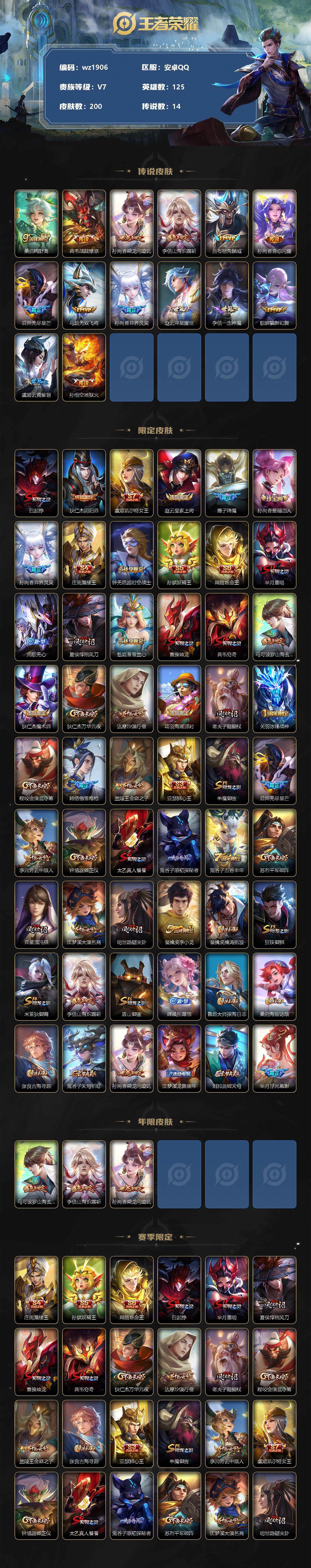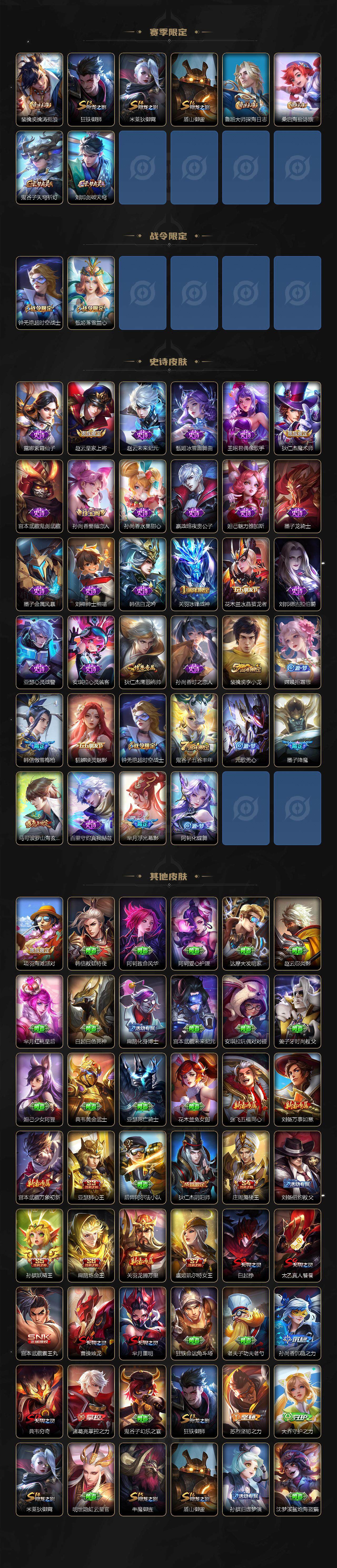 【游戏多多】【王者荣耀】【编号:3339108】【可二次实名】【wz1906】安卓Q-V7-永恒钻石III段位-125英雄-200皮肤-0典藏-0珍品无双-0无双-0珍品传说-14传说-34史诗 【英雄全皮】:李信全皮 【传说皮肤】:桑启鸣野蒿,典韦战鼓燎原,孙尚香乘龙问璇玑,李信山海炽霜斩,吕布怒海麟威,孙尚香音你闪耀,后羿无尽星芒,马超无双飞将,孙尚香异界灵契,赵云淬星耀世,李信一念神魔,貂蝉猫影幻舞,虞姬云霓雀翎,孙悟空地狱火 【限定皮肤】:白起狰,狄仁杰阴阳师,虞姬凯尔特女王,赵云皇家上将,墨子降魔,孙尚香蔷薇恋人,孙尚香异界灵契,庄周蜃楼王,钟无艳超时空战士,孙膑妖精王,扁鹊炼金王,芈月重明,元歌无心,夏侯惇朔风刀,甄姬落雪兰心,曹操烛龙,典韦穷奇,马可波罗山海玄木吟,狄仁杰魔术师,狄仁杰万华元夜,达摩沙漠行僧,项羽海滩派对,老夫子醍醐杖,关羽冰锋战神,程咬金演武夺筹,韩信傲雪梅枪,兰陵王金庭之子,亚瑟狮心王,牛魔御旌,后羿无尽星芒,李元芳云中旅人,钟馗驱傩正仪,太乙真人饕餮,鬼谷子原初探秘者,鬼谷子五谷丰年,苏烈千军破阵,弈星混沌棋,沈梦溪大漠名商,明世隐疑决卦,裴擒虎李小龙,裴擒虎擒涛扼浪,狂铁御狮,米莱狄御霄,李信山海炽霜斩,盾山御銮,嫦娥拒霜思,鲁班大师探海日志,桑启海盐诗旅,张良古海寻踪,鬼谷子天穹祈灯,孙尚香乘龙问璇玑,沈梦溪龙舞盛年,刘邦剑破天穹,芈月浮光幕影 【年限皮肤】:马可波罗山海玄木吟,李信山海炽霜斩,孙尚香乘龙问璇玑 【赛季限定】:庄周蜃楼王,孙膑妖精王,扁鹊炼金王,白起狰,芈月重明,夏侯惇朔风刀,曹操烛龙,典韦穷奇,狄仁杰万华元夜,达摩沙漠行僧,老夫子醍醐杖,程咬金演武夺筹,兰陵王金庭之子,张良古海寻踪,亚瑟狮心王,牛魔御旌,李元芳云中旅人,虞姬凯尔特女王,钟馗驱傩正仪,太乙真人饕餮,鬼谷子原初探秘者,苏烈千军破阵,弈星混沌棋,沈梦溪大漠名商,明世隐疑决卦,裴擒虎擒涛扼浪,狂铁御狮,米莱狄御霄,盾山御銮,鲁班大师探海日志,桑启海盐诗旅,鬼谷子天穹祈灯,刘邦剑破天穹 【战令限定】:钟无艳超时空战士,甄姬落雪兰心 【史诗皮肤】:露娜紫霞仙子,赵云皇家上将,赵云未来纪元,甄姬冰雪圆舞曲,王昭君偶像歌手,狄仁杰魔术师,宫本武藏鬼剑武藏,孙尚香蔷薇恋人,孙尚香水果甜心,嬴政暗夜贵公子,妲己魅力维加斯,墨子龙骑士,墨子金属风暴,刘禅绅士熊喵,韩信白龙吟,关羽冰锋战神,花木兰水晶猎龙者,刘邦德古拉伯爵,亚瑟心灵战警,安琪拉心灵骇客,狄仁杰鹰眼统帅,孙尚香时之恋人,裴擒虎李小龙,嫦娥拒霜思,韩信傲雪梅枪,貂蝉唤灵魅影,钟无艳超时空战士,鬼谷子五谷丰年,元歌无心,墨子降魔,马可波罗山海玄木吟,百里守约真我赫兹,芈月浮光幕影,阿轲化蝶舞 【其他皮肤】:项羽海滩派对,韩信教廷特使,阿轲致命风华,阿轲爱心护理,达摩大发明家,赵云忍炎影,芈月红桃皇后,白起白色死神,扁鹊化身博士,宫本武藏未来纪元,安琪拉玩偶对对碰,姜子牙时尚教父,妲己少女阿狸,典韦黄金武士,亚瑟死亡骑士,花木兰兔女郎,张飞五福同心,刘备万事如意,宫本武藏万象初新,亚瑟狮心王,后羿阿尔法小队,狄仁杰阴阳师,庄周蜃楼王,刘备纽约教父,孙膑妖精王,扁鹊炼金王,关羽龙腾万里,虞姬凯尔特女王,白起狰,太乙真人饕餮,宫本武藏霸王丸,曹操烛龙,芈月重明,狂铁命运角斗场,老夫子功夫老勺,孙尚香沉稳之力,典韦穷奇,诸葛亮掌控之力,鬼谷子幻乐之宴,狂铁御狮,苏烈坚韧之力,大乔守护之力,米莱狄御霄,明世隐虹云星官,牛魔御旌,盾山御銮,孙膑归虚梦演,沈梦溪鲨炮海盗猫,姜子牙炽热元素使,夏侯惇朔风刀,弈星混沌棋,哪吒次元突破,明世隐疑决卦,盾山圆桌骑士,老夫子醍醐杖,狂铁特工战影,鬼谷子原初探秘者,狄仁杰万华元夜,露娜瓷语鉴心,程咬金演武夺筹,张良缤纷绘卷,盘古重装意志,钟馗驱傩正仪,鲁班大师乓乓大师,苏烈千军破阵,典韦铁甲之心,马可波罗潮玩牛仔,达摩沙漠行僧,程咬金无双福将,兰陵王金庭之子,米莱狄契约魔法,沈梦溪大漠名商,蒙犽胡桃狂想曲,蒙恬蔚蓝守将,甄姬落雪兰心,李元芳云中旅人,桑启海盐诗旅,海月幻泉雾影,猪八戒潮玩探月行,白起乐园追猎者,裴擒虎擒涛扼浪,莱西奥西部游侠,鲁班大师探海日志,张良古海寻踪,后羿完美运算,鬼谷子天穹祈灯,海诺时空谍影,廉颇功夫炙烤,沈梦溪龙舞盛年,钟无艳春野之旅,刘邦剑破天穹,东皇太一噬灭天穹,吕布逐霄战戟,太乙真人谧流熔炉,姜子牙星梦巡礼,戈娅玫蓝誓约,钟馗虚灵犬护,鲁班七号福禄兄弟,高渐离金属狂潮,项羽帝国元帅,露娜绯红之刃,貂蝉异域舞娘,王昭君精灵公主,狄仁杰锦衣卫,曹操超能战警,孙悟空西部大镖客,周瑜海军大将,后羿精灵王,兰陵王隐刃,李白范海辛,钟馗地府判官,李元芳特种部队,刘邦圣殿之光,虞姬加勒比小姐,关羽天启骑士,夏侯惇战争骑士,雅典娜战争女神,苍维京掠夺者,杨戬埃及法老,哪吒三太子,诸葛
