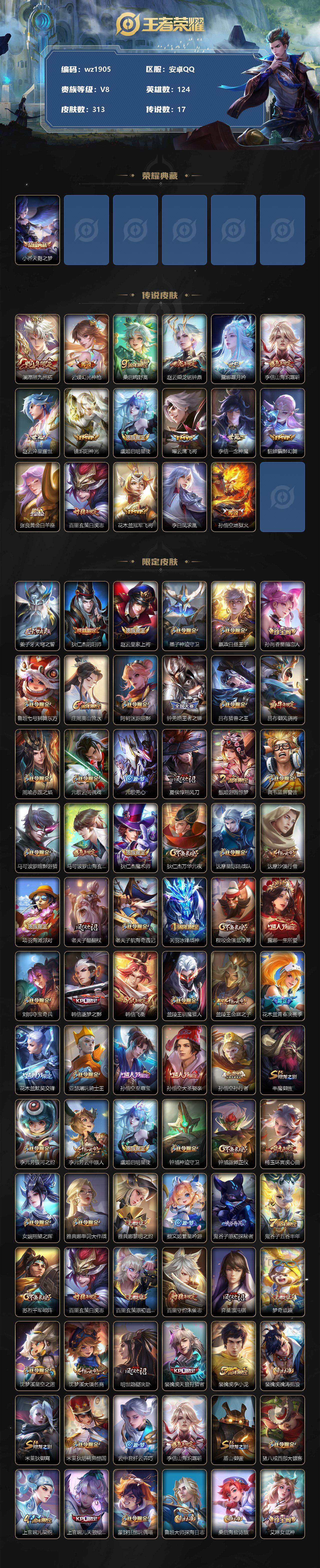 【游戏多多】【王者荣耀】【编号:3339113】【可二次实名】【wz1905】安卓Q-V8-至尊星耀IV段位-124英雄-313皮肤-1典藏-0珍品无双-0无双-0珍品传说-17传说-89史诗 【英雄全皮】:鬼谷子全皮,李信全皮,蒙恬全皮 【荣耀典藏】:小乔天鹅之梦 【传说皮肤】:澜愿照九州拓,云缨幻光神枪,桑启鸣野蒿,赵云乘龙铭钟鼎,露娜霜月吟,李信山海炽霜斩,赵云淬星耀世,镜炽阳神光,虞姬启明星使,曜云鹰飞将,李信一念神魔,貂蝉猫影幻舞,张良黄金白羊座,百里玄策白虎志,花木兰冠军飞将,李白凤求凰,孙悟空地狱火 【限定皮肤】:姜子牙天穹之誓,狄仁杰阴阳师,赵云皇家上将,墨子神迹守卫,嬴政白昼王子,孙尚香蔷薇恋人,鲁班七号狮舞东方,庄周高山流水,阿轲迷踪丽影,钟无艳王者之锤,吕布猎兽之王,吕布御风骁将,周瑜赤莲之焰,元歌云间偶戏,元歌无心,夏侯惇朔风刀,甄姬游园惊梦,典韦蓝屏警告,马可波罗暗影游猎,马可波罗山海玄木吟,狄仁杰魔术师,狄仁杰万华元夜,达摩星际陆战队,达摩沙漠行僧,项羽海滩派对,老夫子醍醐杖,老夫子航海奇遇记,关羽冰锋战神,程咬金演武夺筹,露娜一生所爱,刘邦夺宝奇兵,韩信逐梦之影,韩信飞衡,兰陵王驯魔猎人,兰陵王金庭之子,花木兰青春决赛季,花木兰默契交锋,亚瑟潮玩骑士王,孙悟空至尊宝,孙悟空大圣娶亲,孙悟空孙行者,牛魔御旌,李元芳银河之约,李元芳云中旅人,虞姬启明星使,钟馗神迹守卫,钟馗驱傩正仪,杨玉环寅虎心曲,女娲朔望之晖,雅典娜单词大作战,雅典娜黎明之约,蔡文姬繁星吟游,鬼谷子原初探秘者,鬼谷子五谷丰年,苏烈千军破阵,百里玄策白虎志,百里玄策原初追逐者,百里守约朱雀志,弈星混沌棋,梦奇顽趣,沈梦溪星空之诺,沈梦溪大漠名商,明世隐疑决卦,裴擒虎天狼狩猎者,裴擒虎李小龙,裴擒虎擒涛扼浪,米莱狄御霄,米莱狄胡桃异想国,云中君纤云弄巧,李信山海炽霜斩,盾山御銮,猪八戒西部大镖客,上官婉儿梁祝,上官婉儿天狼绘梦者,蒙犽狂想玩偶喵,鲁班大师探海日志,桑启海盐诗旅,艾琳女武神,阿古朵江河有灵,张良古海寻踪,蒙恬荣光圣徽,鬼谷子天穹祈灯,姬小满妄想食味,赵云乘龙铭钟鼎,沈梦溪龙舞盛年,刘邦剑破天穹,程咬金群星魔术团,周瑜熔金海岸 【年限皮肤】:百里玄策白虎志,百里守约朱雀志,杨玉环寅虎心曲,李白凤求凰,吕布御风骁将,韩信飞衡,马超神威,马可波罗山海玄木吟,李信山海炽霜斩,赵云乘龙铭钟鼎 【赛季限定】:夏侯惇朔风刀,狄仁杰万华元夜,达摩沙漠行僧,老夫子醍醐杖,程咬金演武夺筹,兰陵王金庭之子,张良古海寻踪,牛魔御旌,李元芳云中旅人,钟馗驱傩正仪,雅典娜黎明之约,鬼谷子原初探秘者,苏烈千军破阵,百里玄策原初追逐者,弈星混沌棋,梦奇顽趣,沈梦溪大漠名商,明世隐疑决卦,裴擒虎擒涛扼浪,米莱狄御霄,盾山御銮,鲁班大师探海日志,桑启海盐诗旅,鬼谷子天穹祈灯,蒙恬荣光圣徽,刘邦剑破天穹,姜子牙天穹之誓 【战令限定】:墨子神迹守卫,嬴政白昼王子,鲁班七号狮舞东方,阿轲迷踪丽影,吕布猎兽之王,周瑜赤莲之焰,元歌云间偶戏,典韦蓝屏警告,马可波罗暗影游猎,达摩星际陆战队,老夫子航海奇遇记,刘邦夺宝奇兵,兰陵王驯魔猎人,亚瑟潮玩骑士王,李元芳银河之约,钟馗神迹守卫,女娲朔望之晖,雅典娜单词大作战,沈梦溪星空之诺,米莱狄胡桃异想国,猪八戒西部大镖客,蒙犽狂想玩偶喵 【史诗皮肤】:露娜紫霞仙子,阿轲暗夜猫娘,钟无艳王者之锤,赵云皇家上将,赵云未来纪元,貂蝉圣诞恋歌,甄姬冰雪圆舞曲,王昭君偶像歌手,狄仁杰魔术师,宫本武藏鬼剑武藏,孙尚香蔷薇恋人,孙尚香水果甜心,嬴政暗夜贵公子,嬴政摇滚巨星,妲己女仆咖啡,墨子金属风暴,吕布圣诞狂欢,曹操幽灵船长,李白千年之狐,吕布末日机甲,张飞乱世虎臣,关羽冰锋战神,孙悟空至尊宝,花木兰水晶猎龙者,刘邦德古拉伯爵,韩信逐梦之影,小乔缤纷独角兽,兰陵王暗隐猎兽者,诸葛亮黄金分割率,甄姬游园惊梦,亚瑟心灵战警,雅典娜冰冠公主,安琪拉心灵骇客,花木兰青春决赛季,百里守约特工魅影,铠曙光守护者,程咬金功夫厨神,白起星夜王子,阿轲节奏热浪,嬴政白昼王子,孙策猫狗日记,百里守约朱雀志,露娜一生所爱,孙悟空大圣娶亲,典韦蓝屏警告,伽罗箭羽风息,裴擒虎天狼狩猎者,鲁班七号狮舞东方,狄仁杰鹰眼统帅,兰陵王驯魔猎人,上官婉儿梁祝,蔡文姬繁星吟游,李元芳银河之约,娜可露露晚萤,韩信飞衡,阿轲迷踪丽影,橘右京修罗,马超神威,孙尚香时之恋人,上官婉儿天狼绘梦者,马可波罗暗影游猎,蒙犽狂想玩偶喵,百里玄策原初追逐者,裴擒虎李小龙,云中君纤云弄巧,元歌云间偶戏,吕布御风骁将,花木兰默契交锋,米莱狄胡桃异想国,老夫子航海奇遇记,孙悟空孙行者,庄周高山流水,雅典娜黎明之约,杨玉环寅虎心曲,鬼谷子五谷丰年,元歌无心,梦奇顽趣,马可波罗山海玄木吟,阿古朵江河有灵,蒙恬荣光圣徽,姬小满妄想食味,艾琳陌上桑,百里守约百相守