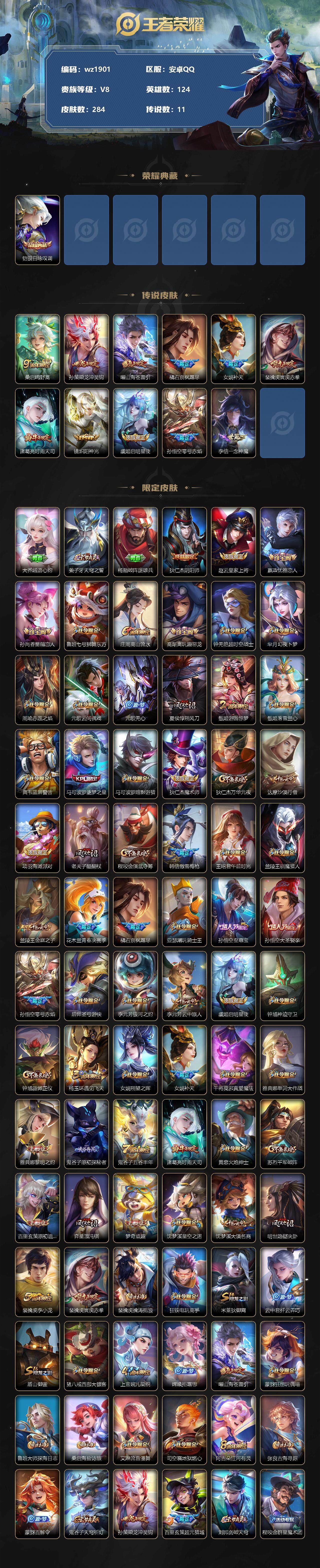 【游戏多多】【王者荣耀】【编号:3339114】【可二次实名】【wz1901】安卓Q-V8-最强王者段位-124英雄-284皮肤-1典藏-0珍品无双-0无双-0珍品传说-11传说-85史诗 【英雄全皮】:橘右京全皮,钟馗全皮,鬼谷子全皮,空空儿全皮 【荣耀典藏】:铠银白咏叹调 【传说皮肤】:桑启鸣野蒿,孙策乘龙淬吴钩,曜山海苍雷引,橘右京枫霜尽,女娲补天,裴擒虎寅虎赤拳,诸葛亮时雨天司,镜炽阳神光,虞姬启明星使,孙悟空零号赤焰,李信一念神魔 【限定皮肤】:大乔绒语心约,姜子牙天穹之誓,杨戬破阵退雄兵,狄仁杰阴阳师,赵云皇家上将,嬴政优雅恋人,孙尚香蔷薇恋人,鲁班七号狮舞东方,庄周高山流水,高渐离玩趣恶龙,钟无艳超时空战士,芈月幻夜卜梦,周瑜赤莲之焰,元歌云间偶戏,元歌无心,夏侯惇朔风刀,甄姬游园惊梦,甄姬落雪兰心,典韦蓝屏警告,马可波罗逐梦之星,马可波罗暗影游猎,狄仁杰魔术师,狄仁杰万华元夜,达摩沙漠行僧,项羽海滩派对,老夫子醍醐杖,程咬金演武夺筹,韩信傲雪梅枪,王昭君午后时光,兰陵王驯魔猎人,兰陵王金庭之子,花木兰青春决赛季,橘右京枫霜尽,亚瑟潮玩骑士王,孙悟空至尊宝,孙悟空大圣娶亲,孙悟空零号赤焰,后羿圣弓游侠,李元芳银河之约,李元芳云中旅人,虞姬启明星使,钟馗神迹守卫,钟馗驱傩正仪,杨玉环遇见飞天,女娲朔望之晖,女娲补天,干将莫邪真爱魔法,雅典娜单词大作战,雅典娜黎明之约,鬼谷子原初探秘者,鬼谷子五谷丰年,诸葛亮时雨天司,黄忠火炮绅士,苏烈千军破阵,百里玄策原初追逐者,弈星混沌棋,梦奇顽趣,沈梦溪星空之诺,沈梦溪大漠名商,明世隐疑决卦,裴擒虎李小龙,裴擒虎寅虎赤拳,裴擒虎擒涛扼浪,狂铁电玩高手,米莱狄御霄,云中君纤云弄巧,盾山御銮,猪八戒西部大镖客,上官婉儿梁祝,嫦娥拒霜思,曜山海苍雷引,蒙犽狂想玩偶喵,鲁班大师探海日志,桑启海盐诗旅,艾琳流音漫舞,司空震地狱燃心,阿古朵江河有灵,张良古海寻踪,蒙犽百解令,鬼谷子天穹祈灯,孙策乘龙淬吴钩,百里玄策超元猎域,刘邦剑破天穹,程咬金群星魔术团,关羽决胜骁骑,周瑜熔金海岸 【年限皮肤】:裴擒虎寅虎赤拳,诸葛亮时雨天司,曜山海苍雷引,孙策乘龙淬吴钩 【赛季限定】:夏侯惇朔风刀,狄仁杰万华元夜,达摩沙漠行僧,老夫子醍醐杖,程咬金演武夺筹,兰陵王金庭之子,张良古海寻踪,李元芳云中旅人,钟馗驱傩正仪,雅典娜黎明之约,鬼谷子原初探秘者,苏烈千军破阵,百里玄策原初追逐者,弈星混沌棋,梦奇顽趣,沈梦溪大漠名商,明世隐疑决卦,裴擒虎擒涛扼浪,米莱狄御霄,盾山御銮,鲁班大师探海日志,桑启海盐诗旅,鬼谷子天穹祈灯,刘邦剑破天穹,姜子牙天穹之誓 【战令限定】:鲁班七号狮舞东方,钟无艳超时空战士,芈月幻夜卜梦,周瑜赤莲之焰,元歌云间偶戏,甄姬落雪兰心,典韦蓝屏警告,马可波罗暗影游猎,王昭君午后时光,兰陵王驯魔猎人,艾琳流音漫舞,亚瑟潮玩骑士王,后羿圣弓游侠,李元芳银河之约,钟馗神迹守卫,女娲朔望之晖,干将莫邪真爱魔法,雅典娜单词大作战,黄忠火炮绅士,沈梦溪星空之诺,狂铁电玩高手,猪八戒西部大镖客,蒙犽狂想玩偶喵,司空震地狱燃心 【史诗皮肤】:露娜紫霞仙子,阿轲暗夜猫娘,赵云皇家上将,赵云未来纪元,貂蝉圣诞恋歌,甄姬冰雪圆舞曲,王昭君偶像歌手,狄仁杰魔术师,廉颇地狱岩魂,宫本武藏鬼剑武藏,孙尚香蔷薇恋人,孙尚香水果甜心,嬴政优雅恋人,嬴政暗夜贵公子,妲己魅力维加斯,妲己女仆咖啡,墨子龙骑士,墨子金属风暴,吕布圣诞狂欢,刘禅绅士熊喵,曹操幽灵船长,李白千年之狐,吕布末日机甲,张飞乱世虎臣,孙悟空至尊宝,花木兰水晶猎龙者,刘邦德古拉伯爵,夏侯惇乘风破浪,小乔缤纷独角兽,兰陵王暗隐猎兽者,诸葛亮黄金分割率,甄姬游园惊梦,马可波罗逐梦之星,亚瑟心灵战警,雅典娜冰冠公主,花木兰青春决赛季,百里守约特工魅影,蔡文姬舞动绿茵,刘禅天才门将,李元芳逐浪之夏,程咬金功夫厨神,白起星夜王子,阿轲节奏热浪,杨玉环遇见飞天,大乔猫狗日记,孙悟空大圣娶亲,典韦蓝屏警告,鲁班七号狮舞东方,狄仁杰鹰眼统帅,兰陵王驯魔猎人,上官婉儿梁祝,李元芳银河之约,娜可露露晚萤,橘右京修罗,马可波罗暗影游猎,蒙犽狂想玩偶喵,百里玄策原初追逐者,裴擒虎李小龙,云中君纤云弄巧,元歌云间偶戏,杨戬天秀启明,干将莫邪真爱魔法,钟馗乐园奇幻夜,庄周高山流水,司马懿暗渊魔法,嫦娥拒霜思,黄忠火炮绅士,雅典娜黎明之约,韩信傲雪梅枪,狂铁电玩高手,钟无艳超时空战士,鬼谷子五谷丰年,元歌无心,梦奇顽趣,刘禅电玩爆裂旋风,司空震地狱燃心,阿古朵江河有灵,蒙犽百解令,百里玄策超元猎域,关羽决胜骁骑,大司命东方月初,狂铁龙之律动,后羿石田雨龙,黄忠百相守梦,公孙离涂山容容 【其他皮肤】:项羽海滩派对,韩信教廷特使,韩信街头霸王,露娜哥特玫瑰,阿轲爱心护理,达摩大发明家,赵云白执事,赵云忍炎影,芈月红桃皇后,程咬金星际陆战队,白起