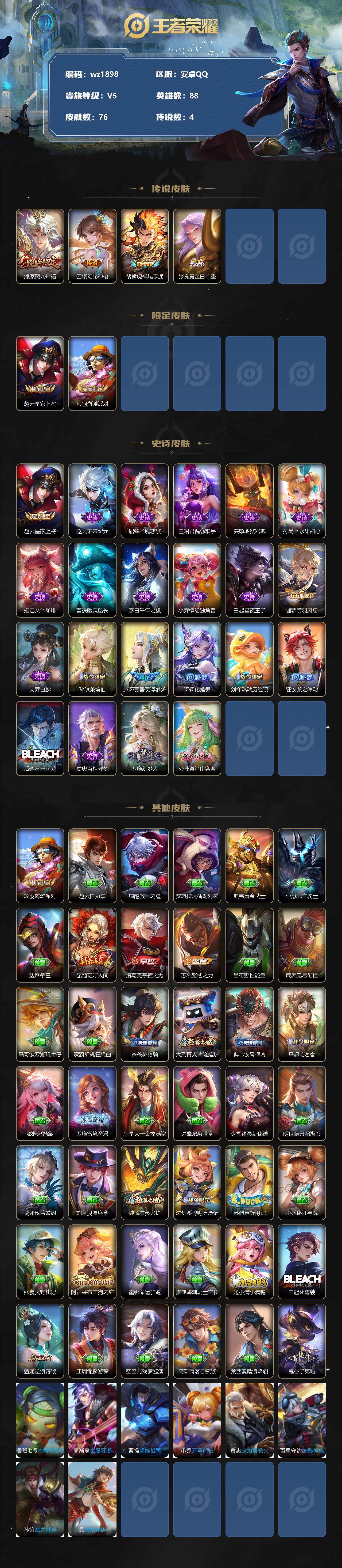 【游戏多多】【王者荣耀】【编号:3339115】【可二次实名】【wz1898】安卓Q-V5-永恒钻石V段位-88英雄-76皮肤-0典藏-0珍品无双-0无双-0珍品传说-4传说-22史诗 【英雄全皮】:空空儿全皮,影全皮 【传说皮肤】:澜愿照九州拓,云缨幻光神枪,裴擒虎祥瑞亨通,张良黄金白羊座 【限定皮肤】:赵云皇家上将,项羽海滩派对 【史诗皮肤】:赵云皇家上将,赵云未来纪元,貂蝉圣诞恋歌,王昭君偶像歌手,廉颇地狱岩魂,孙尚香水果甜心,妲己女仆咖啡,曹操幽灵船长,李白千年之狐,小乔缤纷独角兽,白起星夜王子,伽罗箭羽风息,大乔白蛇,孙膑茶境仙,赵怀真器灵浮梦炉,阿轲化蝶舞,刘禅鸭鸭历险记,狂铁龙之律动,后羿石田雨龙,黄忠百相守梦,西施织梦人,公孙离涂山容容 【其他皮肤】:项羽海滩派对,赵云白执事,扁鹊救世之瞳,安琪拉玩偶对对碰,典韦黄金武士,亚瑟死亡骑士,达摩拳王,甄姬花好人间,诸葛亮掌控之力,苏烈坚韧之力,吕布野性能量,廉颇无尽征程,马可波罗潮玩牛仔,蒙犽胡桃狂想曲,苍苍林狼骑,太乙真人谧流熔炉,典韦铁骨偃魂,马超访茗客,影魅影绮裳,西施雪境奇遇,东皇太一金福满堂,达摩爆裂喵拳,少司缘灵卦秘语,明世隐景韶洛都,戈娅玫蓝誓约,刘备浪漫序章,钟馗虚灵犬护,沈梦溪鸭鸭历险记,苏烈春野闲踪,小乔秘证寻踪,张良灵野札记,阿古朵布丁狗之约,露娜命运加冕,雅典娜潮玩士官长,姬小满小满鸭,白起死霸装,甄姬逆浪荇歌,庄周锦麟游梦,空空儿戏梦巡演,高渐离落日弦歌,莱西奥踏浪烽翎,鬼谷子克喵,鲁班七号木偶奇遇记,高渐离金属狂潮,曹操超能战警,小乔万圣前夜,黄忠芝加哥教父,百里守约绝影神枪,孙策海之征途,暃碧珀绯影 【营地ID】:1627314732