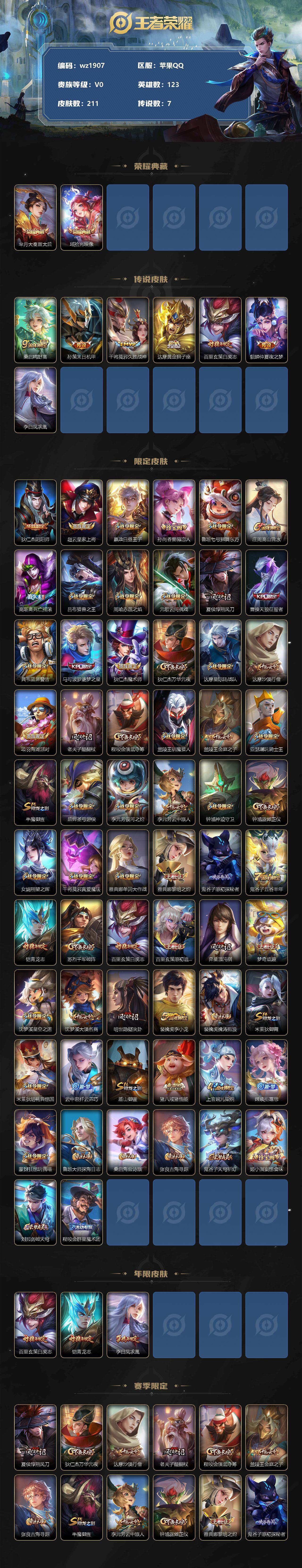 【游戏多多】【王者荣耀】【编号:3339125】【可二次实名】【wz1907】苹果Q-V0-永恒钻石III段位-123英雄-211皮肤-2典藏-0珍品无双-0无双-0珍品传说-7传说-56史诗 【荣耀典藏】:芈月大秦宣太后,瑶拾光映像 【传说皮肤】:桑启鸣野蒿,孙策末日机甲,干将莫邪久胜战神,达摩黄金狮子座,百里玄策白虎志,貂蝉仲夏夜之梦,李白凤求凰 【限定皮肤】:狄仁杰阴阳师,赵云皇家上将,嬴政白昼王子,孙尚香蔷薇恋人,鲁班七号狮舞东方,庄周高山流水,高渐离死亡摇滚,吕布猎兽之王,周瑜赤莲之焰,元歌云间偶戏,夏侯惇朔风刀,曹操天狼征服者,典韦蓝屏警告,马可波罗逐梦之星,狄仁杰魔术师,狄仁杰万华元夜,达摩星际陆战队,达摩沙漠行僧,项羽海滩派对,老夫子醍醐杖,程咬金演武夺筹,兰陵王驯魔猎人,兰陵王金庭之子,亚瑟潮玩骑士王,牛魔御旌,后羿圣弓游侠,李元芳银河之约,李元芳云中旅人,钟馗神迹守卫,钟馗驱傩正仪,女娲朔望之晖,干将莫邪真爱魔法,雅典娜单词大作战,雅典娜黎明之约,鬼谷子原初探秘者,鬼谷子五谷丰年,铠青龙志,苏烈千军破阵,百里玄策白虎志,百里玄策原初追逐者,弈星混沌棋,梦奇顽趣,沈梦溪星空之诺,沈梦溪大漠名商,明世隐疑决卦,裴擒虎李小龙,裴擒虎擒涛扼浪,米莱狄御霄,米莱狄胡桃异想国,云中君纤云弄巧,盾山御銮,猪八戒猪悟能,上官婉儿梁祝,嫦娥拒霜思,蒙犽狂想玩偶喵,鲁班大师探海日志,桑启海盐诗旅,张良古海寻踪,鬼谷子天穹祈灯,姬小满妄想食味,刘邦剑破天穹,程咬金群星魔术团 【年限皮肤】:百里玄策白虎志,铠青龙志,李白凤求凰 【赛季限定】:夏侯惇朔风刀,狄仁杰万华元夜,达摩沙漠行僧,老夫子醍醐杖,程咬金演武夺筹,兰陵王金庭之子,张良古海寻踪,牛魔御旌,李元芳云中旅人,钟馗驱傩正仪,雅典娜黎明之约,鬼谷子原初探秘者,苏烈千军破阵,百里玄策原初追逐者,弈星混沌棋,梦奇顽趣,沈梦溪大漠名商,明世隐疑决卦,裴擒虎擒涛扼浪,米莱狄御霄,盾山御銮,鲁班大师探海日志,桑启海盐诗旅,鬼谷子天穹祈灯,刘邦剑破天穹 【战令限定】:嬴政白昼王子,鲁班七号狮舞东方,吕布猎兽之王,周瑜赤莲之焰,元歌云间偶戏,典韦蓝屏警告,达摩星际陆战队,兰陵王驯魔猎人,亚瑟潮玩骑士王,后羿圣弓游侠,李元芳银河之约,钟馗神迹守卫,女娲朔望之晖,干将莫邪真爱魔法,雅典娜单词大作战,沈梦溪星空之诺,米莱狄胡桃异想国,蒙犽狂想玩偶喵 【史诗皮肤】:项羽苍穹之光,露娜紫霞仙子,阿轲暗夜猫娘,赵云皇家上将,赵云未来纪元,貂蝉圣诞恋歌,甄姬冰雪圆舞曲,王昭君偶像歌手,狄仁杰魔术师,廉颇地狱岩魂,宫本武藏鬼剑武藏,孙尚香蔷薇恋人,孙尚香水果甜心,嬴政摇滚巨星,妲己魅力维加斯,妲己女仆咖啡,墨子金属风暴,吕布圣诞狂欢,李白千年之狐,张飞乱世虎臣,夏侯惇乘风破浪,兰陵王暗隐猎兽者,马可波罗逐梦之星,雅典娜冰冠公主,百里守约特工魅影,蔡文姬舞动绿茵,刘禅天才门将,李元芳逐浪之夏,白起星夜王子,嬴政白昼王子,孙策猫狗日记,铠青龙志,典韦蓝屏警告,鲁班七号狮舞东方,狄仁杰鹰眼统帅,兰陵王驯魔猎人,上官婉儿梁祝,曹操天狼征服者,李元芳银河之约,蒙犽狂想玩偶喵,百里玄策原初追逐者,裴擒虎李小龙,云中君纤云弄巧,元歌云间偶戏,米莱狄胡桃异想国,百里玄策热力回旋,干将莫邪真爱魔法,沈梦溪月团寄思,猪八戒猪悟能,庄周高山流水,嫦娥拒霜思,雅典娜黎明之约,鬼谷子五谷丰年,梦奇顽趣,姬小满妄想食味,亚连破空之剑 【其他皮肤】:项羽海滩派对,韩信教廷特使,露娜哥特玫瑰,阿轲爱心护理,达摩大发明家,赵云忍炎影,芈月红桃皇后,扁鹊化身博士,宫本武藏未来纪元,安琪拉玩偶对对碰,孙膑天使之翼,姜子牙时尚教父,妲己少女阿狸,亚瑟死亡骑士,达摩拳王,花木兰兔女郎,张飞五福同心,甄姬花好人间,宫本武藏万象初新,后羿阿尔法小队,狄仁杰阴阳师,刘备纽约教父,高渐离死亡摇滚,刘备汉昭烈帝,关羽龙腾万里,钟无艳海滩丽影,王昭君幻想奇妙夜,狂铁命运角斗场,老夫子功夫老勺,孙尚香沉稳之力,鬼谷子幻乐之宴,大乔守护之力,项羽科学大爆炸,米莱狄御霄,吕布猎兽之王,明世隐虹云星官,张良幽兰居士,庄周奇妙博物学,牛魔御旌,女娲朔望之晖,小乔丁香结,吕布野性能量,钟馗神迹守卫,盾山御銮,孙膑归虚梦演,沈梦溪鲨炮海盗猫,姜子牙炽热元素使,夏侯惇朔风刀,周瑜赤莲之焰,沈梦溪星空之诺,弈星混沌棋,哪吒次元突破,鲁班七号黑桃队长,明世隐疑决卦,老夫子醍醐杖,狂铁特工战影,鬼谷子原初探秘者,雅典娜单词大作战,狄仁杰万华元夜,亚瑟潮玩骑士王,刘禅秘密基地,达摩星际陆战队,程咬金演武夺筹,张良缤纷绘卷,盘古重装意志,钟馗驱傩正仪,鲁班大师乓乓大师,苏烈千军破阵,后羿圣弓游侠,达摩沙漠行僧,程咬金无双福将,兰陵王金庭之子,米莱狄契约魔法,沈梦溪大漠名商,李元芳云中旅人,桑启海盐诗旅,海月幻泉雾影,猪八戒潮玩探月行,裴擒