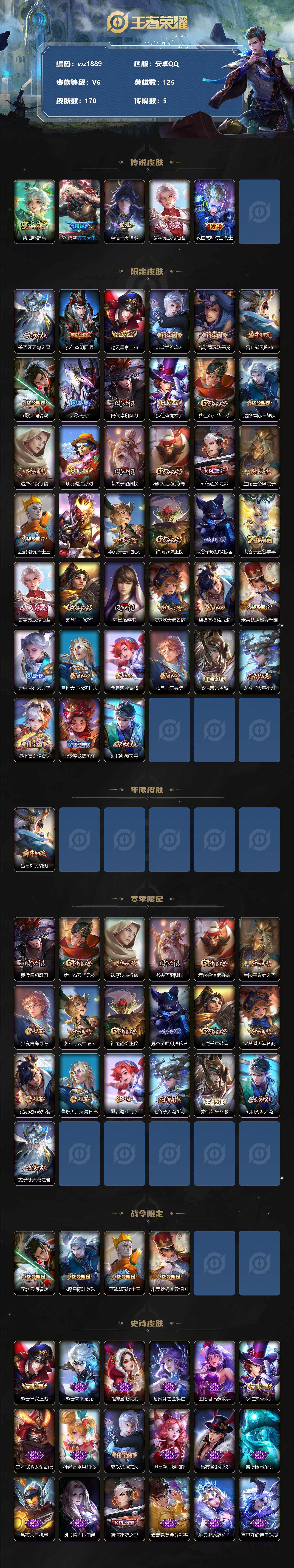 【游戏多多】【王者荣耀】【编号:3339127】【可二次实名】【wz1889】安卓Q-V6-至尊星耀II段位-125英雄-170皮肤-0典藏-0珍品无双-0无双-0珍品传说-5传说-37史诗 【英雄全皮】:影全皮 【传说皮肤】:桑启鸣野蒿,孙悟空齐天大圣,李信一念神魔,诸葛亮武陵仙君,狄仁杰超时空战士 【限定皮肤】:姜子牙天穹之誓,狄仁杰阴阳师,赵云皇家上将,嬴政优雅恋人,高渐离玩趣恶龙,吕布御风骁将,元歌云间偶戏,元歌无心,夏侯惇朔风刀,狄仁杰魔术师,狄仁杰万华元夜,达摩星际陆战队,达摩沙漠行僧,项羽海滩派对,老夫子醍醐杖,程咬金演武夺筹,韩信逐梦之影,兰陵王金庭之子,亚瑟潮玩骑士王,孙悟空齐天大圣,李元芳云中旅人,钟馗驱傩正仪,鬼谷子原初探秘者,鬼谷子五谷丰年,诸葛亮武陵仙君,苏烈千军破阵,弈星混沌棋,沈梦溪大漠名商,裴擒虎擒涛扼浪,米莱狄胡桃异想国,云中君纤云弄巧,鲁班大师探海日志,桑启海盐诗旅,张良古海寻踪,蒙恬荣光圣徽,鬼谷子天穹祈灯,姬小满妄想食味,沈梦溪龙舞盛年,刘邦剑破天穹 【年限皮肤】:吕布御风骁将 【赛季限定】:夏侯惇朔风刀,狄仁杰万华元夜,达摩沙漠行僧,老夫子醍醐杖,程咬金演武夺筹,兰陵王金庭之子,张良古海寻踪,李元芳云中旅人,钟馗驱傩正仪,鬼谷子原初探秘者,苏烈千军破阵,弈星混沌棋,沈梦溪大漠名商,裴擒虎擒涛扼浪,鲁班大师探海日志,桑启海盐诗旅,鬼谷子天穹祈灯,蒙恬荣光圣徽,刘邦剑破天穹,姜子牙天穹之誓 【战令限定】:元歌云间偶戏,达摩星际陆战队,亚瑟潮玩骑士王,米莱狄胡桃异想国 【史诗皮肤】:赵云皇家上将,赵云未来纪元,貂蝉圣诞恋歌,甄姬冰雪圆舞曲,王昭君偶像歌手,狄仁杰魔术师,宫本武藏鬼剑武藏,孙尚香水果甜心,嬴政优雅恋人,妲己魅力维加斯,吕布圣诞狂欢,曹操幽灵船长,吕布末日机甲,刘邦德古拉伯爵,韩信逐梦之影,诸葛亮黄金分割率,雅典娜冰冠公主,百里守约特工魅影,李元芳逐浪之夏,白起星夜王子,阿轲节奏热浪,狄仁杰鹰眼统帅,橘右京修罗,孙尚香时之恋人,云中君纤云弄巧,元歌云间偶戏,吕布御风骁将,米莱狄胡桃异想国,鬼谷子五谷丰年,元歌无心,刘禅电玩爆裂旋风,蒙恬荣光圣徽,姬小满妄想食味,狂铁龙之律动,黄忠百相守梦,西施织梦人,公孙离涂山容容 【其他皮肤】:项羽海滩派对,韩信教廷特使,韩信街头霸王,露娜哥特玫瑰,达摩大发明家,赵云忍炎影,白起白色死神,牛魔西部大镖客,宫本武藏未来纪元,妲己少女阿狸,典韦黄金武士,亚瑟死亡骑士,花木兰兔女郎,刘备万事如意,宫本武藏万象初新,狄仁杰阴阳师,刘备纽约教父,刘备汉昭烈帝,关羽龙腾万里,钟无艳海滩丽影,狂铁命运角斗场,老夫子功夫老勺,孙尚香沉稳之力,诸葛亮掌控之力,李白敏锐之力,鬼谷子幻乐之宴,苏烈坚韧之力,项羽科学大爆炸,明世隐虹云星官,吕布野性能量,孙膑归虚梦演,高渐离玩趣恶龙,沈梦溪鲨炮海盗猫,姜子牙炽热元素使,夏侯惇朔风刀,弈星混沌棋,哪吒次元突破,老夫子醍醐杖,鬼谷子原初探秘者,狄仁杰万华元夜,亚瑟潮玩骑士王,刘禅秘密基地,露娜瓷语鉴心,达摩星际陆战队,程咬金演武夺筹,张良缤纷绘卷,盘古重装意志,钟馗驱傩正仪,鲁班大师乓乓大师,苏烈千军破阵,典韦铁甲之心,达摩沙漠行僧,程咬金无双福将,兰陵王金庭之子,刘禅唤灵魔甲,沈梦溪大漠名商,蒙恬蔚蓝守将,李元芳云中旅人,刘备潮玩造梦师,桑启海盐诗旅,猪八戒潮玩探月行,赵怀真太极少年,裴擒虎擒涛扼浪,太乙真人劲辣红锅,鲁班大师探海日志,姬小满零食大作战,李元芳妄想特派,张良古海寻踪,亚连破局者,后羿完美运算,鬼谷子天穹祈灯,廉颇功夫炙烤,沈梦溪龙舞盛年,刘邦剑破天穹,姜子牙天穹之誓,东皇太一噬灭天穹,干将莫邪雾都夜雨,吕布逐霄战戟,苍苍林狼骑,太乙真人谧流熔炉,典韦铁骨偃魂,影魅影绮裳,姜子牙星梦巡礼,张良灵野札记,甄姬逆浪荇歌,庄周锦麟游梦,莱西奥踏浪烽翎,鬼谷子克喵,鲁班七号木偶奇遇记,项羽帝国元帅,花木兰剑舞者,狄仁杰锦衣卫,曹操超能战警,孙悟空西部大镖客,后羿精灵王,兰陵王隐刃,李白范海辛,钟馗地府判官,李元芳特种部队,关羽天启骑士,雅典娜战争女神,马可波罗激情绿茵,苍维京掠夺者,黄忠芝加哥教父,干将莫邪第七人偶,铠龙域领主,百里守约绝影神枪,百里玄策威尼斯狂欢,梦奇美梦成真,裴擒虎街头旋风,元歌午夜歌剧院,孙策海之征途,司马懿魇语军师,伽罗花见巫女,沈梦溪棒球奇才,李信灼热之刃,上官婉儿修竹墨客,云中君荷鲁斯之眼,曜归虚梦演,马超幸存者,蒙犽归虚梦演,镜冰刃幻境,阿古朵熊喵少女,澜孤猎,司空震启蛰,云缨赤焰之缨,金蝉前尘,暃碧珀绯影 【内测皮肤】:嬴政优雅恋人,高渐离玩趣恶龙 【营地ID】:1866790413