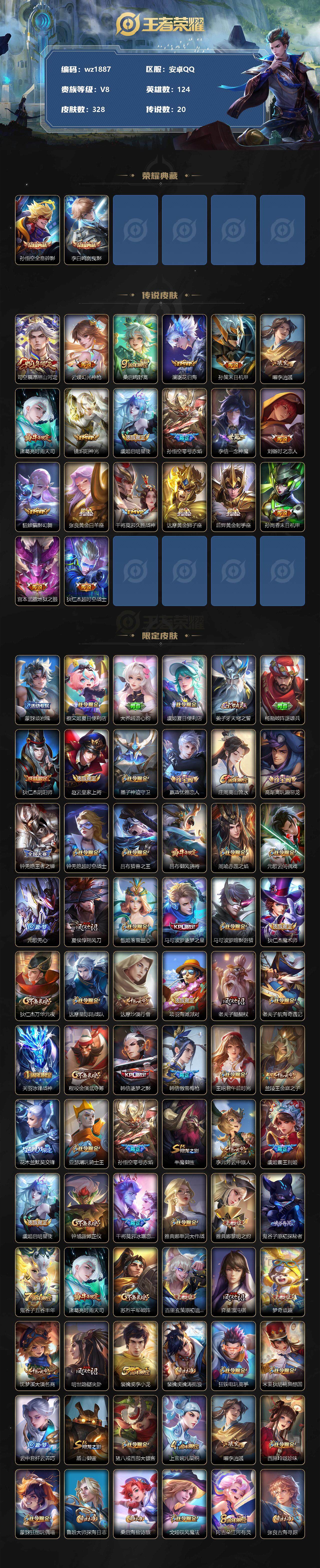 【游戏多多】【王者荣耀】【编号:3339133】【可二次实名】【wz1887】安卓Q-V8-最强王者段位-124英雄-328皮肤-2典藏-0珍品无双-0无双-0珍品传说-20传说-91史诗 【英雄全皮】:达摩全皮,戈娅全皮 【荣耀典藏】:孙悟空全息碎影,李白鸣剑曳影 【传说皮肤】:司空震愿照山河定,云缨幻光神枪,桑启鸣野蒿,澜逐花归海,孙策末日机甲,曜李逍遥 ,诸葛亮时雨天司,镜炽阳神光,虞姬启明星使,孙悟空零号赤焰,李信一念神魔,刘备时之恋人,貂蝉猫影幻舞,张良黄金白羊座,干将莫邪久胜战神,达摩黄金狮子座,后羿黄金射手座,孙尚香末日机甲,宫本武藏地狱之眼,狄仁杰超时空战士 【限定皮肤】:蒙犽顽岩魄,蔡文姬夏日便利店,大乔绒语心约,虞姬夏日便利店,姜子牙天穹之誓,杨戬破阵退雄兵,狄仁杰阴阳师,赵云皇家上将,墨子神迹守卫,嬴政优雅恋人,庄周高山流水,高渐离玩趣恶龙,钟无艳王者之锤,钟无艳超时空战士,吕布猎兽之王,吕布御风骁将,周瑜赤莲之焰,元歌云间偶戏,元歌无心,夏侯惇朔风刀,甄姬落雪兰心,马可波罗逐梦之星,马可波罗暗影游猎,狄仁杰魔术师,狄仁杰万华元夜,达摩星际陆战队,达摩沙漠行僧,项羽海滩派对,老夫子醍醐杖,老夫子航海奇遇记,关羽冰锋战神,程咬金演武夺筹,韩信逐梦之影,韩信傲雪梅枪,王昭君午后时光,兰陵王金庭之子,花木兰默契交锋,亚瑟潮玩骑士王,孙悟空零号赤焰,牛魔御旌,李元芳云中旅人,虞姬霸王别姬,虞姬启明星使,钟馗驱傩正仪,干将莫邪冰霜恋舞曲,雅典娜单词大作战,雅典娜黎明之约,鬼谷子原初探秘者,鬼谷子五谷丰年,诸葛亮时雨天司,苏烈千军破阵,百里玄策原初追逐者,弈星混沌棋,梦奇顽趣,沈梦溪大漠名商,明世隐疑决卦,裴擒虎李小龙,裴擒虎擒涛扼浪,狂铁电玩高手,米莱狄胡桃异想国,云中君纤云弄巧,盾山御銮,猪八戒西部大镖客,上官婉儿梁祝,曜李逍遥 ,西施玲珑珍味,蒙犽狂想玩偶喵,鲁班大师探海日志,桑启海盐诗旅,戈娅驭风魔法,阿古朵江河有灵,张良古海寻踪,蒙犽百解令,蒙恬荣光圣徽,高渐离燃音魔法,妲己灵卜魔法,鬼谷子天穹祈灯,姬小满妄想食味,大乔乘龙忆丹青,百里玄策超元猎域,沈梦溪龙舞盛年,刘邦剑破天穹,程咬金群星魔术团,镜青焰无极,项羽苍威无极,周瑜熔金海岸 【年限皮肤】:吕布御风骁将,诸葛亮时雨天司,大乔乘龙忆丹青 【赛季限定】:夏侯惇朔风刀,狄仁杰万华元夜,达摩沙漠行僧,老夫子醍醐杖,程咬金演武夺筹,兰陵王金庭之子,张良古海寻踪,牛魔御旌,李元芳云中旅人,钟馗驱傩正仪,雅典娜黎明之约,鬼谷子原初探秘者,苏烈千军破阵,百里玄策原初追逐者,弈星混沌棋,梦奇顽趣,沈梦溪大漠名商,明世隐疑决卦,裴擒虎擒涛扼浪,盾山御銮,鲁班大师探海日志,桑启海盐诗旅,鬼谷子天穹祈灯,蒙恬荣光圣徽,刘邦剑破天穹,姜子牙天穹之誓 【战令限定】:墨子神迹守卫,蔡文姬夏日便利店,虞姬夏日便利店,钟无艳超时空战士,吕布猎兽之王,周瑜赤莲之焰,元歌云间偶戏,甄姬落雪兰心,马可波罗暗影游猎,达摩星际陆战队,老夫子航海奇遇记,王昭君午后时光,亚瑟潮玩骑士王,雅典娜单词大作战,狂铁电玩高手,米莱狄胡桃异想国,猪八戒西部大镖客,西施玲珑珍味,蒙犽狂想玩偶喵,戈娅驭风魔法,高渐离燃音魔法,妲己灵卜魔法,镜青焰无极,项羽苍威无极 【史诗皮肤】:鲁班七号电玩小子,项羽苍穹之光,露娜紫霞仙子,钟无艳王者之锤,赵云嘻哈天王,赵云皇家上将,赵云未来纪元,貂蝉圣诞恋歌,甄姬冰雪圆舞曲,王昭君偶像歌手,狄仁杰魔术师,廉颇地狱岩魂,宫本武藏鬼剑武藏,孙尚香水果甜心,嬴政优雅恋人,嬴政暗夜贵公子,妲己魅力维加斯,妲己女仆咖啡,墨子金属风暴,吕布圣诞狂欢,曹操幽灵船长,李白千年之狐,张飞乱世虎臣,韩信白龙吟,虞姬霸王别姬,关羽冰锋战神,花木兰水晶猎龙者,刘邦德古拉伯爵,韩信逐梦之影,夏侯惇乘风破浪,小乔缤纷独角兽,兰陵王暗隐猎兽者,诸葛亮黄金分割率,马可波罗逐梦之星,亚瑟心灵战警,雅典娜冰冠公主,安琪拉心灵骇客,百里守约特工魅影,铠曙光守护者,蔡文姬舞动绿茵,刘禅天才门将,李元芳逐浪之夏,程咬金功夫厨神,白起星夜王子,阿轲节奏热浪,孙策猫狗日记,干将莫邪冰霜恋舞曲,狄仁杰鹰眼统帅,公孙离无限星赏官,上官婉儿梁祝,娜可露露晚萤,不知火舞魅语,橘右京修罗,孙尚香时之恋人,马可波罗暗影游猎,蒙犽狂想玩偶喵,百里玄策原初追逐者,裴擒虎李小龙,云中君纤云弄巧,元歌云间偶戏,吕布御风骁将,花木兰默契交锋,米莱狄胡桃异想国,百里玄策热力回旋,老夫子航海奇遇记,钟馗乐园奇幻夜,庄周高山流水,雅典娜黎明之约,韩信傲雪梅枪,澜赏金猎手,狂铁电玩高手,钟无艳超时空战士,弈星滕王阁序,鬼谷子五谷丰年,元歌无心,梦奇顽趣,戈娅驭风魔法,百里守约真我赫兹,阿古朵江河有灵,蒙犽百解令,妲己灵卜魔法,高渐离燃音魔法,蒙恬荣光圣徽,姬小满妄想食味,百里玄策超元猎域,大乔乘龙忆丹青,