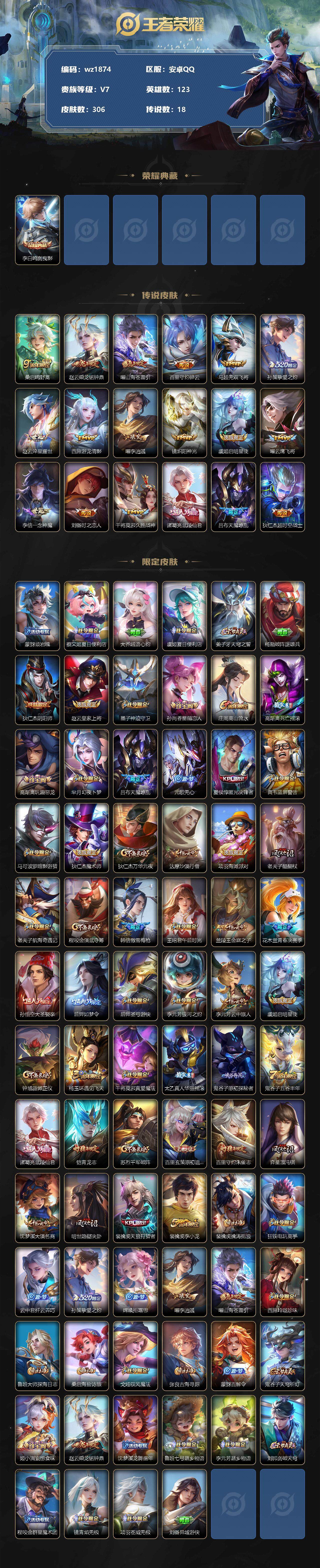 【游戏多多】【王者荣耀】【编号:3339141】【可二次实名】【wz1874】安卓Q-V7-最强王者段位-123英雄-306皮肤-1典藏-0珍品无双-0无双-0珍品传说-18传说-75史诗 【英雄全皮】:影全皮 【荣耀典藏】:李白鸣剑曳影 【传说皮肤】:桑启鸣野蒿,赵云乘龙铭钟鼎,曜山海苍雷引,百里守约碎云,马超无双飞将,孙策挚爱之约,赵云淬星耀世,西施游龙清影,曜李逍遥 ,镜炽阳神光,虞姬启明星使,曜云鹰飞将,李信一念神魔,刘备时之恋人,干将莫邪久胜战神,诸葛亮武陵仙君,吕布天魔缭乱,狄仁杰超时空战士 【限定皮肤】:蒙犽顽岩魄,蔡文姬夏日便利店,大乔绒语心约,虞姬夏日便利店,姜子牙天穹之誓,杨戬破阵退雄兵,狄仁杰阴阳师,赵云皇家上将,墨子神迹守卫,孙尚香蔷薇恋人,庄周高山流水,高渐离死亡摇滚,高渐离玩趣恶龙,芈月幻夜卜梦,吕布天魔缭乱,元歌无心,夏侯惇匿光决锋者,典韦蓝屏警告,马可波罗暗影游猎,狄仁杰魔术师,狄仁杰万华元夜,达摩沙漠行僧,项羽海滩派对,老夫子醍醐杖,老夫子航海奇遇记,程咬金演武夺筹,韩信傲雪梅枪,王昭君午后时光,兰陵王金庭之子,花木兰青春决赛季,孙悟空大圣娶亲,后羿如梦令,后羿圣弓游侠,李元芳银河之约,李元芳云中旅人,虞姬启明星使,钟馗驱傩正仪,杨玉环遇见飞天,干将莫邪真爱魔法,太乙真人华丽摇滚,鬼谷子原初探秘者,鬼谷子五谷丰年,诸葛亮武陵仙君,铠青龙志,苏烈千军破阵,百里玄策原初追逐者,百里守约朱雀志,弈星混沌棋,沈梦溪大漠名商,明世隐疑决卦,裴擒虎天狼狩猎者,裴擒虎李小龙,裴擒虎擒涛扼浪,狂铁电玩高手,云中君纤云弄巧,孙策挚爱之约,嫦娥拒霜思,曜李逍遥 ,曜山海苍雷引,西施玲珑珍味,鲁班大师探海日志,桑启海盐诗旅,戈娅驭风魔法,张良古海寻踪,蒙犽百解令,鬼谷子天穹祈灯,姬小满妄想食味,赵云乘龙铭钟鼎,沈梦溪龙舞盛年,鲁班七号蔬乡物语,李元芳蔬乡物语,刘邦剑破天穹,程咬金群星魔术团,镜青焰无极,项羽苍威无极,刘备异域游侠 【年限皮肤】:百里守约朱雀志,铠青龙志,马超神威,曜山海苍雷引,赵云乘龙铭钟鼎 【赛季限定】:狄仁杰万华元夜,达摩沙漠行僧,老夫子醍醐杖,程咬金演武夺筹,兰陵王金庭之子,张良古海寻踪,李元芳云中旅人,钟馗驱傩正仪,鬼谷子原初探秘者,苏烈千军破阵,百里玄策原初追逐者,弈星混沌棋,沈梦溪大漠名商,明世隐疑决卦,裴擒虎擒涛扼浪,鲁班大师探海日志,桑启海盐诗旅,鬼谷子天穹祈灯,刘邦剑破天穹,姜子牙天穹之誓 【战令限定】:墨子神迹守卫,蔡文姬夏日便利店,虞姬夏日便利店,芈月幻夜卜梦,典韦蓝屏警告,马可波罗暗影游猎,老夫子航海奇遇记,王昭君午后时光,后羿圣弓游侠,李元芳银河之约,干将莫邪真爱魔法,狂铁电玩高手,西施玲珑珍味,戈娅驭风魔法,鲁班七号蔬乡物语,李元芳蔬乡物语,镜青焰无极,项羽苍威无极 【史诗皮肤】:鲁班七号电玩小子,赵云皇家上将,貂蝉圣诞恋歌,甄姬冰雪圆舞曲,王昭君偶像歌手,狄仁杰魔术师,廉颇地狱岩魂,宫本武藏鬼剑武藏,孙尚香蔷薇恋人,孙尚香水果甜心,嬴政暗夜贵公子,妲己魅力维加斯,妲己女仆咖啡,墨子金属风暴,吕布圣诞狂欢,曹操幽灵船长,李白千年之狐,吕布末日机甲,韩信白龙吟,花木兰水晶猎龙者,夏侯惇乘风破浪,小乔缤纷独角兽,兰陵王暗隐猎兽者,诸葛亮黄金分割率,雅典娜冰冠公主,花木兰青春决赛季,百里守约特工魅影,铠曙光守护者,刘禅天才门将,程咬金功夫厨神,白起星夜王子,阿轲节奏热浪,杨玉环遇见飞天,孙策猫狗日记,铠青龙志,百里守约朱雀志,孙悟空大圣娶亲,典韦蓝屏警告,伽罗箭羽风息,裴擒虎天狼狩猎者,狄仁杰鹰眼统帅,公孙离无限星赏官,李元芳银河之约,后羿如梦令,不知火舞魅语,橘右京修罗,马超神威,马可波罗暗影游猎,百里玄策原初追逐者,裴擒虎李小龙,云中君纤云弄巧,老夫子航海奇遇记,干将莫邪真爱魔法,庄周高山流水,司马懿暗渊魔法,嫦娥拒霜思,韩信傲雪梅枪,澜赏金猎手,夏侯惇匿光决锋者,高渐离天秀音浪,狂铁电玩高手,鬼谷子五谷丰年,元歌无心,镜玫瑰异探,戈娅驭风魔法,蒙犽百解令,姬小满妄想食味,鲁班七号蔬乡物语,镜青焰无极,黄忠怒海争锋,蔡文姬夏日便利店,蒙犽顽岩魄,亚连破空之剑,牛魔星界战将,阿轲化蝶舞 【其他皮肤】:项羽海滩派对,韩信教廷特使,韩信街头霸王,露娜哥特玫瑰,阿轲爱心护理,达摩大发明家,赵云白执事,赵云忍炎影,芈月红桃皇后,白起白色死神,牛魔西部大镖客,武则天东方不败,扁鹊化身博士,扁鹊救世之瞳,宫本武藏未来纪元,安琪拉玩偶对对碰,孙膑天使之翼,姜子牙时尚教父,妲己少女阿狸,典韦黄金武士,亚瑟死亡骑士,花木兰兔女郎,张飞五福同心,甄姬花好人间,刘备万事如意,宫本武藏万象初新,后羿阿尔法小队,狄仁杰阴阳师,刘备纽约教父,高渐离死亡摇滚,刘备汉昭烈帝,关羽龙腾万里,墨子进击墨子号,钟无艳海滩丽影,王昭君幻想奇妙夜,狂铁命运角斗场,老夫子功夫
