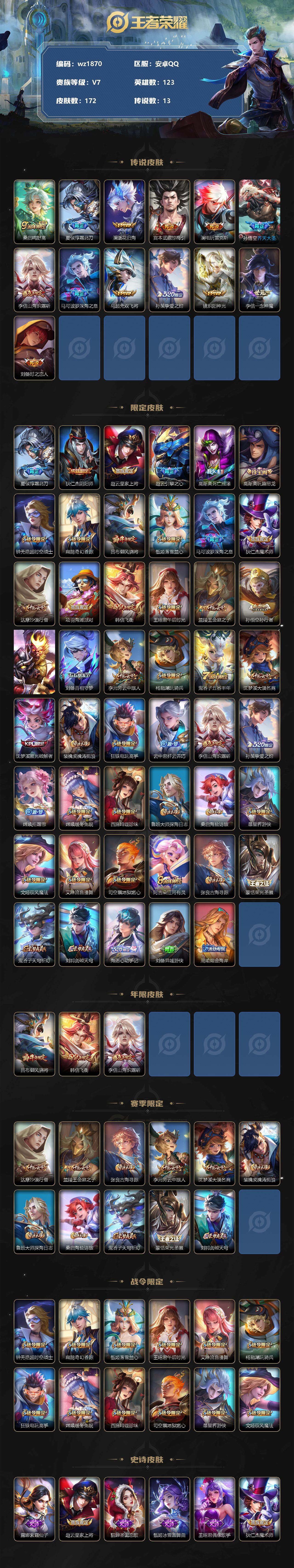 【游戏多多】【王者荣耀】【编号:3339142】【可二次实名】【wz1870】安卓Q-V7-最强王者段位-123英雄-172皮肤-0典藏-0珍品无双-0无双-0珍品传说-13传说-55史诗 【英雄全皮】:李信全皮,蒙恬全皮,空空儿全皮,海诺全皮 【传说皮肤】:桑启鸣野蒿,夏侯惇霜北刀,澜逐花归海,宫本武藏惊梅引,澜电玩雷克斯,孙悟空齐天大圣,李信山海炽霜斩,马可波罗深海之息,马超无双飞将,孙策挚爱之约,镜炽阳神光,李信一念神魔,刘备时之恋人 【限定皮肤】:夏侯惇霜北刀,狄仁杰阴阳师,赵云皇家上将,赵云引擎之心,高渐离死亡摇滚,高渐离玩趣恶龙,钟无艳超时空战士,扁鹊奇幻香踪,吕布御风骁将,甄姬落雪兰心,马可波罗深海之息,狄仁杰魔术师,达摩沙漠行僧,项羽海滩派对,韩信飞衡,王昭君午后时光,兰陵王金庭之子,孙悟空孙行者,孙悟空齐天大圣,刘备百相守梦,李元芳云中旅人,杨戬潮玩骑兵,鬼谷子五谷丰年,沈梦溪大漠名商,沈梦溪匿光破解者,裴擒虎擒涛扼浪,狂铁电玩高手,云中君纤云弄巧,李信山海炽霜斩,孙策挚爱之约,嫦娥拒霜思,嫦娥暖冬兔眠,西施玲珑珍味,鲁班大师探海日志,桑启海盐诗旅,暃星界游侠,戈娅驭风魔法,艾琳流音漫舞,司空震地狱燃心,阿古朵江河有灵,张良古海寻踪,蒙恬荣光圣徽,鬼谷子天穹祈灯,刘邦剑破天穹,海诺心动手记,刘备异域游侠,周瑜熔金海岸 【年限皮肤】:吕布御风骁将,韩信飞衡,李信山海炽霜斩 【赛季限定】:达摩沙漠行僧,兰陵王金庭之子,张良古海寻踪,李元芳云中旅人,沈梦溪大漠名商,裴擒虎擒涛扼浪,鲁班大师探海日志,桑启海盐诗旅,鬼谷子天穹祈灯,蒙恬荣光圣徽,刘邦剑破天穹 【战令限定】:钟无艳超时空战士,扁鹊奇幻香踪,甄姬落雪兰心,王昭君午后时光,艾琳流音漫舞,杨戬潮玩骑兵,狂铁电玩高手,嫦娥暖冬兔眠,西施玲珑珍味,司空震地狱燃心,暃星界游侠,戈娅驭风魔法 【史诗皮肤】:露娜紫霞仙子,赵云皇家上将,貂蝉圣诞恋歌,甄姬冰雪圆舞曲,王昭君偶像歌手,狄仁杰魔术师,宫本武藏鬼剑武藏,孙尚香水果甜心,妲己女仆咖啡,墨子金属风暴,刘禅绅士熊喵,曹操幽灵船长,李白千年之狐,赵云引擎之心,刘邦德古拉伯爵,夏侯惇乘风破浪,小乔缤纷独角兽,兰陵王暗隐猎兽者,亚瑟心灵战警,雅典娜冰冠公主,安琪拉心灵骇客,百里守约特工魅影,李元芳逐浪之夏,程咬金功夫厨神,白起星夜王子,大乔猫狗日记,伽罗箭羽风息,狄仁杰鹰眼统帅,韩信飞衡,橘右京修罗,云中君纤云弄巧,吕布御风骁将,孙悟空孙行者,嫦娥拒霜思,夏洛特永昼,澜赏金猎手,狂铁电玩高手,钟无艳超时空战士,鬼谷子五谷丰年,暃星界游侠,扁鹊奇幻香踪,刘备百相守梦,沈梦溪匿光破解者,刘禅电玩爆裂旋风,戈娅驭风魔法,百里守约真我赫兹,司空震地狱燃心,阿古朵江河有灵,蒙恬荣光圣徽,海诺心动手记,大司命东方月初,姬小满战舞者,狂铁龙之律动,后羿石田雨龙,黄忠百相守梦 【其他皮肤】:项羽海滩派对,韩信街头霸王,达摩大发明家,赵云忍炎影,白起白色死神,孙膑天使之翼,典韦黄金武士,亚瑟死亡骑士,达摩拳王,花木兰兔女郎,甄姬花好人间,后羿阿尔法小队,狄仁杰阴阳师,高渐离死亡摇滚,刘备汉昭烈帝,关羽龙腾万里,墨子进击墨子号,钟无艳海滩丽影,王昭君幻想奇妙夜,狂铁命运角斗场,老夫子功夫老勺,孙尚香沉稳之力,鬼谷子幻乐之宴,苏烈坚韧之力,小乔丁香结,吕布野性能量,高渐离玩趣恶龙,沈梦溪鲨炮海盗猫,哪吒次元突破,盾山圆桌骑士,刘禅秘密基地,鲁班大师乓乓大师,达摩沙漠行僧,程咬金无双福将,兰陵王金庭之子,米莱狄契约魔法,王昭君午后时光,沈梦溪大漠名商,蒙恬蔚蓝守将,甄姬落雪兰心,李元芳云中旅人,刘备潮玩造梦师,桑启海盐诗旅,嫦娥暖冬兔眠,猪八戒潮玩探月行,牛魔牛运亨通,赵怀真太极少年,裴擒虎擒涛扼浪,杨戬潮玩骑兵,太乙真人劲辣红锅,莱西奥西部游侠,鲁班大师探海日志,西施玲珑珍味,姬小满零食大作战,李元芳妄想特派,艾琳流音漫舞,张良古海寻踪,钟无艳聚星闪耀,亚连破局者,曹操决胜大满贯,后羿完美运算,鬼谷子天穹祈灯,海诺时空谍影,廉颇功夫炙烤,刘邦剑破天穹,刘备异域游侠,周瑜熔金海岸,盘古敬我三分,东皇太一噬灭天穹,太乙真人谧流熔炉,姜子牙星梦巡礼,戈娅玫蓝誓约,刘备浪漫序章,钟馗虚灵犬护,苏烈春野闲踪,露娜命运加冕,雅典娜潮玩士官长,白起死霸装,甄姬逆浪荇歌,庄周锦麟游梦,空空儿戏梦巡演,莱西奥踏浪烽翎,鬼谷子克喵,鲁班七号福禄兄弟,刘禅英喵野望,钟馗地府判官,马可波罗激情绿茵,苍维京掠夺者,黄忠芝加哥教父,干将莫邪第七人偶,铠龙域领主,百里守约绝影神枪,米莱狄精准探案法,司马懿魇语军师,沈梦溪棒球奇才,李信灼热之刃,上官婉儿修竹墨客,鲁班大师归虚梦演,蒙恬秩序猎龙将,澜孤猎,司空震启蛰,云缨赤焰之缨,暃碧珀绯影,桑启画中游 【内测皮肤】:高渐离玩趣恶龙 【营地ID】:1866493003