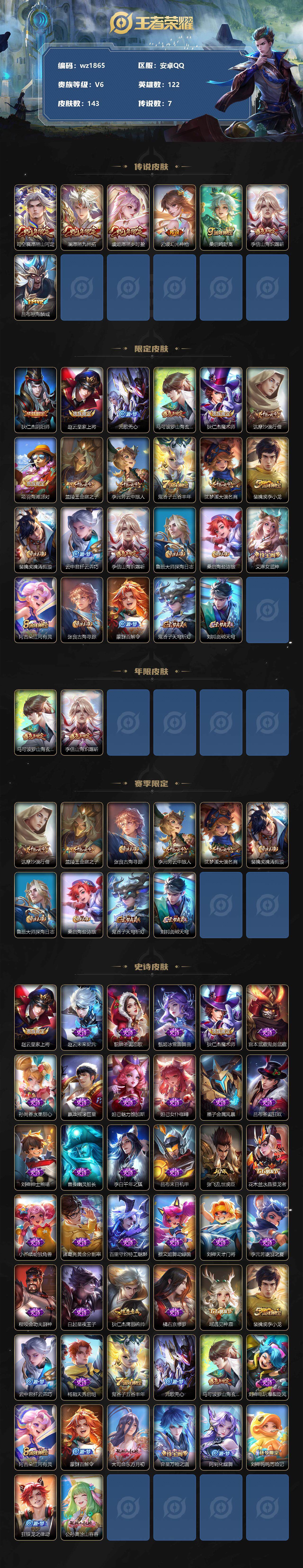 【游戏多多】【王者荣耀】【编号:3339144】【可二次实名】【wz1865】安卓Q-V6-最强王者段位-122英雄-143皮肤-0典藏-0珍品无双-0无双-0珍品传说-7传说-44史诗 【传说皮肤】:司空震愿照山河定,澜愿照九州拓,虞姬愿照岁时盈,云缨幻光神枪,桑启鸣野蒿,李信山海炽霜斩,吕布怒海麟威 【限定皮肤】:狄仁杰阴阳师,赵云皇家上将,元歌无心,马可波罗山海玄木吟,狄仁杰魔术师,达摩沙漠行僧,项羽海滩派对,兰陵王金庭之子,李元芳云中旅人,鬼谷子五谷丰年,沈梦溪大漠名商,裴擒虎李小龙,裴擒虎擒涛扼浪,云中君纤云弄巧,李信山海炽霜斩,鲁班大师探海日志,桑启海盐诗旅,艾琳女武神,阿古朵江河有灵,张良古海寻踪,蒙犽百解令,鬼谷子天穹祈灯,刘邦剑破天穹 【年限皮肤】:马可波罗山海玄木吟,李信山海炽霜斩 【赛季限定】:达摩沙漠行僧,兰陵王金庭之子,张良古海寻踪,李元芳云中旅人,沈梦溪大漠名商,裴擒虎擒涛扼浪,鲁班大师探海日志,桑启海盐诗旅,鬼谷子天穹祈灯,刘邦剑破天穹 【史诗皮肤】:赵云皇家上将,赵云未来纪元,貂蝉圣诞恋歌,甄姬冰雪圆舞曲,狄仁杰魔术师,宫本武藏鬼剑武藏,孙尚香水果甜心,嬴政摇滚巨星,妲己魅力维加斯,妲己女仆咖啡,墨子金属风暴,吕布圣诞狂欢,刘禅绅士熊喵,曹操幽灵船长,李白千年之狐,吕布末日机甲,张飞乱世虎臣,花木兰水晶猎龙者,小乔缤纷独角兽,诸葛亮黄金分割率,百里守约特工魅影,蔡文姬舞动绿茵,刘禅天才门将,李元芳逐浪之夏,程咬金功夫厨神,白起星夜王子,狄仁杰鹰眼统帅,橘右京修罗,瑶遇见神鹿,裴擒虎李小龙,云中君纤云弄巧,杨戬天秀启明,鬼谷子五谷丰年,元歌无心,马可波罗山海玄木吟,刘禅电玩爆裂旋风,阿古朵江河有灵,蒙犽百解令,大司命东方月初,弈星万物之道,阿轲化蝶舞,刘禅鸭鸭历险记,狂铁龙之律动,公孙离涂山容容 【其他皮肤】:项羽海滩派对,韩信教廷特使,韩信街头霸王,露娜哥特玫瑰,阿轲爱心护理,赵云白执事,赵云忍炎影,艾琳女武神,白起白色死神,扁鹊救世之瞳,安琪拉玩偶对对碰,孙膑天使之翼,妲己少女阿狸,典韦黄金武士,亚瑟死亡骑士,达摩拳王,花木兰兔女郎,刘备万事如意,后羿阿尔法小队,狄仁杰阴阳师,刘备纽约教父,关羽龙腾万里,钟无艳海滩丽影,老夫子功夫老勺,孙尚香沉稳之力,苏烈坚韧之力,大乔守护之力,孙膑归虚梦演,姜子牙炽热元素使,盾山圆桌骑士,狂铁特工战影,刘禅秘密基地,鲁班大师乓乓大师,达摩沙漠行僧,兰陵王金庭之子,沈梦溪大漠名商,李元芳云中旅人,刘备潮玩造梦师,桑启海盐诗旅,牛魔牛运亨通,裴擒虎擒涛扼浪,太乙真人劲辣红锅,莱西奥西部游侠,鲁班大师探海日志,李元芳妄想特派,张良古海寻踪,钟无艳聚星闪耀,亚连破局者,鬼谷子天穹祈灯,海诺时空谍影,朵莉亚金色潮汐,亚瑟鸿运当头,刘邦剑破天穹,东皇太一噬灭天穹,太乙真人谧流熔炉,姜子牙星梦巡礼,戈娅玫蓝誓约,钟馗虚灵犬护,沈梦溪鸭鸭历险记,苏烈春野闲踪,张良灵野札记,阿古朵布丁狗之约,露娜命运加冕,姬小满小满鸭,白起死霸装,甄姬逆浪荇歌,庄周锦麟游梦,莱西奥踏浪烽翎,项羽帝国元帅,貂蝉异域舞娘,王昭君精灵公主,孙悟空西部大镖客,兰陵王隐刃,马可波罗激情绿茵,诸葛亮星航指挥官,铠龙域领主,百里守约绝影神枪,公孙离花间舞,裴擒虎街头旋风,弈星踏雪寻梅,米莱狄精准探案法,元歌午夜歌剧院,司马懿魇语军师,李信灼热之刃,马超幸存者,蒙犽归虚梦演,蒙恬秩序猎龙将,澜孤猎,司空震启蛰,云缨赤焰之缨,金蝉前尘,暃碧珀绯影 【内测皮肤】:艾琳女武神,狂铁特工战影 【营地ID】:1782408108