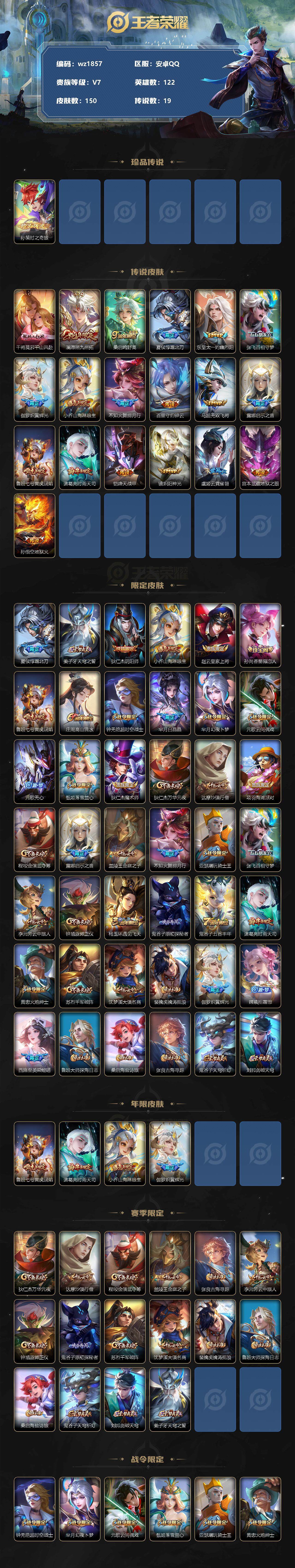 【游戏多多】【王者荣耀】【编号:3339151】【可二次实名】【wz1857】安卓Q-V7-最强王者段位-122英雄-150皮肤-0典藏-0珍品无双-0无双-1珍品传说-19传说-37史诗 【英雄全皮】:空空儿全皮,影全皮 【珍品传说】:孙策时之奇旅 【传说皮肤】:干将莫邪千山共赴,澜愿照九州拓,桑启鸣野蒿,夏侯惇霜北刀,东皇太一灼幽烈阳,张飞百相守梦,伽罗炽翼辉光,小乔山海琳琅生,不知火舞绯月行,百里守约碎云,马超无双飞将,露娜启示之音,鲁班七号寅虎瑞焰,诸葛亮时雨天司,铠绛天战甲,镜炽阳神光,虞姬云霓雀翎,宫本武藏地狱之眼,孙悟空地狱火 【限定皮肤】:夏侯惇霜北刀,姜子牙天穹之誓,狄仁杰阴阳师,小乔山海琳琅生,赵云皇家上将,孙尚香蔷薇恋人,鲁班七号寅虎瑞焰,庄周高山流水,钟无艳超时空战士,芈月白晶晶,芈月幻夜卜梦,元歌云间偶戏,元歌无心,甄姬落雪兰心,狄仁杰魔术师,狄仁杰万华元夜,达摩沙漠行僧,项羽海滩派对,程咬金演武夺筹,露娜启示之音,兰陵王金庭之子,不知火舞绯月行,亚瑟潮玩骑士王,张飞百相守梦,李元芳云中旅人,钟馗驱傩正仪,杨玉环遇见飞天,鬼谷子原初探秘者,鬼谷子五谷丰年,诸葛亮时雨天司,黄忠火炮绅士,苏烈千军破阵,沈梦溪大漠名商,裴擒虎擒涛扼浪,伽罗炽翼辉光,嫦娥拒霜思,西施至美乘鲤谣,鲁班大师探海日志,桑启海盐诗旅,张良古海寻踪,鬼谷子天穹祈灯,刘邦剑破天穹 【年限皮肤】:鲁班七号寅虎瑞焰,诸葛亮时雨天司,小乔山海琳琅生,伽罗炽翼辉光 【赛季限定】:狄仁杰万华元夜,达摩沙漠行僧,程咬金演武夺筹,兰陵王金庭之子,张良古海寻踪,李元芳云中旅人,钟馗驱傩正仪,鬼谷子原初探秘者,苏烈千军破阵,沈梦溪大漠名商,裴擒虎擒涛扼浪,鲁班大师探海日志,桑启海盐诗旅,鬼谷子天穹祈灯,刘邦剑破天穹,姜子牙天穹之誓 【战令限定】:钟无艳超时空战士,芈月幻夜卜梦,元歌云间偶戏,甄姬落雪兰心,亚瑟潮玩骑士王,黄忠火炮绅士 【史诗皮肤】:赵云皇家上将,赵云未来纪元,貂蝉圣诞恋歌,甄姬冰雪圆舞曲,狄仁杰魔术师,宫本武藏鬼剑武藏,孙尚香蔷薇恋人,孙尚香水果甜心,妲己魅力维加斯,妲己女仆咖啡,墨子金属风暴,曹操幽灵船长,花木兰水晶猎龙者,夏侯惇乘风破浪,诸葛亮黄金分割率,雅典娜冰冠公主,安琪拉心灵骇客,杨玉环遇见飞天,狄仁杰鹰眼统帅,元歌云间偶戏,芈月白晶晶,安琪拉时之奇旅,庄周高山流水,嫦娥拒霜思,黄忠火炮绅士,钟无艳超时空战士,鬼谷子五谷丰年,阿古朵顽趣,元歌无心,西施至美乘鲤谣,亚连破空之剑,弈星炽弈燎原,艾琳陌上桑,牛魔星界战将,孙膑茶境仙,赵怀真器灵浮梦炉,狂铁龙之律动 【其他皮肤】:项羽海滩派对,韩信教廷特使,韩信街头霸王,白起白色死神,扁鹊化身博士,宫本武藏未来纪元,安琪拉玩偶对对碰,孙膑天使之翼,亚瑟死亡骑士,达摩拳王,宫本武藏万象初新,狄仁杰阴阳师,刘备纽约教父,关羽龙腾万里,钟无艳海滩丽影,老夫子功夫老勺,孙尚香沉稳之力,大乔守护之力,明世隐虹云星官,姜子牙炽热元素使,哪吒次元突破,狂铁特工战影,鬼谷子原初探秘者,狄仁杰万华元夜,亚瑟潮玩骑士王,程咬金演武夺筹,张良缤纷绘卷,钟馗驱傩正仪,鲁班大师乓乓大师,苏烈千军破阵,典韦铁甲之心,马可波罗潮玩牛仔,达摩沙漠行僧,芈月幻夜卜梦,兰陵王金庭之子,米莱狄契约魔法,沈梦溪大漠名商,甄姬落雪兰心,李元芳云中旅人,戈娅危途狂花,桑启海盐诗旅,海月幻泉雾影,猪八戒潮玩探月行,裴擒虎擒涛扼浪,太乙真人劲辣红锅,鲁班大师探海日志,张良古海寻踪,亚连破局者,曹操决胜大满贯,鬼谷子天穹祈灯,廉颇功夫炙烤,刘邦剑破天穹,大司命暗都幽影,姜子牙天穹之誓,孙悟空神迹守卫,东皇太一噬灭天穹,干将莫邪雾都夜雨,苍苍林狼骑,太乙真人谧流熔炉,马超访茗客,影魅影绮裳,西施雪境奇遇,姜子牙星梦巡礼,钟馗虚灵犬护,白起死霸装,甄姬逆浪荇歌,空空儿戏梦巡演,鲁班七号福禄兄弟,王昭君精灵公主,曹操超能战警,刘禅英喵野望,李白范海辛,雅典娜战争女神,马可波罗激情绿茵,苍维京掠夺者,哪吒三太子,诸葛亮星航指挥官,大乔伊势巫女,杨玉环霓裳曲,弈星踏雪寻梅,元歌午夜歌剧院,孙策海之征途,伽罗花见巫女,上官婉儿修竹墨客,曜归虚梦演,西施归虚梦演,鲁班大师归虚梦演,澜孤猎,司空震启蛰,云缨赤焰之缨,金蝉前尘,暃碧珀绯影,桑启画中游 【内测皮肤】:孙尚香蔷薇恋人,狂铁特工战影 【营地ID】:1869207752