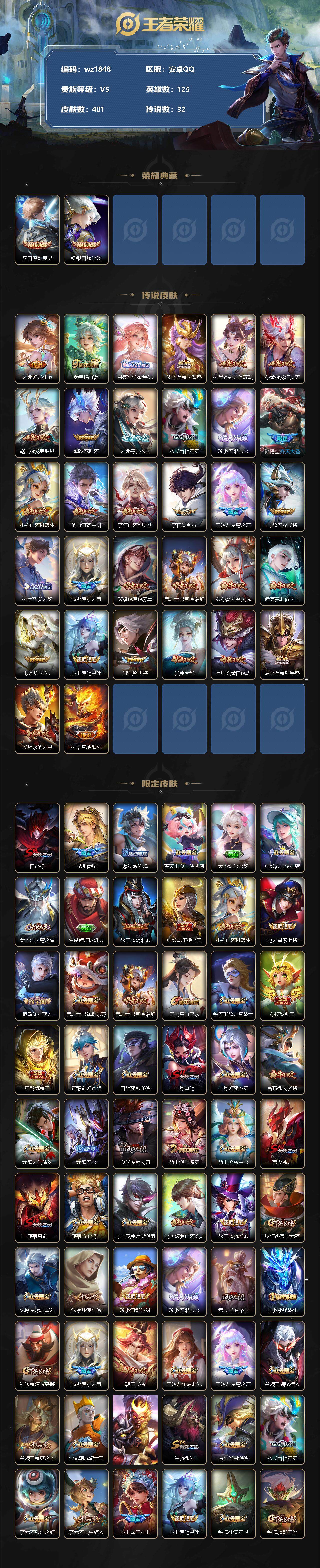 【游戏多多】【王者荣耀】【编号:3339159】【可二次实名】【wz1848】安卓Q-V5-至尊星耀V段位-125英雄-401皮肤-2典藏-0珍品无双-0无双-0珍品传说-32传说-121史诗 【英雄全皮】:杨戬全皮,狂铁全皮,猪八戒全皮,蒙恬全皮,海诺全皮 【荣耀典藏】:李白鸣剑曳影,铠银白咏叹调 【传说皮肤】:云缨幻光神枪,桑启鸣野蒿,朵莉亚心动手记,墨子黄金天蝎座,孙尚香乘龙问璇玑,孙策乘龙淬吴钩,赵云乘龙铭钟鼎,澜逐花归海,云缨鹤归松栖,张飞百相守梦,项羽无限倾心,孙悟空齐天大圣,小乔山海琳琅生,曜山海苍雷引,李信山海炽霜斩,李白诗剑行,王昭君星穹之声,马超无双飞将,孙策挚爱之约,露娜启示之音,裴擒虎寅虎赤拳,鲁班七号寅虎瑞焰,公孙离祈雪灵祝,诸葛亮时雨天司,镜炽阳神光,虞姬启明星使,曜云鹰飞将,伽罗太华,百里玄策白虎志,后羿黄金射手座,杨戬永曜之星,孙悟空地狱火 【限定皮肤】:白起狰,暃埋骨钱,蒙犽顽岩魄,蔡文姬夏日便利店,大乔绒语心约,虞姬夏日便利店,姜子牙天穹之誓,杨戬破阵退雄兵,狄仁杰阴阳师,虞姬凯尔特女王,小乔山海琳琅生,赵云皇家上将,嬴政优雅恋人,鲁班七号狮舞东方,鲁班七号寅虎瑞焰,庄周高山流水,钟无艳超时空战士,孙膑妖精王,扁鹊炼金王,扁鹊奇幻香踪,白起夜都怪侠,芈月重明,芈月幻夜卜梦,吕布御风骁将,元歌云间偶戏,元歌无心,夏侯惇朔风刀,甄姬游园惊梦,甄姬落雪兰心,曹操烛龙,典韦穷奇,典韦蓝屏警告,马可波罗暗影游猎,马可波罗山海玄木吟,狄仁杰魔术师,狄仁杰万华元夜,达摩星际陆战队,达摩沙漠行僧,项羽海滩派对,项羽无限倾心,老夫子醍醐杖,关羽冰锋战神,程咬金演武夺筹,露娜启示之音,韩信飞衡,王昭君午后时光,王昭君星穹之声,兰陵王驯魔猎人,兰陵王金庭之子,亚瑟潮玩骑士王,孙悟空齐天大圣,牛魔御旌,后羿圣弓游侠,张飞百相守梦,李元芳银河之约,李元芳云中旅人,虞姬霸王别姬,虞姬启明星使,钟馗神迹守卫,钟馗驱傩正仪,杨玉环遇见飞天,杨玉环寅虎心曲,杨戬永曜之星,杨戬潮玩骑兵,干将莫邪冰霜恋舞曲,干将莫邪真爱魔法,雅典娜单词大作战,雅典娜黎明之约,蔡文姬繁星吟游,太乙真人饕餮,鬼谷子原初探秘者,鬼谷子五谷丰年,诸葛亮时雨天司,大乔白鹤梁神女,黄忠火炮绅士,铠青龙志,苏烈千军破阵,百里玄策白虎志,百里玄策原初追逐者,百里守约朱雀志,弈星混沌棋,梦奇顽趣,公孙离祈雪灵祝,公孙离玉兔公主,沈梦溪星空之诺,沈梦溪大漠名商,明世隐疑决卦,明世隐吟游魔法,裴擒虎李小龙,裴擒虎寅虎赤拳,裴擒虎擒涛扼浪,狂铁御狮,狂铁电玩高手,米莱狄御霄,米莱狄胡桃异想国,瑶山海碧波行,云中君纤云弄巧,李信山海炽霜斩,伽罗太华,伽罗天狼溯光者,盾山御銮,孙策挚爱之约,猪八戒西部大镖客,猪八戒猪悟能,上官婉儿梁祝,上官婉儿神器万象笔,嫦娥拒霜思,嫦娥暖冬兔眠,曜山海苍雷引,西施玲珑珍味,蒙犽狂想玩偶喵,鲁班大师探海日志,镜匿光追影者,桑启海盐诗旅,暃星界游侠,戈娅驭风魔法,艾琳女武神,艾琳流音漫舞,赵怀真鹤归松栖,云缨鹤归松栖,司空震地狱燃心,阿古朵江河有灵,张良古海寻踪,蒙犽百解令,蒙恬荣光圣徽,高渐离燃音魔法,妲己灵卜魔法,鬼谷子天穹祈灯,姬小满妄想食味,大乔乘龙忆丹青,安琪拉乘龙聚宝船,孙尚香乘龙问璇玑,孙策乘龙淬吴钩,赵云乘龙铭钟鼎,沈梦溪龙舞盛年,鲁班七号蔬乡物语,李元芳蔬乡物语,刘邦剑破天穹,程咬金群星魔术团,镜青焰无极,项羽苍威无极,朵莉亚心动手记,海诺心动手记,刘备异域游侠,芈月浮光幕影,周瑜熔金海岸 【年限皮肤】:百里玄策白虎志,百里守约朱雀志,铠青龙志,裴擒虎寅虎赤拳,鲁班七号寅虎瑞焰,杨玉环寅虎心曲,杨戬永曜之星,公孙离祈雪灵祝,吕布御风骁将,诸葛亮时雨天司,伽罗太华,韩信飞衡,马超神威,瑶山海碧波行,马可波罗山海玄木吟,李信山海炽霜斩,小乔山海琳琅生,曜山海苍雷引,大乔乘龙忆丹青,安琪拉乘龙聚宝船,孙尚香乘龙问璇玑,孙策乘龙淬吴钩,赵云乘龙铭钟鼎 【赛季限定】:孙膑妖精王,扁鹊炼金王,白起狰,芈月重明,夏侯惇朔风刀,曹操烛龙,典韦穷奇,狄仁杰万华元夜,达摩沙漠行僧,老夫子醍醐杖,程咬金演武夺筹,兰陵王金庭之子,张良古海寻踪,牛魔御旌,李元芳云中旅人,虞姬凯尔特女王,钟馗驱傩正仪,雅典娜黎明之约,太乙真人饕餮,鬼谷子原初探秘者,苏烈千军破阵,百里玄策原初追逐者,弈星混沌棋,梦奇顽趣,沈梦溪大漠名商,明世隐疑决卦,裴擒虎擒涛扼浪,狂铁御狮,米莱狄御霄,盾山御銮,鲁班大师探海日志,桑启海盐诗旅,鬼谷子天穹祈灯,蒙恬荣光圣徽,刘邦剑破天穹,姜子牙天穹之誓 【战令限定】:蔡文姬夏日便利店,虞姬夏日便利店,鲁班七号狮舞东方,钟无艳超时空战士,扁鹊奇幻香踪,白起夜都怪侠,芈月幻夜卜梦,元歌云间偶戏,甄姬落雪兰心,典韦蓝屏警告,马可波罗暗影游猎,达摩星际陆战队,王昭君午后时光,兰陵王驯魔猎人,艾琳流