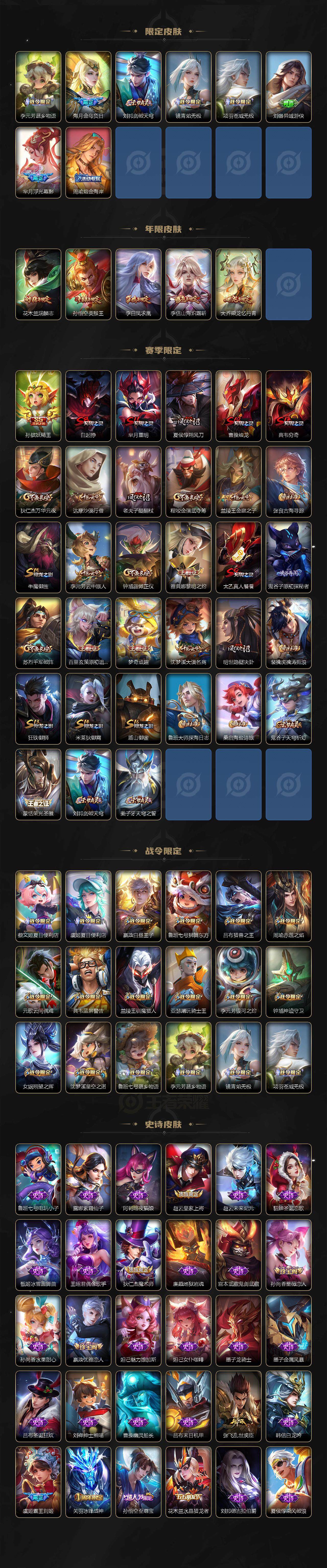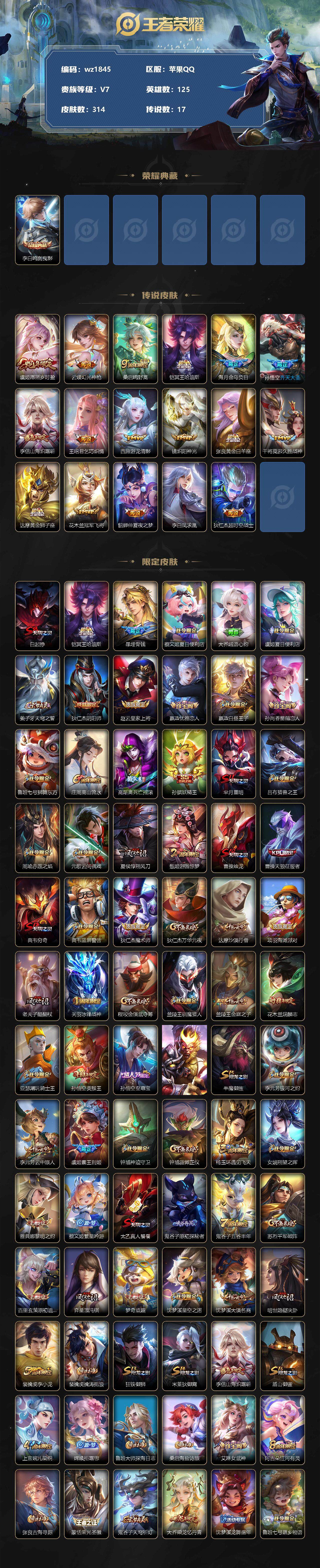 【游戏多多】【王者荣耀】【编号:3339164】【可二次实名】【wz1845】苹果Q-V7-最强王者段位-125英雄-314皮肤-1典藏-0珍品无双-0无双-0珍品传说-17传说-91史诗 【英雄全皮】:鬼谷子全皮,影全皮 【荣耀典藏】:李白鸣剑曳影 【传说皮肤】:虞姬愿照岁时盈,云缨幻光神枪,桑启鸣野蒿,铠冥王哈迪斯,海月金乌负日,孙悟空齐天大圣,李信山海炽霜斩,王昭君乞巧织情,西施游龙清影,镜炽阳神光,张良黄金白羊座,干将莫邪久胜战神,达摩黄金狮子座,花木兰冠军飞将,貂蝉仲夏夜之梦,李白凤求凰,狄仁杰超时空战士 【限定皮肤】:白起狰,铠冥王哈迪斯,暃埋骨钱,蔡文姬夏日便利店,大乔绒语心约,虞姬夏日便利店,姜子牙天穹之誓,狄仁杰阴阳师,赵云皇家上将,嬴政优雅恋人,嬴政白昼王子,孙尚香蔷薇恋人,鲁班七号狮舞东方,庄周高山流水,高渐离死亡摇滚,孙膑妖精王,芈月重明,吕布猎兽之王,周瑜赤莲之焰,元歌云间偶戏,夏侯惇朔风刀,甄姬游园惊梦,曹操烛龙,曹操天狼征服者,典韦穷奇,典韦蓝屏警告,狄仁杰魔术师,狄仁杰万华元夜,达摩沙漠行僧,项羽海滩派对,老夫子醍醐杖,关羽冰锋战神,程咬金演武夺筹,兰陵王驯魔猎人,兰陵王金庭之子,花木兰瑞麟志,亚瑟潮玩骑士王,孙悟空美猴王,孙悟空至尊宝,孙悟空齐天大圣,牛魔御旌,李元芳银河之约,李元芳云中旅人,虞姬霸王别姬,钟馗神迹守卫,钟馗驱傩正仪,杨玉环遇见飞天,女娲朔望之晖,雅典娜黎明之约,蔡文姬繁星吟游,太乙真人饕餮,鬼谷子原初探秘者,鬼谷子五谷丰年,苏烈千军破阵,百里玄策原初追逐者,弈星混沌棋,梦奇顽趣,沈梦溪星空之诺,沈梦溪大漠名商,明世隐疑决卦,裴擒虎李小龙,裴擒虎擒涛扼浪,狂铁御狮,米莱狄御霄,李信山海炽霜斩,盾山御銮,上官婉儿梁祝,嫦娥拒霜思,鲁班大师探海日志,桑启海盐诗旅,艾琳女武神,阿古朵江河有灵,张良古海寻踪,蒙恬荣光圣徽,鬼谷子天穹祈灯,大乔乘龙忆丹青,沈梦溪龙舞盛年,鲁班七号蔬乡物语,李元芳蔬乡物语,海月金乌负日,刘邦剑破天穹,镜青焰无极,项羽苍威无极,刘备异域游侠,芈月浮光幕影,周瑜熔金海岸 【年限皮肤】:花木兰瑞麟志,孙悟空美猴王,李白凤求凰,李信山海炽霜斩,大乔乘龙忆丹青 【赛季限定】:孙膑妖精王,白起狰,芈月重明,夏侯惇朔风刀,曹操烛龙,典韦穷奇,狄仁杰万华元夜,达摩沙漠行僧,老夫子醍醐杖,程咬金演武夺筹,兰陵王金庭之子,张良古海寻踪,牛魔御旌,李元芳云中旅人,钟馗驱傩正仪,雅典娜黎明之约,太乙真人饕餮,鬼谷子原初探秘者,苏烈千军破阵,百里玄策原初追逐者,弈星混沌棋,梦奇顽趣,沈梦溪大漠名商,明世隐疑决卦,裴擒虎擒涛扼浪,狂铁御狮,米莱狄御霄,盾山御銮,鲁班大师探海日志,桑启海盐诗旅,鬼谷子天穹祈灯,蒙恬荣光圣徽,刘邦剑破天穹,姜子牙天穹之誓 【战令限定】:蔡文姬夏日便利店,虞姬夏日便利店,嬴政白昼王子,鲁班七号狮舞东方,吕布猎兽之王,周瑜赤莲之焰,元歌云间偶戏,典韦蓝屏警告,兰陵王驯魔猎人,亚瑟潮玩骑士王,李元芳银河之约,钟馗神迹守卫,女娲朔望之晖,沈梦溪星空之诺,鲁班七号蔬乡物语,李元芳蔬乡物语,镜青焰无极,项羽苍威无极 【史诗皮肤】:鲁班七号电玩小子,露娜紫霞仙子,阿轲暗夜猫娘,赵云皇家上将,赵云未来纪元,貂蝉圣诞恋歌,甄姬冰雪圆舞曲,王昭君偶像歌手,狄仁杰魔术师,廉颇地狱岩魂,宫本武藏鬼剑武藏,孙尚香蔷薇恋人,孙尚香水果甜心,嬴政优雅恋人,妲己魅力维加斯,妲己女仆咖啡,墨子龙骑士,墨子金属风暴,吕布圣诞狂欢,刘禅绅士熊喵,曹操幽灵船长,吕布末日机甲,张飞乱世虎臣,韩信白龙吟,虞姬霸王别姬,关羽冰锋战神,孙悟空至尊宝,花木兰水晶猎龙者,刘邦德古拉伯爵,夏侯惇乘风破浪,小乔缤纷独角兽,兰陵王暗隐猎兽者,诸葛亮黄金分割率,甄姬游园惊梦,雅典娜冰冠公主,安琪拉心灵骇客,百里守约特工魅影,铠曙光守护者,蔡文姬舞动绿茵,刘禅天才门将,李元芳逐浪之夏,程咬金功夫厨神,白起星夜王子,阿轲节奏热浪,杨玉环遇见飞天,嬴政白昼王子,孙策猫狗日记,大乔猫狗日记,花木兰瑞麟志,典韦蓝屏警告,伽罗箭羽风息,鲁班七号狮舞东方,狄仁杰鹰眼统帅,兰陵王驯魔猎人,上官婉儿梁祝,曹操天狼征服者,蔡文姬繁星吟游,李元芳银河之约,娜可露露晚萤,大乔白蛇,橘右京修罗,瑶遇见神鹿,孙尚香时之恋人,百里玄策原初追逐者,裴擒虎李小龙,元歌云间偶戏,沈梦溪月团寄思,庄周高山流水,嫦娥拒霜思,雅典娜黎明之约,鬼谷子五谷丰年,梦奇顽趣,阿古朵江河有灵,蒙恬荣光圣徽,大乔乘龙忆丹青,鲁班七号蔬乡物语,镜青焰无极,黄忠怒海争锋,芈月浮光幕影,蔡文姬夏日便利店,暃埋骨钱,大司命东方月初,姬小满战舞者,亚连破空之剑,马可波罗星界特工,艾琳陌上桑,百里守约百相守梦,牛魔星界战将,白起苍鳞隐世,弈星万物之道,公孙离涂山容容 【其他皮肤】:项羽海滩派对,韩信教廷特使,韩信街头霸王,露娜哥特玫瑰