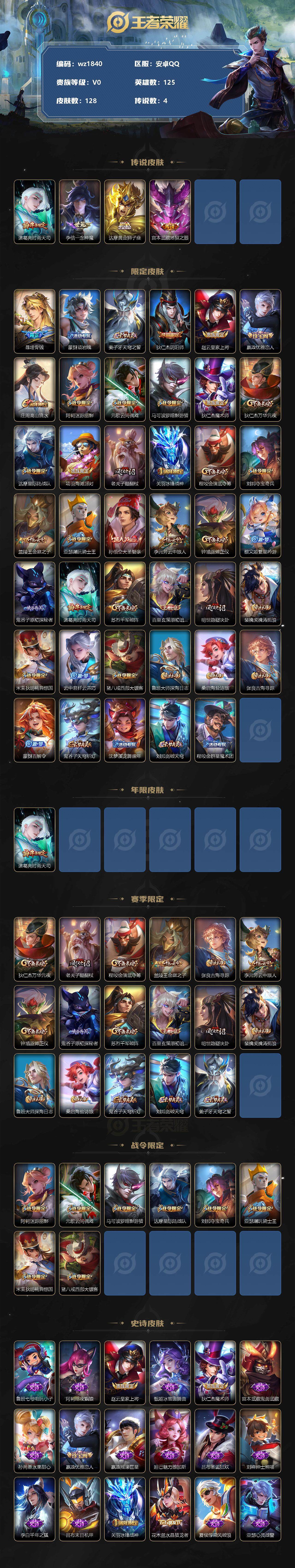 【游戏多多】【王者荣耀】【编号:3339170】【可二次实名】【wz1840】【商品标题】:安卓Q-V0-永恒钻石II段位-125英雄-128皮肤-0典藏-0珍品无双-0无双-0珍品传说-4传说-36史诗 【传说皮肤】:诸葛亮时雨天司,李信一念神魔,达摩黄金狮子座,宫本武藏地狱之眼 【限定皮肤】:暃埋骨钱,蒙犽顽岩魄,姜子牙天穹之誓,狄仁杰阴阳师,赵云皇家上将,嬴政优雅恋人,庄周高山流水,阿轲迷踪丽影,元歌云间偶戏,马可波罗暗影游猎,狄仁杰魔术师,狄仁杰万华元夜,达摩星际陆战队,项羽海滩派对,老夫子醍醐杖,关羽冰锋战神,程咬金演武夺筹,刘邦夺宝奇兵,兰陵王金庭之子,亚瑟潮玩骑士王,孙悟空大圣娶亲,李元芳云中旅人,钟馗驱傩正仪,蔡文姬繁星吟游,鬼谷子原初探秘者,诸葛亮时雨天司,苏烈千军破阵,百里玄策原初追逐者,明世隐疑决卦,裴擒虎擒涛扼浪,米莱狄胡桃异想国,云中君纤云弄巧,猪八戒西部大镖客,鲁班大师探海日志,桑启海盐诗旅,张良古海寻踪,蒙犽百解令,鬼谷子天穹祈灯,沈梦溪龙舞盛年,刘邦剑破天穹,程咬金群星魔术团 【年限皮肤】:诸葛亮时雨天司 【赛季限定】:狄仁杰万华元夜,老夫子醍醐杖,程咬金演武夺筹,兰陵王金庭之子,张良古海寻踪,李元芳云中旅人,钟馗驱傩正仪,鬼谷子原初探秘者,苏烈千军破阵,百里玄策原初追逐者,明世隐疑决卦,裴擒虎擒涛扼浪,鲁班大师探海日志,桑启海盐诗旅,鬼谷子天穹祈灯,刘邦剑破天穹,姜子牙天穹之誓 【战令限定】:阿轲迷踪丽影,元歌云间偶戏,马可波罗暗影游猎,达摩星际陆战队,刘邦夺宝奇兵,亚瑟潮玩骑士王,米莱狄胡桃异想国,猪八戒西部大镖客 【史诗皮肤】:鲁班七号电玩小子,阿轲暗夜猫娘,赵云皇家上将,甄姬冰雪圆舞曲,狄仁杰魔术师,宫本武藏鬼剑武藏,孙尚香水果甜心,嬴政优雅恋人,嬴政摇滚巨星,妲己魅力维加斯,吕布圣诞狂欢,刘禅绅士熊喵,李白千年之狐,吕布末日机甲,关羽冰锋战神,花木兰水晶猎龙者,夏侯惇乘风破浪,亚瑟心灵战警,安琪拉心灵骇客,铠曙光守护者,孙悟空大圣娶亲,伽罗箭羽风息,狄仁杰鹰眼统帅,蔡文姬繁星吟游,阿轲迷踪丽影,马可波罗暗影游猎,百里玄策原初追逐者,云中君纤云弄巧,元歌云间偶戏,米莱狄胡桃异想国,庄周高山流水,哪吒雪上飞焰,蒙犽百解令,蒙犽顽岩魄,暃埋骨钱,公孙离涂山容容 【其他皮肤】:项羽海滩派对,韩信街头霸王,达摩大发明家,赵云白执事,芈月红桃皇后,白起白色死神,牛魔西部大镖客,安琪拉玩偶对对碰,孙膑天使之翼,妲己少女阿狸,典韦黄金武士,亚瑟死亡骑士,达摩拳王,刘备万事如意,狄仁杰阴阳师,刘备纽约教父,钟无艳海滩丽影,宫本武藏霸王丸,老夫子功夫老勺,苏烈坚韧之力,大乔守护之力,项羽科学大爆炸,庄周奇妙博物学,沈梦溪鲨炮海盗猫,明世隐疑决卦,刘邦夺宝奇兵,盾山圆桌骑士,老夫子醍醐杖,猪八戒西部大镖客,狂铁特工战影,鬼谷子原初探秘者,狄仁杰万华元夜,亚瑟潮玩骑士王,刘禅秘密基地,杨戬次元傲视,露娜瓷语鉴心,达摩星际陆战队,程咬金演武夺筹,张良缤纷绘卷,盘古重装意志,钟馗驱傩正仪,鲁班大师乓乓大师,苏烈千军破阵,典韦铁甲之心,兰陵王金庭之子,刘禅唤灵魔甲,蒙恬蔚蓝守将,李元芳云中旅人,桑启海盐诗旅,猪八戒潮玩探月行,裴擒虎擒涛扼浪,鲁班大师探海日志,李元芳妄想特派,哪吒热血海滩,张良古海寻踪,兰陵王幻夜行动,后羿完美运算,程咬金暖冬絮语,鬼谷子天穹祈灯,廉颇功夫炙烤,沈梦溪龙舞盛年,钟无艳春野之旅,刘邦剑破天穹,程咬金群星魔术团,大司命暗都幽影,姜子牙天穹之誓,姜子牙星梦巡礼,甄姬逆浪荇歌,鲁班七号福禄兄弟,露娜绯红之刃,貂蝉异域舞娘,花木兰剑舞者,后羿精灵王,刘禅英喵野望,太乙真人圆桌骑士,东皇太一东海龙王,铠龙域领主,百里守约绝影神枪,百里玄策威尼斯狂欢,弈星踏雪寻梅,司马懿魇语军师,伽罗花见巫女,李信灼热之刃,云中君荷鲁斯之眼,马超幸存者,西施归虚梦演,镜冰刃幻境,澜孤猎 【内测皮肤】:嬴政优雅恋人,狂铁特工战影 【营地ID】:2140206884