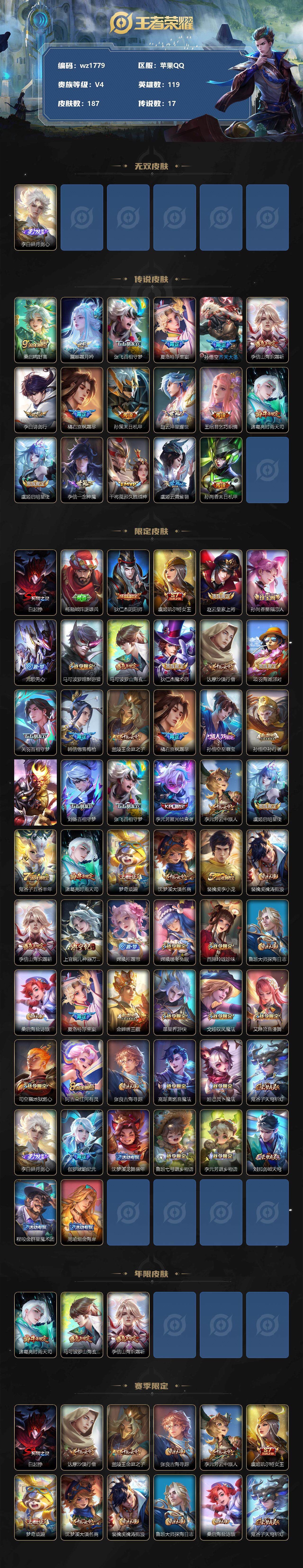 【游戏多多】【王者荣耀】【编号:3339222】【可二次实名】【wz1779】【商品标题】:苹果Q-V4-永恒钻石V段位-119英雄-187皮肤-0典藏-0珍品无双-1无双-0珍品传说-17传说-60史诗 【英雄全皮】:橘右京全皮,李信全皮 【无双皮肤】:李白碎月剑心 【传说皮肤】:桑启鸣野蒿,露娜霜月吟,张飞百相守梦,夏洛特浮生妄,孙悟空齐天大圣,李信山海炽霜斩,李白诗剑行,橘右京枫霜尽,孙策末日机甲,赵云淬星耀世,王昭君乞巧织情,诸葛亮时雨天司,虞姬启明星使,李信一念神魔,干将莫邪久胜战神,虞姬云霓雀翎,孙尚香末日机甲 【限定皮肤】:白起狰,杨戬破阵退雄兵,狄仁杰阴阳师,虞姬凯尔特女王,赵云皇家上将,孙尚香蔷薇恋人,元歌无心,马可波罗暗影游猎,马可波罗山海玄木吟,狄仁杰魔术师,达摩沙漠行僧,项羽海滩派对,关羽百相守梦,韩信傲雪梅枪,兰陵王金庭之子,橘右京枫霜尽,孙悟空至尊宝,孙悟空孙行者,孙悟空齐天大圣,刘备百相守梦,张飞百相守梦,李元芳匿光侦查者,李元芳云中旅人,虞姬启明星使,鬼谷子五谷丰年,诸葛亮时雨天司,梦奇顽趣,沈梦溪大漠名商,裴擒虎李小龙,裴擒虎擒涛扼浪,李信山海炽霜斩,上官婉儿神器万象笔,嫦娥拒霜思,嫦娥暖冬兔眠,西施玲珑珍味,鲁班大师探海日志,桑启海盐诗旅,夏洛特浮生妄,金蝉唐三藏,暃星界游侠,戈娅驭风魔法,艾琳流音漫舞,司空震地狱燃心,阿古朵江河有灵,张良古海寻踪,高渐离燃音魔法,妲己灵卜魔法,鬼谷子天穹祈灯,李白碎月剑心,伽罗琥珀纪元,沈梦溪龙舞盛年,鲁班七号蔬乡物语,李元芳蔬乡物语,刘邦剑破天穹,程咬金群星魔术团,周瑜熔金海岸 【年限皮肤】:诸葛亮时雨天司,马可波罗山海玄木吟,李信山海炽霜斩 【赛季限定】:白起狰,达摩沙漠行僧,兰陵王金庭之子,张良古海寻踪,李元芳云中旅人,虞姬凯尔特女王,梦奇顽趣,沈梦溪大漠名商,裴擒虎擒涛扼浪,鲁班大师探海日志,桑启海盐诗旅,鬼谷子天穹祈灯,刘邦剑破天穹 【战令限定】:马可波罗暗影游猎,艾琳流音漫舞,嫦娥暖冬兔眠,西施玲珑珍味,司空震地狱燃心,暃星界游侠,戈娅驭风魔法,高渐离燃音魔法,妲己灵卜魔法,鲁班七号蔬乡物语,李元芳蔬乡物语 【史诗皮肤】:项羽苍穹之光,赵云皇家上将,赵云未来纪元,甄姬冰雪圆舞曲,王昭君偶像歌手,狄仁杰魔术师,宫本武藏鬼剑武藏,孙尚香蔷薇恋人,孙尚香水果甜心,妲己女仆咖啡,墨子金属风暴,刘禅绅士熊喵,李白千年之狐,吕布末日机甲,张飞乱世虎臣,孙悟空至尊宝,花木兰水晶猎龙者,刘邦德古拉伯爵,夏侯惇乘风破浪,小乔缤纷独角兽,兰陵王暗隐猎兽者,亚瑟心灵战警,雅典娜冰冠公主,安琪拉心灵骇客,百里守约特工魅影,铠曙光守护者,李元芳逐浪之夏,程咬金功夫厨神,白起星夜王子,阿轲节奏热浪,孙策猫狗日记,大乔猫狗日记,狄仁杰鹰眼统帅,不知火舞魅语,橘右京修罗,马可波罗暗影游猎,裴擒虎李小龙,钟馗乐园奇幻夜,孙悟空孙行者,嫦娥拒霜思,韩信傲雪梅枪,金蝉唐三藏,鬼谷子五谷丰年,上官婉儿神器万象笔,元歌无心,梦奇顽趣,暃星界游侠,马可波罗山海玄木吟,刘备百相守梦,关羽百相守梦,刘禅电玩爆裂旋风,戈娅驭风魔法,百里守约真我赫兹,李元芳匿光侦查者,司空震地狱燃心,阿古朵江河有灵,妲己灵卜魔法,高渐离燃音魔法,伽罗琥珀纪元,鲁班七号蔬乡物语,黄忠怒海争锋 【其他皮肤】:项羽海滩派对,韩信教廷特使,韩信街头霸王,赵云白执事,赵云忍炎影,芈月红桃皇后,程咬金星际陆战队,程咬金爱与正义,白起白色死神,牛魔西部大镖客,扁鹊化身博士,扁鹊救世之瞳,安琪拉玩偶对对碰,孙膑天使之翼,姜子牙时尚教父,妲己少女阿狸,典韦黄金武士,亚瑟死亡骑士,达摩拳王,花木兰兔女郎,张飞五福同心,甄姬花好人间,刘备万事如意,宫本武藏万象初新,后羿阿尔法小队,狄仁杰阴阳师,刘备纽约教父,虞姬凯尔特女王,白起狰,钟无艳海滩丽影,王昭君幻想奇妙夜,老夫子功夫老勺,李白敏锐之力,苏烈坚韧之力,大乔守护之力,明世隐虹云星官,吕布野性能量,沈梦溪鲨炮海盗猫,姜子牙炽热元素使,盾山圆桌骑士,狂铁特工战影,刘禅秘密基地,露娜瓷语鉴心,张良缤纷绘卷,鲁班大师乓乓大师,达摩沙漠行僧,程咬金无双福将,兰陵王金庭之子,刘禅唤灵魔甲,沈梦溪大漠名商,蒙恬蔚蓝守将,李元芳云中旅人,刘备潮玩造梦师,桑启海盐诗旅,嫦娥暖冬兔眠,猪八戒潮玩探月行,牛魔牛运亨通,白起乐园追猎者,赵怀真太极少年,裴擒虎擒涛扼浪,太乙真人劲辣红锅,莱西奥西部游侠,鲁班大师探海日志,西施玲珑珍味,李元芳妄想特派,哪吒热血海滩,艾琳流音漫舞,张良古海寻踪,钟无艳聚星闪耀,海月王牌新星,亚连破局者,后羿完美运算,程咬金暖冬絮语,鬼谷子天穹祈灯,妲己灵卜魔法,海诺时空谍影,朵莉亚金色潮汐,廉颇功夫炙烤,亚瑟鸿运当头,沈梦溪龙舞盛年,钟无艳春野之旅,李元芳蔬乡物语,扁鹊无尽旅途,刘邦剑破天穹,盘古经纬探寻者,程咬金群星魔术团,大司