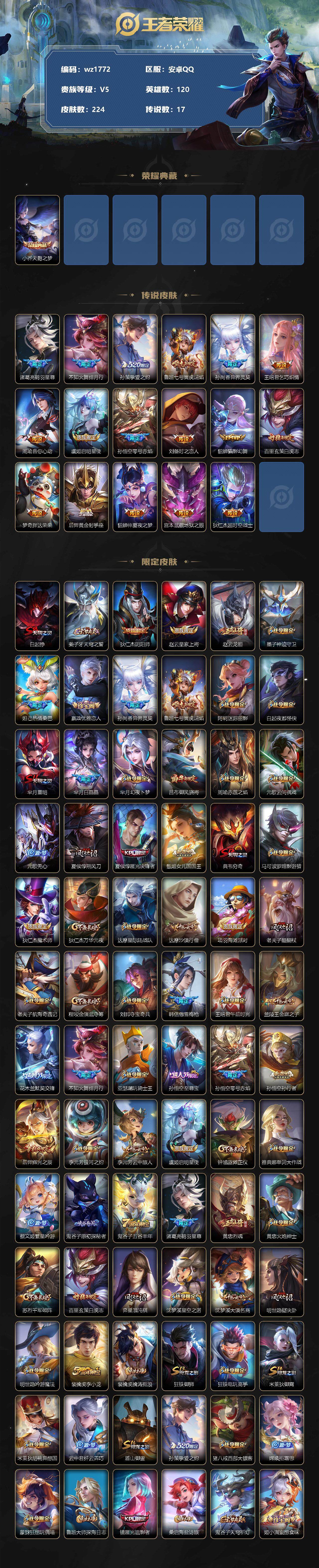 【游戏多多】【王者荣耀】【编号:3339229】【可二次实名】【wz1772】【商品标题】:安卓Q-V5-至尊星耀III段位-120英雄-224皮肤-1典藏-0珍品无双-0无双-0珍品传说-17传说-57史诗 【荣耀典藏】:小乔天鹅之梦 【传说皮肤】:诸葛亮鹤羽星尊,不知火舞绯月行,孙策挚爱之约,鲁班七号寅虎瑞焰,孙尚香异界灵契,王昭君乞巧织情,周瑜音你心动,虞姬启明星使,孙悟空零号赤焰,刘备时之恋人,貂蝉猫影幻舞,百里玄策白虎志,梦奇胖达荣荣,后羿黄金射手座,貂蝉仲夏夜之梦,宫本武藏地狱之眼,狄仁杰超时空战士 【限定皮肤】:白起狰,姜子牙天穹之誓,狄仁杰阴阳师,赵云皇家上将,赵云龙胆,墨子神迹守卫,妲己热情桑巴,嬴政优雅恋人,孙尚香异界灵契,鲁班七号寅虎瑞焰,阿轲迷踪丽影,白起夜都怪侠,芈月重明,芈月白晶晶,芈月幻夜卜梦,吕布御风骁将,周瑜赤莲之焰,元歌云间偶戏,元歌无心,夏侯惇朔风刀,夏侯惇匿光决锋者,甄姬女儿国国王,典韦穷奇,马可波罗暗影游猎,狄仁杰魔术师,狄仁杰万华元夜,达摩星际陆战队,达摩沙漠行僧,项羽海滩派对,老夫子醍醐杖,老夫子航海奇遇记,程咬金演武夺筹,刘邦夺宝奇兵,韩信傲雪梅枪,王昭君午后时光,兰陵王金庭之子,花木兰默契交锋,不知火舞绯月行,亚瑟潮玩骑士王,孙悟空至尊宝,孙悟空零号赤焰,孙悟空孙行者,后羿辉光之辰,李元芳银河之约,李元芳云中旅人,虞姬启明星使,钟馗驱傩正仪,雅典娜单词大作战,蔡文姬繁星吟游,鬼谷子原初探秘者,鬼谷子五谷丰年,诸葛亮鹤羽星尊,黄忠烈魂,黄忠火炮绅士,苏烈千军破阵,百里玄策白虎志,弈星混沌棋,沈梦溪星空之诺,沈梦溪大漠名商,明世隐疑决卦,明世隐吟游魔法,裴擒虎李小龙,裴擒虎擒涛扼浪,狂铁御狮,狂铁电玩高手,米莱狄御霄,米莱狄胡桃异想国,云中君纤云弄巧,盾山御銮,孙策挚爱之约,猪八戒西部大镖客,嫦娥拒霜思,蒙犽狂想玩偶喵,鲁班大师探海日志,镜匿光追影者,桑启海盐诗旅,鬼谷子天穹祈灯,姬小满妄想食味,刘邦剑破天穹,周瑜熔金海岸 【年限皮肤】:百里玄策白虎志,鲁班七号寅虎瑞焰,后羿辉光之辰,吕布御风骁将,黄忠烈魂,赵云龙胆 【赛季限定】:白起狰,芈月重明,夏侯惇朔风刀,典韦穷奇,狄仁杰万华元夜,达摩沙漠行僧,老夫子醍醐杖,程咬金演武夺筹,兰陵王金庭之子,李元芳云中旅人,钟馗驱傩正仪,鬼谷子原初探秘者,苏烈千军破阵,弈星混沌棋,沈梦溪大漠名商,明世隐疑决卦,裴擒虎擒涛扼浪,狂铁御狮,米莱狄御霄,盾山御銮,鲁班大师探海日志,桑启海盐诗旅,鬼谷子天穹祈灯,刘邦剑破天穹,姜子牙天穹之誓 【战令限定】:墨子神迹守卫,阿轲迷踪丽影,白起夜都怪侠,芈月幻夜卜梦,周瑜赤莲之焰,元歌云间偶戏,马可波罗暗影游猎,达摩星际陆战队,老夫子航海奇遇记,刘邦夺宝奇兵,王昭君午后时光,亚瑟潮玩骑士王,李元芳银河之约,雅典娜单词大作战,黄忠火炮绅士,沈梦溪星空之诺,明世隐吟游魔法,狂铁电玩高手,米莱狄胡桃异想国,猪八戒西部大镖客,蒙犽狂想玩偶喵 【史诗皮肤】:鲁班七号电玩小子,赵云皇家上将,貂蝉圣诞恋歌,甄姬冰雪圆舞曲,王昭君偶像歌手,狄仁杰魔术师,廉颇地狱岩魂,孙尚香水果甜心,嬴政优雅恋人,嬴政暗夜贵公子,妲己魅力维加斯,妲己女仆咖啡,墨子金属风暴,吕布圣诞狂欢,刘禅绅士熊喵,李白千年之狐,妲己热情桑巴,孙悟空至尊宝,夏侯惇乘风破浪,小乔缤纷独角兽,兰陵王暗隐猎兽者,诸葛亮黄金分割率,雅典娜冰冠公主,后羿辉光之辰,李元芳逐浪之夏,程咬金功夫厨神,狄仁杰鹰眼统帅,蔡文姬繁星吟游,李元芳银河之约,阿轲迷踪丽影,橘右京修罗,赵云龙胆,黄忠烈魂,孙尚香时之恋人,马可波罗暗影游猎,蒙犽狂想玩偶喵,裴擒虎李小龙,云中君纤云弄巧,元歌云间偶戏,芈月白晶晶,吕布御风骁将,花木兰默契交锋,米莱狄胡桃异想国,百里玄策热力回旋,老夫子航海奇遇记,孙悟空孙行者,嫦娥拒霜思,镜匿光追影者,黄忠火炮绅士,甄姬女儿国国王,韩信傲雪梅枪,明世隐吟游魔法,夏侯惇匿光决锋者,狂铁电玩高手,鬼谷子五谷丰年,元歌无心,姬小满妄想食味 【其他皮肤】:项羽海滩派对,韩信教廷特使,韩信街头霸王,露娜哥特玫瑰,阿轲致命风华,达摩大发明家,赵云忍炎影,白起白色死神,扁鹊化身博士,庄周鲤鱼之梦,宫本武藏未来纪元,安琪拉玩偶对对碰,妲己少女阿狸,典韦黄金武士,亚瑟死亡骑士,张飞五福同心,甄姬花好人间,刘备万事如意,宫本武藏万象初新,后羿阿尔法小队,狄仁杰阴阳师,刘备纽约教父,刘备汉昭烈帝,关羽龙腾万里,墨子进击墨子号,白起狰,钟无艳海滩丽影,宫本武藏霸王丸,王昭君幻想奇妙夜,芈月重明,狂铁命运角斗场,老夫子功夫老勺,孙尚香沉稳之力,典韦穷奇,诸葛亮掌控之力,鬼谷子幻乐之宴,狂铁御狮,苏烈坚韧之力,大乔守护之力,项羽科学大爆炸,米莱狄御霄,明世隐虹云星官,小乔丁香结,吕布野性能量,盾山御銮,孙膑归虚梦演,沈梦溪鲨炮海盗猫,夏侯惇