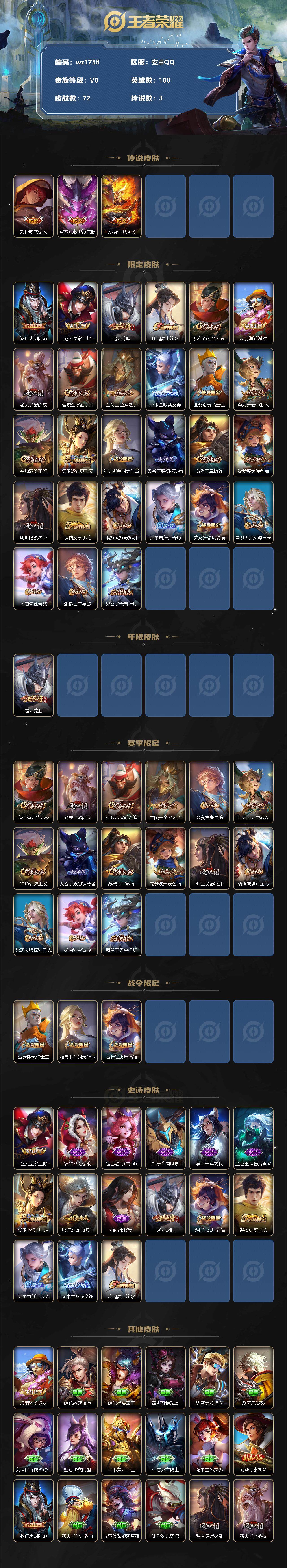 【游戏多多】【王者荣耀】【编号:3339242】【可二次实名】【wz1758】【商品标题】:安卓Q-V0-荣耀黄金I段位-100英雄-72皮肤-0典藏-0珍品无双-0无双-0珍品传说-3传说-15史诗 【传说皮肤】:刘备时之恋人,宫本武藏地狱之眼,孙悟空地狱火 【限定皮肤】:狄仁杰阴阳师,赵云皇家上将,赵云龙胆,庄周高山流水,狄仁杰万华元夜,项羽海滩派对,老夫子醍醐杖,程咬金演武夺筹,兰陵王金庭之子,花木兰默契交锋,亚瑟潮玩骑士王,李元芳云中旅人,钟馗驱傩正仪,杨玉环遇见飞天,雅典娜单词大作战,鬼谷子原初探秘者,苏烈千军破阵,沈梦溪大漠名商,明世隐疑决卦,裴擒虎李小龙,裴擒虎擒涛扼浪,云中君纤云弄巧,蒙犽狂想玩偶喵,鲁班大师探海日志,桑启海盐诗旅,张良古海寻踪,鬼谷子天穹祈灯 【年限皮肤】:赵云龙胆 【赛季限定】:狄仁杰万华元夜,老夫子醍醐杖,程咬金演武夺筹,兰陵王金庭之子,张良古海寻踪,李元芳云中旅人,钟馗驱傩正仪,鬼谷子原初探秘者,苏烈千军破阵,沈梦溪大漠名商,明世隐疑决卦,裴擒虎擒涛扼浪,鲁班大师探海日志,桑启海盐诗旅,鬼谷子天穹祈灯 【战令限定】:亚瑟潮玩骑士王,雅典娜单词大作战,蒙犽狂想玩偶喵 【史诗皮肤】:赵云皇家上将,貂蝉圣诞恋歌,妲己魅力维加斯,墨子金属风暴,李白千年之狐,兰陵王暗隐猎兽者,杨玉环遇见飞天,狄仁杰鹰眼统帅,橘右京修罗,赵云龙胆,蒙犽狂想玩偶喵,裴擒虎李小龙,云中君纤云弄巧,花木兰默契交锋,庄周高山流水 【其他皮肤】:项羽海滩派对,韩信教廷特使,韩信街头霸王,露娜哥特玫瑰,达摩大发明家,赵云忍炎影,安琪拉玩偶对对碰,妲己少女阿狸,典韦黄金武士,亚瑟死亡骑士,花木兰兔女郎,刘备万事如意,狄仁杰阴阳师,老夫子功夫老勺,沈梦溪鲨炮海盗猫,哪吒次元突破,明世隐疑决卦,老夫子醍醐杖,廉颇无尽征程,鬼谷子原初探秘者,雅典娜单词大作战,狄仁杰万华元夜,亚瑟潮玩骑士王,程咬金演武夺筹,盘古重装意志,钟馗驱傩正仪,苏烈千军破阵,妲己紫罗兰之誓,兰陵王金庭之子,沈梦溪大漠名商,蒙恬蔚蓝守将,李元芳云中旅人,桑启海盐诗旅,裴擒虎擒涛扼浪,鲁班大师探海日志,张良古海寻踪,后羿完美运算,鬼谷子天穹祈灯,鲁班七号福禄兄弟,高渐离金属狂潮,孙悟空西部大镖客,李白范海辛,李元芳特种部队,夏侯惇战争骑士,元歌午夜歌剧院,司马懿魇语军师,盾山极冰防御线,李信灼热之刃,盘古创世神祝,曜归虚梦演,镜冰刃幻境,蒙恬秩序猎龙将,澜孤猎,云缨赤焰之缨 【营地ID】:2115920939