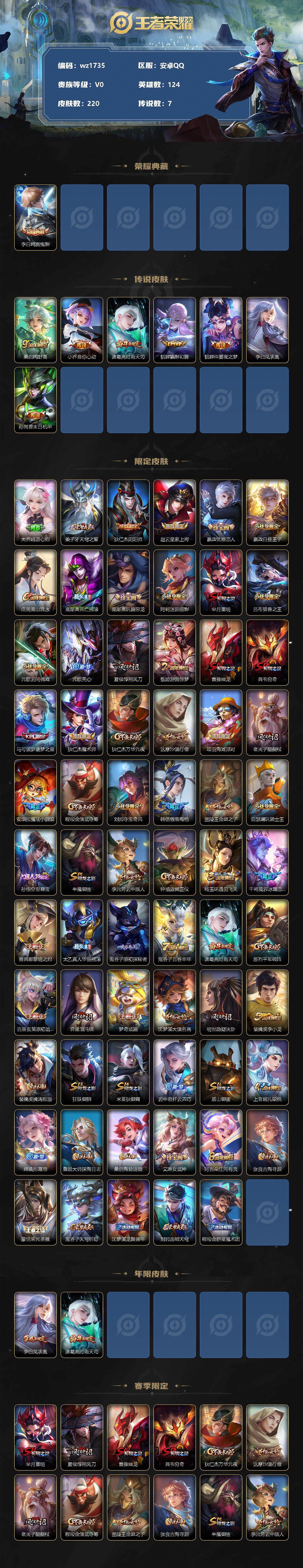 【游戏多多】【王者荣耀】【编号:3339273】【可二次实名】【wz1735】【商品标题】:安卓Q-V0-荣耀黄金II段位-124英雄-220皮肤-1典藏-0珍品无双-0无双-0珍品传说-7传说-53史诗 【荣耀典藏】:李白鸣剑曳影 【传说皮肤】:桑启鸣野蒿,小乔音你心动,诸葛亮时雨天司,貂蝉猫影幻舞,貂蝉仲夏夜之梦,李白凤求凰,孙尚香末日机甲 【限定皮肤】:大乔绒语心约,姜子牙天穹之誓,狄仁杰阴阳师,赵云皇家上将,嬴政优雅恋人,嬴政白昼王子,庄周高山流水,高渐离死亡摇滚,高渐离玩趣恶龙,阿轲迷踪丽影,芈月重明,吕布猎兽之王,元歌云间偶戏,元歌无心,夏侯惇朔风刀,甄姬游园惊梦,曹操烛龙,典韦穷奇,马可波罗逐梦之星,狄仁杰魔术师,狄仁杰万华元夜,达摩沙漠行僧,项羽海滩派对,老夫子醍醐杖,安琪拉魔法小厨娘,程咬金演武夺筹,刘邦夺宝奇兵,韩信傲雪梅枪,兰陵王金庭之子,亚瑟潮玩骑士王,孙悟空至尊宝,牛魔御旌,李元芳云中旅人,钟馗驱傩正仪,杨玉环遇见飞天,干将莫邪冰霜恋舞曲,雅典娜黎明之约,太乙真人华丽摇滚,鬼谷子原初探秘者,鬼谷子五谷丰年,诸葛亮时雨天司,苏烈千军破阵,百里玄策原初追逐者,弈星混沌棋,梦奇顽趣,沈梦溪大漠名商,明世隐疑决卦,裴擒虎李小龙,裴擒虎擒涛扼浪,狂铁御狮,米莱狄御霄,云中君纤云弄巧,盾山御銮,上官婉儿梁祝,嫦娥拒霜思,鲁班大师探海日志,桑启海盐诗旅,艾琳女武神,阿古朵江河有灵,张良古海寻踪,蒙恬荣光圣徽,鬼谷子天穹祈灯,沈梦溪龙舞盛年,刘邦剑破天穹,程咬金群星魔术团 【年限皮肤】:李白凤求凰,诸葛亮时雨天司 【赛季限定】:芈月重明,夏侯惇朔风刀,曹操烛龙,典韦穷奇,狄仁杰万华元夜,达摩沙漠行僧,老夫子醍醐杖,程咬金演武夺筹,兰陵王金庭之子,张良古海寻踪,牛魔御旌,李元芳云中旅人,钟馗驱傩正仪,雅典娜黎明之约,鬼谷子原初探秘者,苏烈千军破阵,百里玄策原初追逐者,弈星混沌棋,梦奇顽趣,沈梦溪大漠名商,明世隐疑决卦,裴擒虎擒涛扼浪,狂铁御狮,米莱狄御霄,盾山御銮,鲁班大师探海日志,桑启海盐诗旅,鬼谷子天穹祈灯,蒙恬荣光圣徽,刘邦剑破天穹,姜子牙天穹之誓 【战令限定】:嬴政白昼王子,阿轲迷踪丽影,吕布猎兽之王,元歌云间偶戏,刘邦夺宝奇兵,亚瑟潮玩骑士王 【史诗皮肤】:鲁班七号电玩小子,项羽苍穹之光,阿轲暗夜猫娘,赵云皇家上将,赵云未来纪元,甄姬冰雪圆舞曲,王昭君偶像歌手,狄仁杰魔术师,廉颇地狱岩魂,宫本武藏鬼剑武藏,孙尚香水果甜心,嬴政优雅恋人,嬴政摇滚巨星,妲己魅力维加斯,妲己女仆咖啡,墨子金属风暴,吕布末日机甲,安琪拉魔法小厨娘,韩信白龙吟,孙悟空至尊宝,刘邦德古拉伯爵,夏侯惇乘风破浪,甄姬游园惊梦,马可波罗逐梦之星,亚瑟心灵战警,雅典娜冰冠公主,蔡文姬舞动绿茵,刘禅天才门将,李元芳逐浪之夏,杨玉环遇见飞天,嬴政白昼王子,孙策猫狗日记,干将莫邪冰霜恋舞曲,狄仁杰鹰眼统帅,上官婉儿梁祝,不知火舞魅语,阿轲迷踪丽影,橘右京修罗,百里玄策原初追逐者,裴擒虎李小龙,云中君纤云弄巧,元歌云间偶戏,庄周高山流水,嫦娥拒霜思,雅典娜黎明之约,韩信傲雪梅枪,夏洛特永昼,鬼谷子五谷丰年,元歌无心,梦奇顽趣,刘禅电玩爆裂旋风,阿古朵江河有灵,蒙恬荣光圣徽 【其他皮肤】:项羽海滩派对,韩信教廷特使,韩信街头霸王,露娜哥特玫瑰,阿轲爱心护理,达摩大发明家,赵云白执事,赵云忍炎影,艾琳女武神,白起白色死神,牛魔西部大镖客,扁鹊化身博士,扁鹊救世之瞳,孙膑天使之翼,妲己少女阿狸,典韦黄金武士,亚瑟死亡骑士,达摩拳王,花木兰兔女郎,张飞五福同心,甄姬花好人间,刘备万事如意,宫本武藏万象初新,后羿阿尔法小队,狄仁杰阴阳师,刘备纽约教父,高渐离死亡摇滚,刘备汉昭烈帝,关羽龙腾万里,墨子进击墨子号,钟无艳海滩丽影,宫本武藏霸王丸,曹操烛龙,王昭君幻想奇妙夜,芈月重明,老夫子功夫老勺,牛魔制霸全明星,孙尚香沉稳之力,典韦穷奇,诸葛亮掌控之力,李白敏锐之力,鬼谷子幻乐之宴,狂铁御狮,安琪拉如懿,太乙真人华丽摇滚,苏烈坚韧之力,大乔守护之力,米莱狄御霄,吕布猎兽之王,明世隐虹云星官,张良幽兰居士,牛魔御旌,小乔丁香结,吕布野性能量,盾山御銮,孙膑归虚梦演,高渐离玩趣恶龙,沈梦溪鲨炮海盗猫,姜子牙炽热元素使,夏侯惇朔风刀,弈星混沌棋,哪吒次元突破,明世隐疑决卦,刘邦夺宝奇兵,盾山圆桌骑士,老夫子醍醐杖,狂铁特工战影,鬼谷子原初探秘者,狄仁杰万华元夜,亚瑟潮玩骑士王,刘禅秘密基地,程咬金演武夺筹,张良缤纷绘卷,钟馗驱傩正仪,鲁班大师乓乓大师,苏烈千军破阵,典韦铁甲之心,妲己紫罗兰之誓,马可波罗潮玩牛仔,达摩沙漠行僧,程咬金无双福将,刘邦虎啸剑宗,兰陵王金庭之子,刘禅唤灵魔甲,米莱狄契约魔法,沈梦溪大漠名商,蒙犽胡桃狂想曲,蒙恬蔚蓝守将,李元芳云中旅人,刘备潮玩造梦师,桑启海盐诗旅,海月幻泉雾影,猪八戒潮玩探月行,牛魔