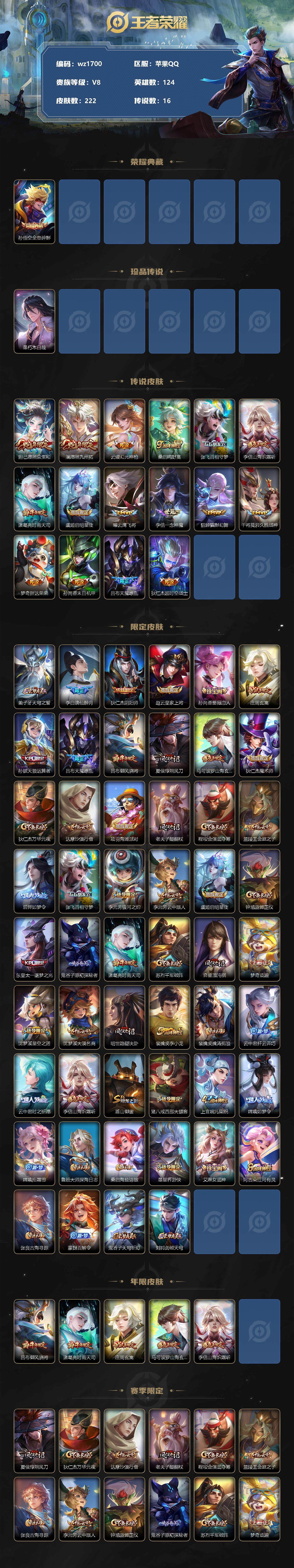 【游戏多多】【王者荣耀】【编号:3339291】【可二次实名】【wz1700】【商品标题】:苹果Q-V8-永恒钻石I段位-124英雄-222皮肤-1典藏-0珍品无双-0无双-1珍品传说-16传说-58史诗 【荣耀典藏】:孙悟空全息碎影 【珍品传说】:暃朽木白哉 【传说皮肤】:妲己愿照众生和,澜愿照九州拓,云缨幻光神枪,桑启鸣野蒿,张飞百相守梦,李信山海炽霜斩,诸葛亮时雨天司,虞姬启明星使,曜云鹰飞将,李信一念神魔,貂蝉猫影幻舞,干将莫邪久胜战神,梦奇胖达荣荣,孙尚香末日机甲,吕布天魔缭乱,狄仁杰超时空战士 【限定皮肤】:姜子牙天穹之誓,李白谪仙醉月,狄仁杰阴阳师,赵云皇家上将,孙尚香蔷薇恋人,庄周玄嵩,孙膑天狼运算者,吕布天魔缭乱,吕布御风骁将,夏侯惇朔风刀,马可波罗山海玄木吟,狄仁杰魔术师,狄仁杰万华元夜,达摩沙漠行僧,项羽海滩派对,老夫子醍醐杖,程咬金演武夺筹,兰陵王金庭之子,后羿如梦令,张飞百相守梦,李元芳银河之约,李元芳云中旅人,虞姬启明星使,钟馗驱傩正仪,东皇太一逐梦之光,鬼谷子原初探秘者,诸葛亮时雨天司,苏烈千军破阵,弈星混沌棋,梦奇顽趣,沈梦溪星空之诺,沈梦溪大漠名商,明世隐疑决卦,裴擒虎李小龙,裴擒虎擒涛扼浪,云中君纤云弄巧,云中君时之祈愿,李信山海炽霜斩,盾山御銮,猪八戒西部大镖客,上官婉儿梁祝,嫦娥如梦令,嫦娥拒霜思,鲁班大师探海日志,桑启海盐诗旅,暃星界游侠,艾琳女武神,阿古朵江河有灵,张良古海寻踪,蒙犽百解令,鬼谷子天穹祈灯,刘邦剑破天穹 【年限皮肤】:吕布御风骁将,诸葛亮时雨天司,庄周玄嵩,马可波罗山海玄木吟,李信山海炽霜斩 【赛季限定】:夏侯惇朔风刀,狄仁杰万华元夜,达摩沙漠行僧,老夫子醍醐杖,程咬金演武夺筹,兰陵王金庭之子,张良古海寻踪,李元芳云中旅人,钟馗驱傩正仪,鬼谷子原初探秘者,苏烈千军破阵,弈星混沌棋,梦奇顽趣,沈梦溪大漠名商,明世隐疑决卦,裴擒虎擒涛扼浪,盾山御銮,鲁班大师探海日志,桑启海盐诗旅,鬼谷子天穹祈灯,刘邦剑破天穹,姜子牙天穹之誓 【战令限定】:李元芳银河之约,沈梦溪星空之诺,猪八戒西部大镖客,暃星界游侠 【史诗皮肤】:鲁班七号电玩小子,露娜紫霞仙子,赵云皇家上将,赵云未来纪元,貂蝉圣诞恋歌,狄仁杰魔术师,廉颇地狱岩魂,宫本武藏鬼剑武藏,孙尚香蔷薇恋人,孙尚香水果甜心,嬴政暗夜贵公子,妲己魅力维加斯,妲己女仆咖啡,墨子金属风暴,吕布圣诞狂欢,曹操幽灵船长,李白千年之狐,张飞乱世虎臣,花木兰水晶猎龙者,刘邦德古拉伯爵,夏侯惇乘风破浪,小乔缤纷独角兽,诸葛亮黄金分割率,亚瑟心灵战警,雅典娜冰冠公主,安琪拉心灵骇客,铠曙光守护者,蔡文姬舞动绿茵,刘禅天才门将,程咬金功夫厨神,阿轲节奏热浪,东皇太一逐梦之光,孙策猫狗日记,伽罗箭羽风息,狄仁杰鹰眼统帅,上官婉儿梁祝,李元芳银河之约,庄周玄嵩,嫦娥如梦令,后羿如梦令,不知火舞魅语,橘右京修罗,裴擒虎李小龙,云中君纤云弄巧,孙膑天狼运算者,吕布御风骁将,沈梦溪月团寄思,钟馗乐园奇幻夜,嫦娥拒霜思,云中君时之祈愿,梦奇顽趣,暃星界游侠,马可波罗山海玄木吟,阿古朵江河有灵,蒙犽百解令,李白谪仙醉月,牛魔星界战将,孙膑茶境仙 【其他皮肤】:项羽海滩派对,韩信街头霸王,露娜哥特玫瑰,达摩大发明家,赵云忍炎影,芈月红桃皇后,艾琳女武神,程咬金星际陆战队,白起白色死神,扁鹊化身博士,扁鹊救世之瞳,孙膑天使之翼,妲己少女阿狸,典韦黄金武士,亚瑟死亡骑士,达摩拳王,花木兰兔女郎,张飞五福同心,甄姬花好人间,宫本武藏万象初新,后羿阿尔法小队,狄仁杰阴阳师,刘备纽约教父,刘备汉昭烈帝,关羽龙腾万里,钟无艳海滩丽影,宫本武藏霸王丸,狂铁命运角斗场,老夫子功夫老勺,牛魔制霸全明星,孙尚香沉稳之力,李白敏锐之力,鬼谷子幻乐之宴,苏烈坚韧之力,庄周奇妙博物学,吕布野性能量,盾山御銮,孙膑归虚梦演,沈梦溪鲨炮海盗猫,姜子牙炽热元素使,夏侯惇朔风刀,沈梦溪星空之诺,弈星混沌棋,哪吒次元突破,鲁班七号黑桃队长,明世隐疑决卦,盾山圆桌骑士,老夫子醍醐杖,猪八戒西部大镖客,鬼谷子原初探秘者,狄仁杰万华元夜,杨戬次元傲视,露娜瓷语鉴心,程咬金演武夺筹,张良缤纷绘卷,钟馗驱傩正仪,鲁班大师乓乓大师,苏烈千军破阵,达摩沙漠行僧,程咬金无双福将,刘邦虎啸剑宗,兰陵王金庭之子,米莱狄契约魔法,沈梦溪大漠名商,蒙犽胡桃狂想曲,蒙恬蔚蓝守将,李元芳云中旅人,桑启海盐诗旅,海月幻泉雾影,猪八戒潮玩探月行,牛魔牛运亨通,赵怀真太极少年,裴擒虎擒涛扼浪,太乙真人劲辣红锅,鲁班大师探海日志,李元芳妄想特派,张良古海寻踪,海月王牌新星,亚连破局者,鬼谷子天穹祈灯,朵莉亚金色潮汐,廉颇功夫炙烤,亚瑟鸿运当头,刘邦剑破天穹,大司命暗都幽影,貂蝉长夏之忆,姜子牙天穹之誓,苍苍林狼骑,太乙真人谧流熔炉,典韦铁骨偃魂,马超访茗客,姜子牙星梦巡礼,达摩爆裂喵拳,少司缘灵