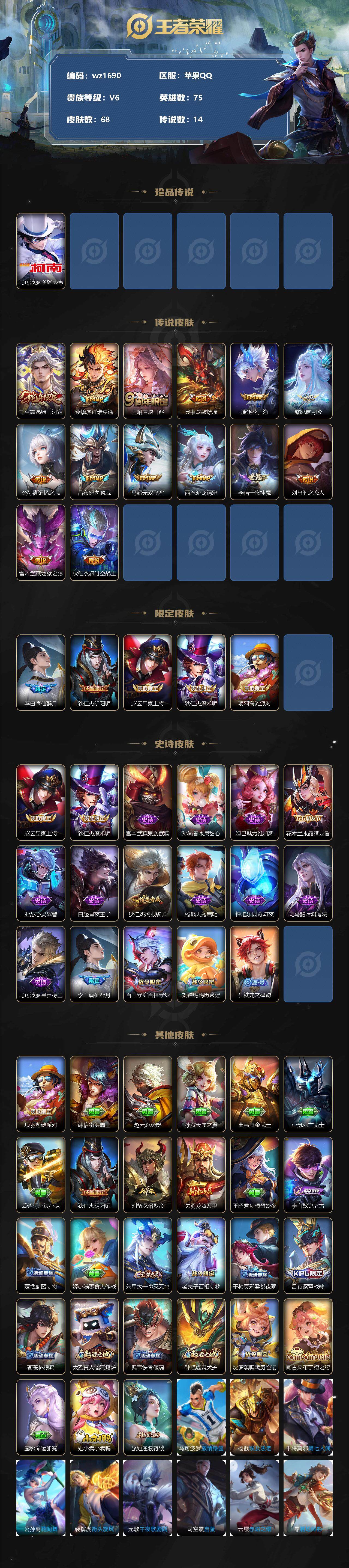 【游戏多多】【王者荣耀】【编号:3339299】【可二次实名】【wz1690】【商品标题】:苹果Q-V6-最强王者段位-75英雄-68皮肤-0典藏-0珍品无双-0无双-1珍品传说-14传说-17史诗 【珍品传说】:马可波罗怪盗基德 【传说皮肤】:司空震愿照山河定,裴擒虎祥瑞亨通,王昭君映山客,典韦战鼓燎原,澜逐花归海,露娜霜月吟,公孙离记忆之芯,吕布怒海麟威,马超无双飞将,西施游龙清影,李信一念神魔,刘备时之恋人,宫本武藏地狱之眼,狄仁杰超时空战士 【限定皮肤】:李白谪仙醉月,狄仁杰阴阳师,赵云皇家上将,狄仁杰魔术师,项羽海滩派对 【史诗皮肤】:赵云皇家上将,狄仁杰魔术师,宫本武藏鬼剑武藏,孙尚香水果甜心,妲己魅力维加斯,花木兰水晶猎龙者,亚瑟心灵战警,白起星夜王子,狄仁杰鹰眼统帅,杨戬天秀启明,钟馗乐园奇幻夜,司马懿暗渊魔法,马可波罗星界特工,李白谪仙醉月,百里守约百相守梦,刘禅鸭鸭历险记,狂铁龙之律动 【其他皮肤】:项羽海滩派对,韩信街头霸王,赵云忍炎影,孙膑天使之翼,典韦黄金武士,亚瑟死亡骑士,后羿阿尔法小队,狄仁杰阴阳师,刘备汉昭烈帝,关羽龙腾万里,王昭君幻想奇妙夜,李白敏锐之力,蒙恬蔚蓝守将,姬小满零食大作战,东皇太一噬灭天穹,老夫子百相守梦,干将莫邪雾都夜雨,吕布逐霄战戟,苍苍林狼骑,太乙真人谧流熔炉,典韦铁骨偃魂,钟馗虚灵犬护,沈梦溪鸭鸭历险记,阿古朵布丁狗之约,露娜命运加冕,姬小满小满鸭,甄姬逆浪荇歌,马可波罗激情绿茵,杨戬埃及法老,干将莫邪第七人偶,公孙离花间舞,裴擒虎街头旋风,元歌午夜歌剧院,司空震启蛰,云缨赤焰之缨,暃碧珀绯影 【营地ID】:1624166705