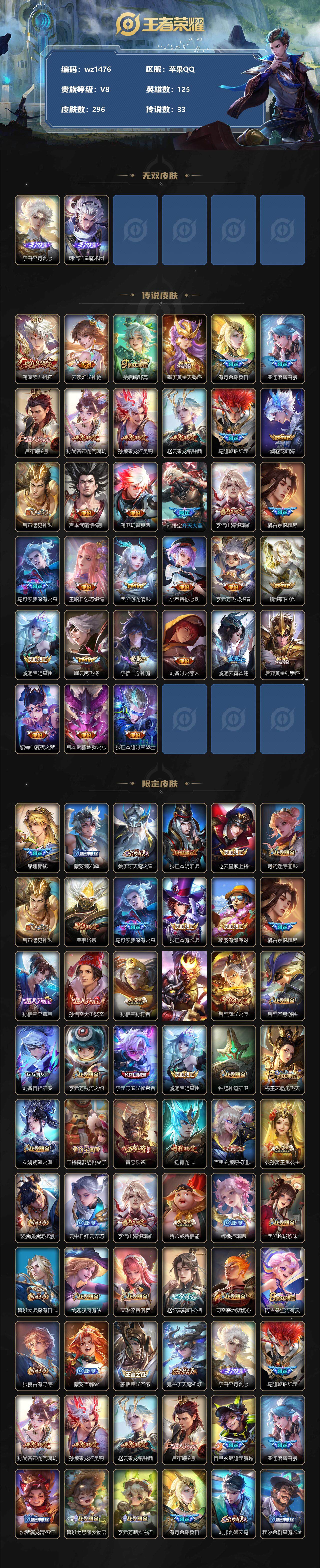 【游戏多多】【王者荣耀】【编号:3339457】【可二次实名】【wz1476】【商品标题】:苹果Q-V8-最强王者段位-125英雄-296皮肤-0典藏-0珍品无双-2无双-0珍品传说-33传说-75史诗 【无双皮肤】:李白碎月剑心,韩信群星魔术团 【传说皮肤】:澜愿照九州拓,云缨幻光神枪,桑启鸣野蒿,墨子黄金天蝎座,海月金乌负日,亚连落雪白狼,吕布曦玄引,孙尚香乘龙问璇玑,孙策乘龙淬吴钩,赵云乘龙铭钟鼎,马超琥珀纪元,澜逐花归海,吕布遇见神鼓,宫本武藏惊梅引,澜电玩雷克斯,孙悟空齐天大圣,李信山海炽霜斩,橘右京枫霜尽,马可波罗深海之息,王昭君乞巧织情,西施游龙清影,小乔音你心动,李元芳飞鸢探春,镜炽阳神光,虞姬启明星使,曜云鹰飞将,李信一念神魔,刘备时之恋人,虞姬云霓雀翎,后羿黄金射手座,貂蝉仲夏夜之梦,宫本武藏地狱之眼,狄仁杰超时空战士 【限定皮肤】:暃埋骨钱,蒙犽顽岩魄,姜子牙天穹之誓,狄仁杰阴阳师,赵云皇家上将,阿轲迷踪丽影,吕布遇见神鼓,典韦岱宗,马可波罗深海之息,狄仁杰魔术师,项羽海滩派对,橘右京枫霜尽,孙悟空至尊宝,孙悟空大圣娶亲,孙悟空孙行者,孙悟空齐天大圣,后羿辉光之辰,后羿圣弓游侠,刘备百相守梦,李元芳银河之约,李元芳匿光侦查者,虞姬启明星使,钟馗神迹守卫,杨玉环遇见飞天,女娲朔望之晖,干将莫邪胡桃夹子,黄忠烈魂,铠青龙志,百里玄策原初追逐者,公孙离玉兔公主,裴擒虎擒涛扼浪,云中君纤云弄巧,李信山海炽霜斩,猪八戒猪悟能,嫦娥拒霜思,西施玲珑珍味,鲁班大师探海日志,戈娅驭风魔法,艾琳流音漫舞,赵怀真鹤归松栖,司空震地狱燃心,阿古朵江河有灵,张良古海寻踪,蒙犽百解令,蒙恬荣光圣徽,鬼谷子天穹祈灯,李白碎月剑心,马超琥珀纪元,孙尚香乘龙问璇玑,孙策乘龙淬吴钩,赵云乘龙铭钟鼎,吕布曦玄引,百里玄策超元猎域,亚连落雪白狼,沈梦溪龙舞盛年,鲁班七号蔬乡物语,李元芳蔬乡物语,海月金乌负日,刘邦剑破天穹,程咬金群星魔术团,韩信群星魔术团,镜青焰无极,项羽苍威无极,刘备异域游侠,周瑜熔金海岸 【年限皮肤】:铠青龙志,后羿辉光之辰,典韦岱宗,黄忠烈魂,李信山海炽霜斩,孙尚香乘龙问璇玑,孙策乘龙淬吴钩,赵云乘龙铭钟鼎 【赛季限定】:张良古海寻踪,百里玄策原初追逐者,裴擒虎擒涛扼浪,鲁班大师探海日志,鬼谷子天穹祈灯,蒙恬荣光圣徽,刘邦剑破天穹,姜子牙天穹之誓 【战令限定】:阿轲迷踪丽影,艾琳流音漫舞,后羿圣弓游侠,李元芳银河之约,钟馗神迹守卫,女娲朔望之晖,西施玲珑珍味,司空震地狱燃心,戈娅驭风魔法,鲁班七号蔬乡物语,李元芳蔬乡物语,镜青焰无极,项羽苍威无极 【史诗皮肤】:露娜紫霞仙子,赵云皇家上将,赵云未来纪元,貂蝉圣诞恋歌,甄姬冰雪圆舞曲,狄仁杰魔术师,廉颇地狱岩魂,宫本武藏鬼剑武藏,孙尚香水果甜心,嬴政暗夜贵公子,嬴政摇滚巨星,妲己魅力维加斯,妲己女仆咖啡,墨子金属风暴,刘禅绅士熊喵,曹操幽灵船长,李白千年之狐,吕布末日机甲,孙悟空至尊宝,花木兰水晶猎龙者,刘邦德古拉伯爵,夏侯惇乘风破浪,兰陵王暗隐猎兽者,诸葛亮黄金分割率,亚瑟心灵战警,雅典娜冰冠公主,安琪拉心灵骇客,后羿辉光之辰,百里守约特工魅影,李元芳逐浪之夏,程咬金功夫厨神,白起星夜王子,阿轲节奏热浪,杨玉环遇见飞天,大乔猫狗日记,铠青龙志,孙悟空大圣娶亲,狄仁杰鹰眼统帅,李元芳银河之约,典韦岱宗,阿轲迷踪丽影,橘右京修罗,瑶遇见神鹿,黄忠烈魂,孙尚香时之恋人,百里玄策原初追逐者,云中君纤云弄巧,沈梦溪月团寄思,孙悟空孙行者,猪八戒猪悟能,嫦娥拒霜思,公孙离玉兔公主,弈星滕王阁序,刘备百相守梦,蔡文姬电玩兔顽号,刘禅电玩爆裂旋风,戈娅驭风魔法,赵怀真鹤归松栖,李元芳匿光侦查者,司空震地狱燃心,阿古朵江河有灵,蒙犽百解令,蒙恬荣光圣徽,百里玄策超元猎域,鲁班七号蔬乡物语,镜青焰无极,蒙犽顽岩魄,暃埋骨钱,大司命东方月初,亚连破空之剑,百里守约百相守梦,牛魔星界战将,赵怀真器灵浮梦炉,狂铁龙之律动,后羿石田雨龙 【其他皮肤】:项羽海滩派对,韩信街头霸王,露娜哥特玫瑰,阿轲爱心护理,达摩大发明家,赵云白执事,赵云忍炎影,芈月红桃皇后,白起白色死神,牛魔西部大镖客,扁鹊化身博士,扁鹊救世之瞳,庄周鲤鱼之梦,宫本武藏未来纪元,安琪拉玩偶对对碰,孙膑天使之翼,姜子牙时尚教父,典韦黄金武士,亚瑟死亡骑士,达摩拳王,花木兰兔女郎,张飞五福同心,甄姬花好人间,刘备万事如意,宫本武藏万象初新,后羿阿尔法小队,狄仁杰阴阳师,刘备纽约教父,刘备汉昭烈帝,关羽龙腾万里,钟无艳海滩丽影,狂铁命运角斗场,老夫子功夫老勺,诸葛亮掌控之力,李白敏锐之力,鬼谷子幻乐之宴,苏烈坚韧之力,明世隐虹云星官,女娲朔望之晖,小乔丁香结,吕布野性能量,钟馗神迹守卫,沈梦溪鲨炮海盗猫,姜子牙炽热元素使,哪吒次元突破,鲁班七号黑桃队长,狂铁特工战影,杨戬次元傲视,露娜瓷语鉴心,
